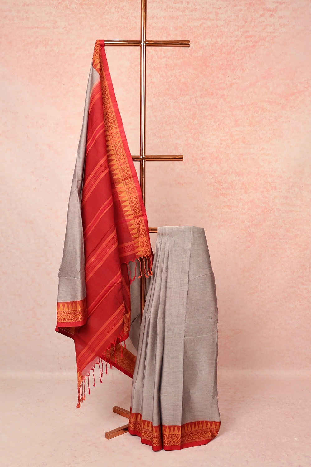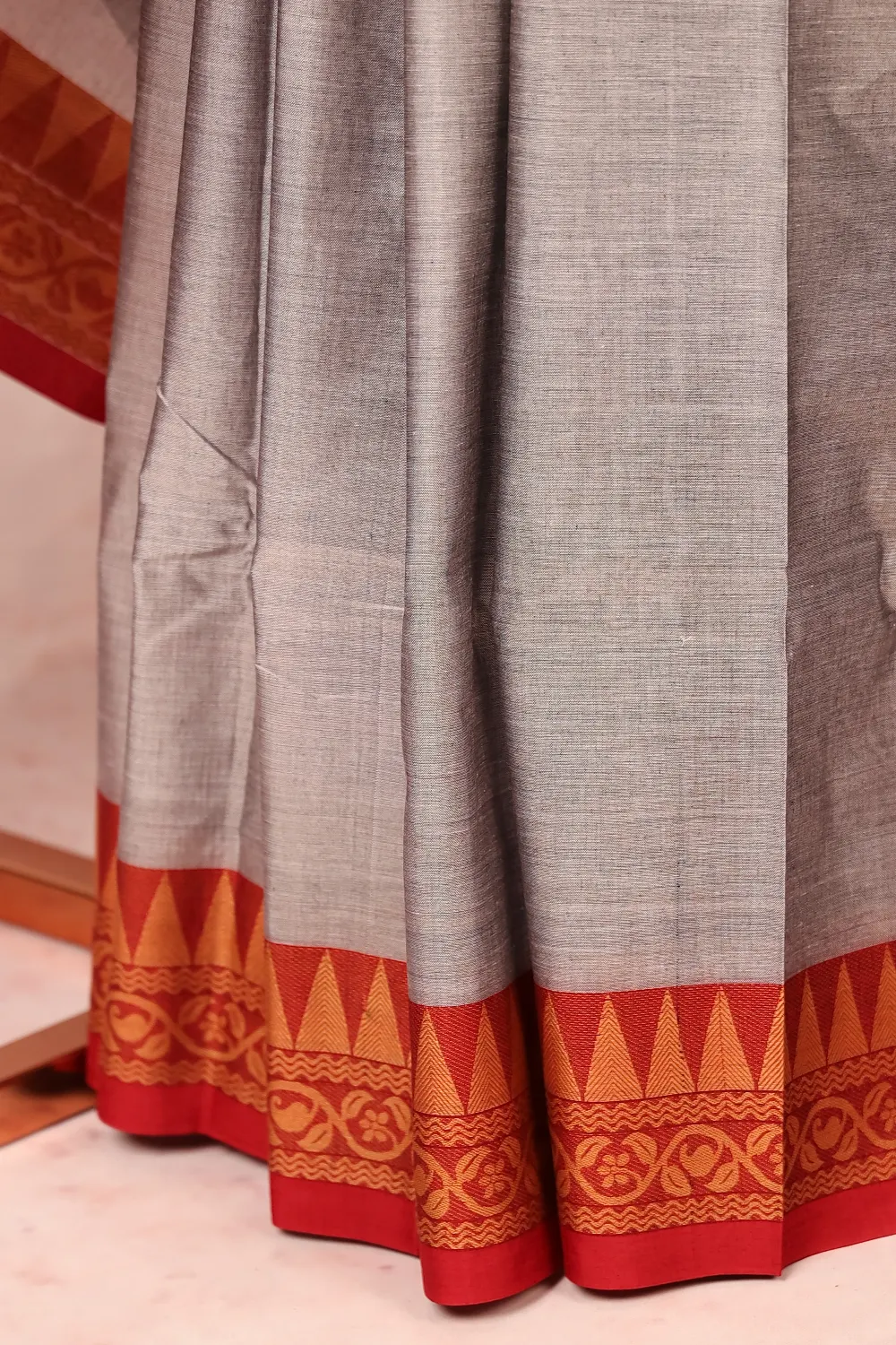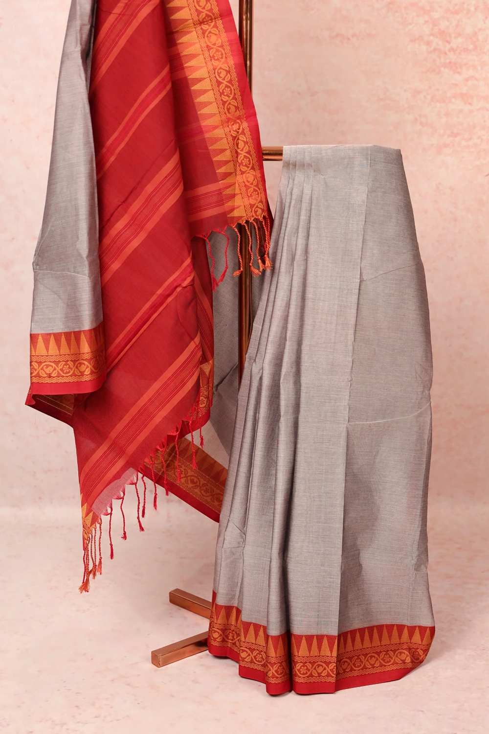 Ash Grey Cotton Plain Body Saree with Temple border. Includes Unstitched Blouse