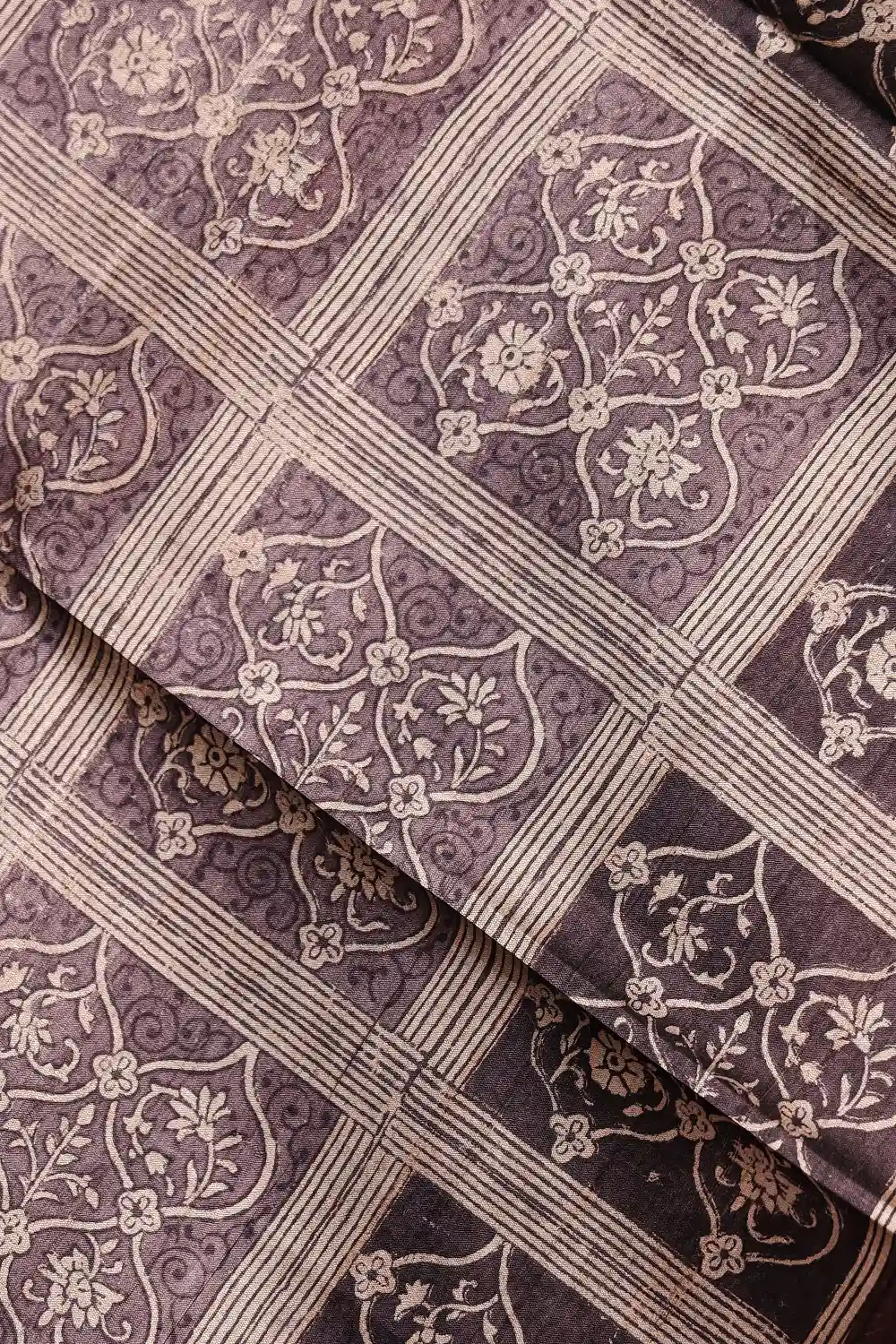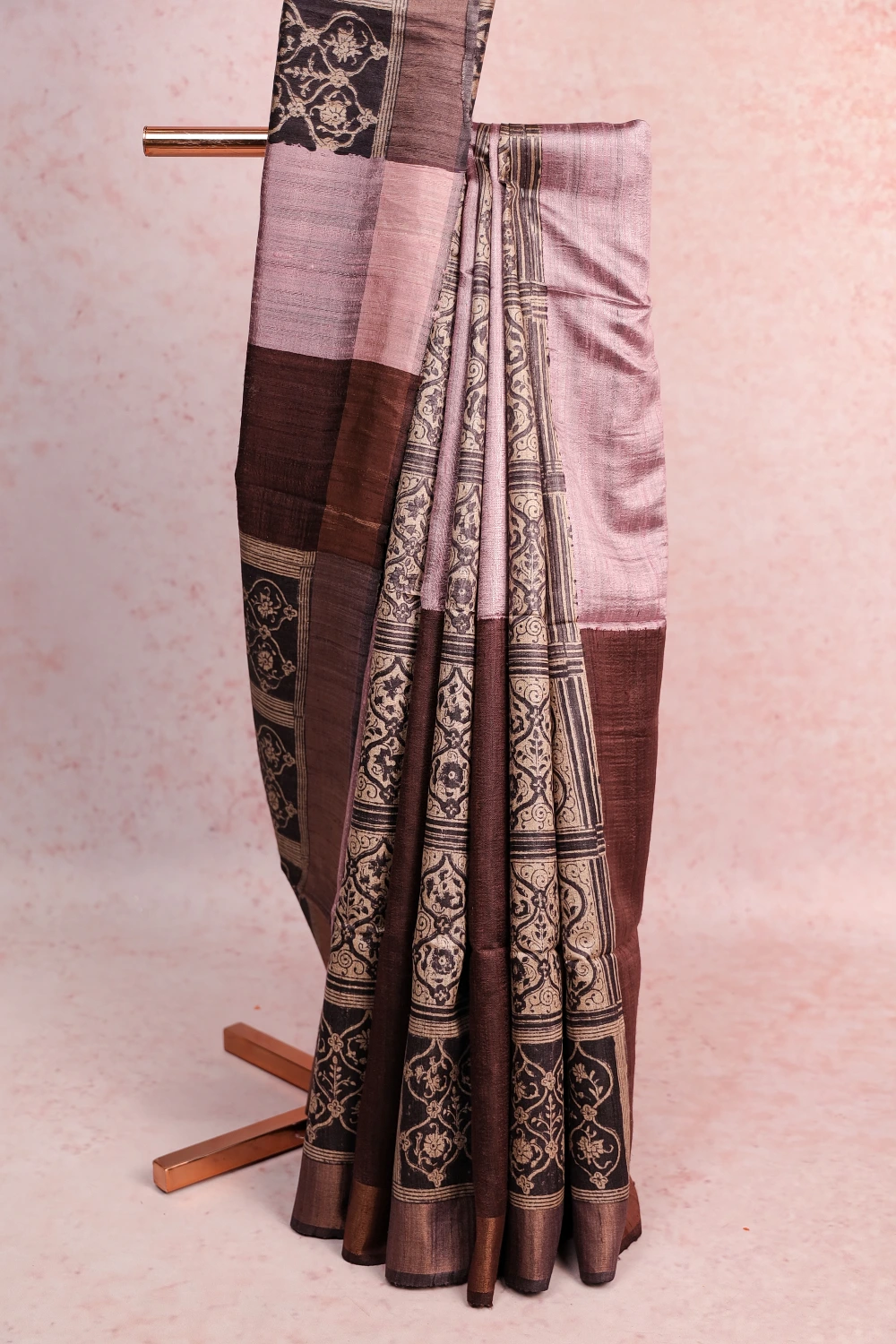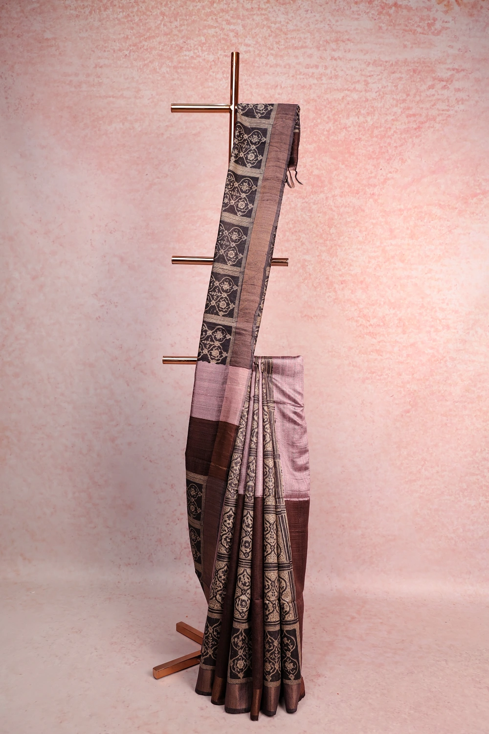 Ash Lavender Jute Silk Printed Saree with Plain Border. Includes Unstitched Blouse