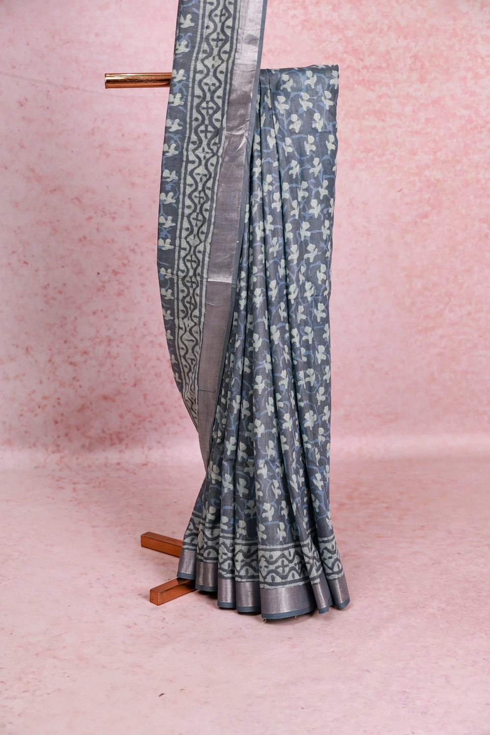 Ash Semi Linen Printed Saree With Zari Border. Includes Unstitched Blouse