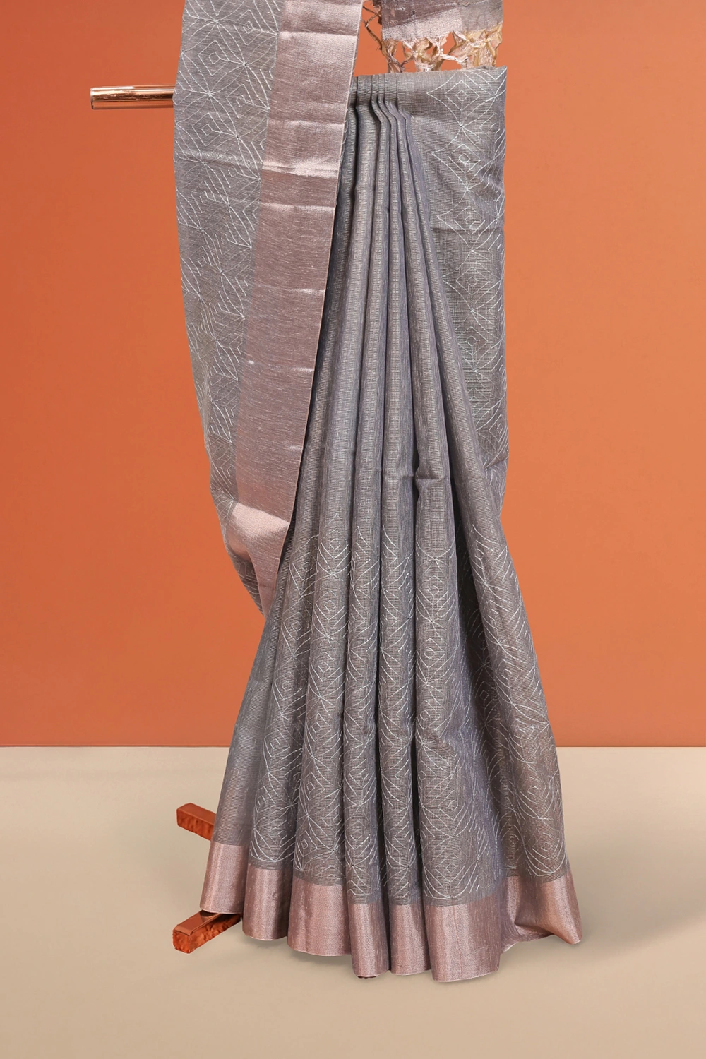 Ash Semi Tissue Embroidary Saree with Plain Border. Includes Unstitched Blouse
