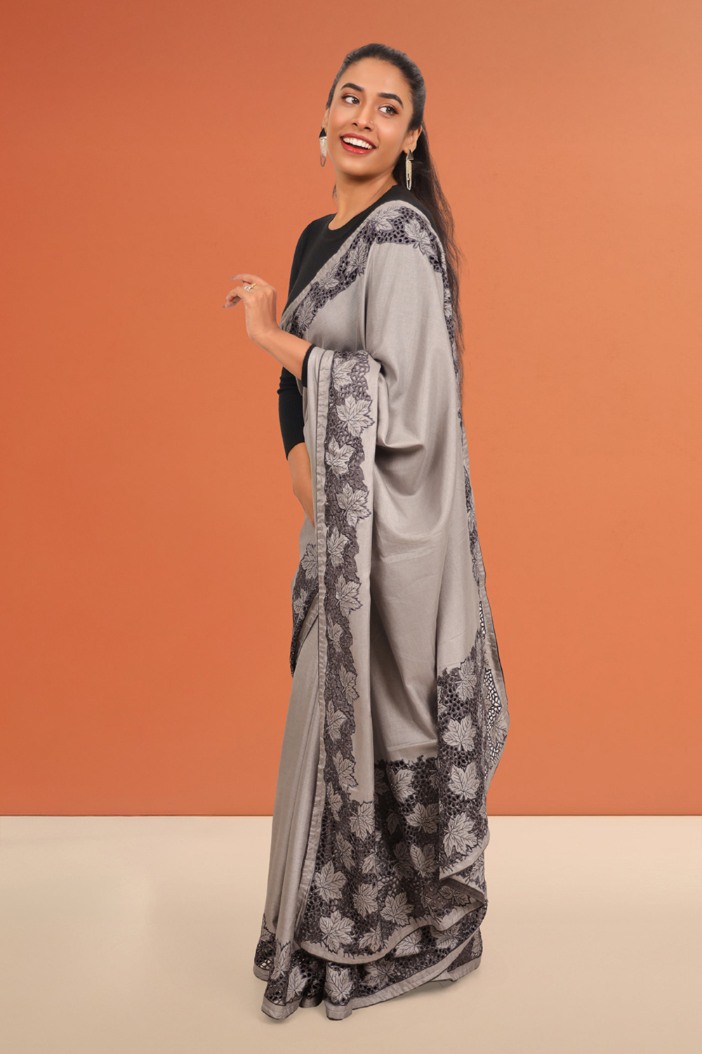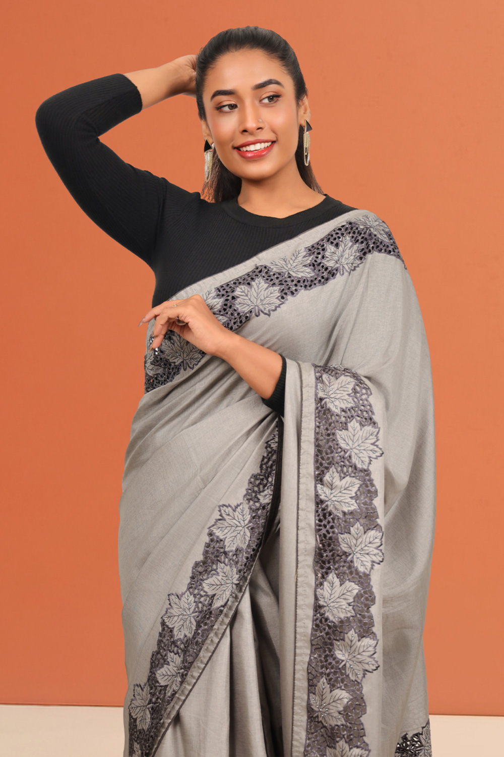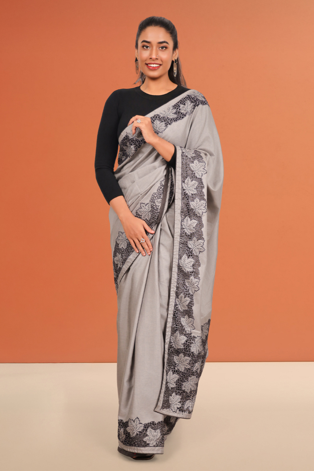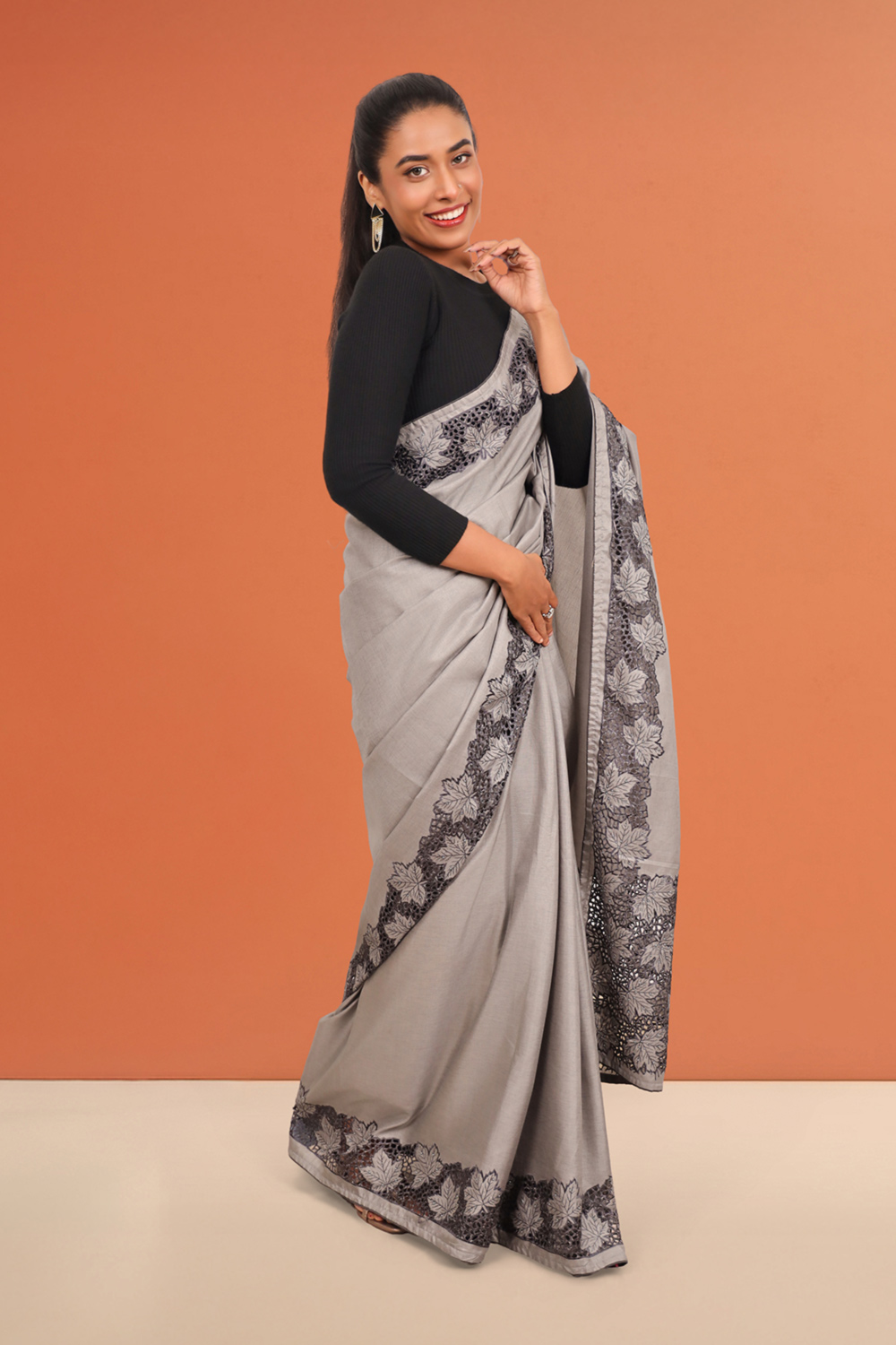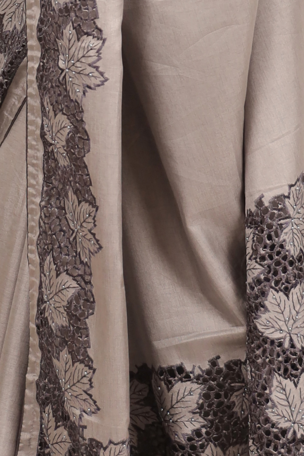 Ash Semi Tussar Plain Body Saree with Cutt Work border. Inclues Unstitched Blouse