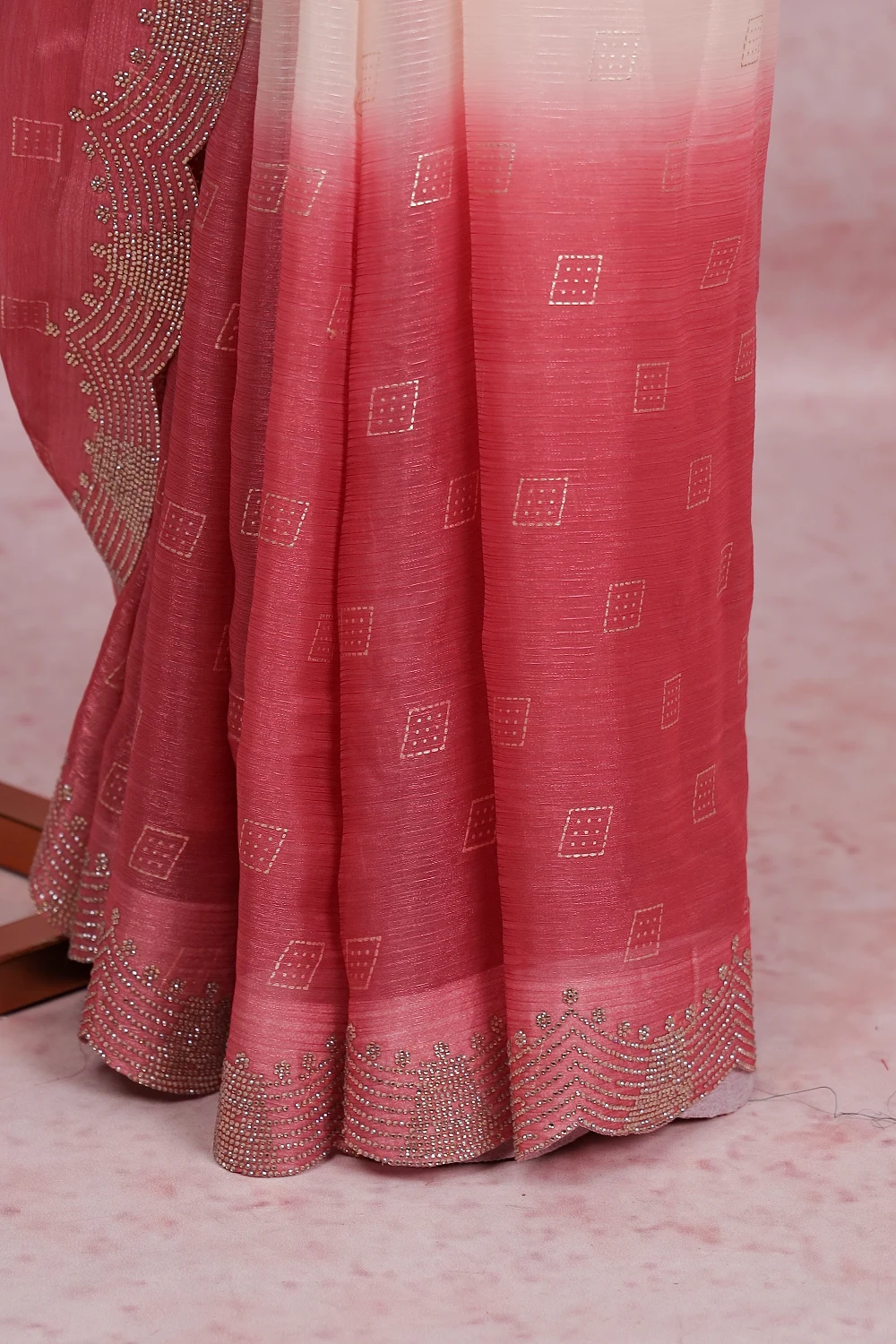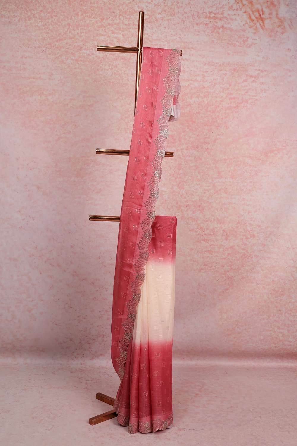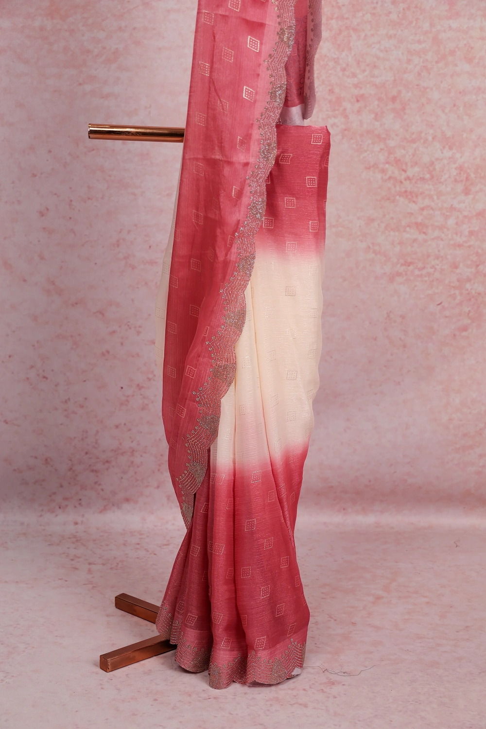 Beige Pink Organza Printed Saree With Scallop Border. Includes Un Stitched Blouse
