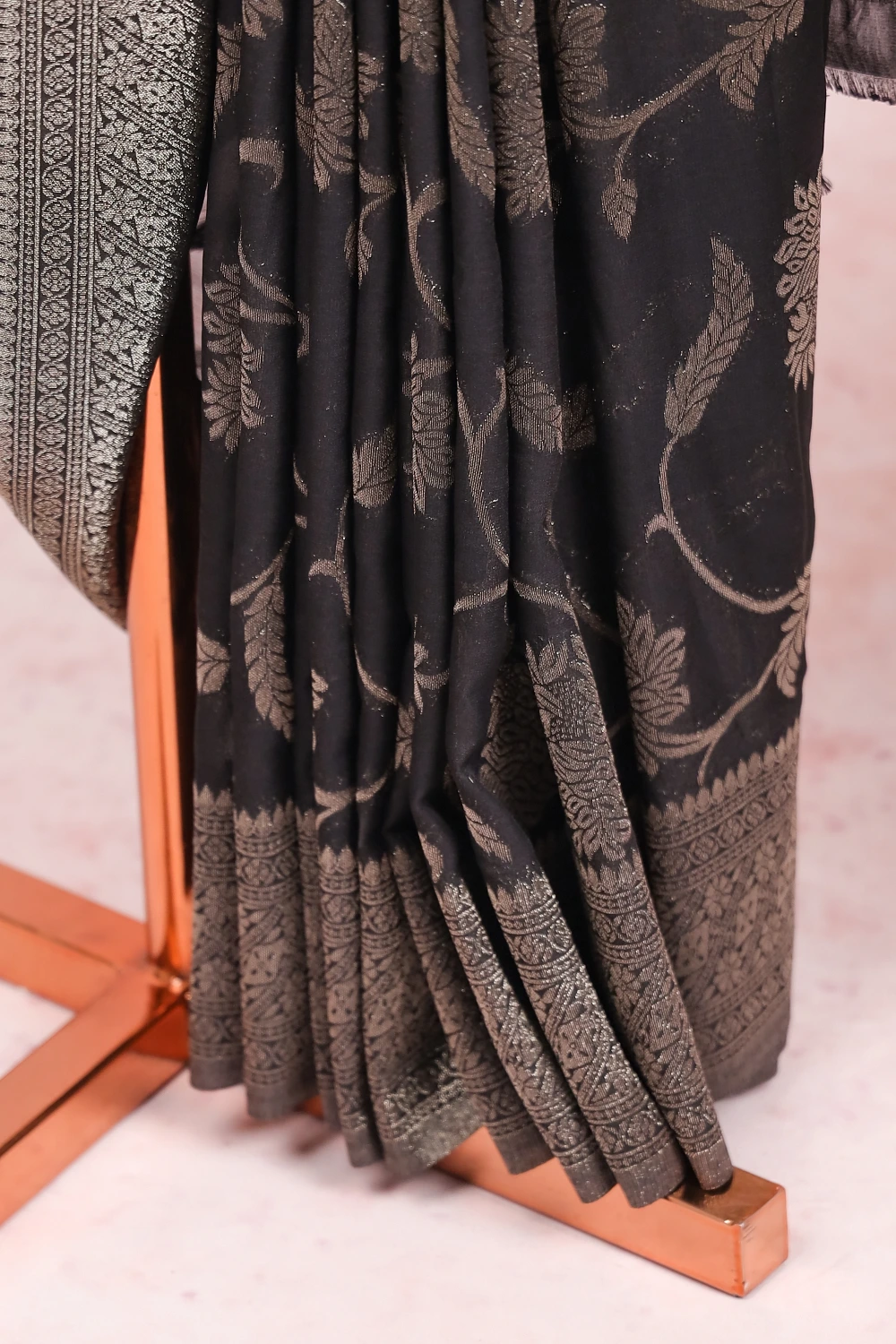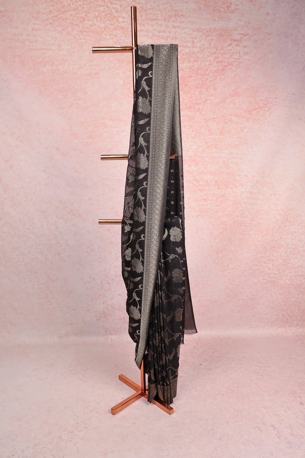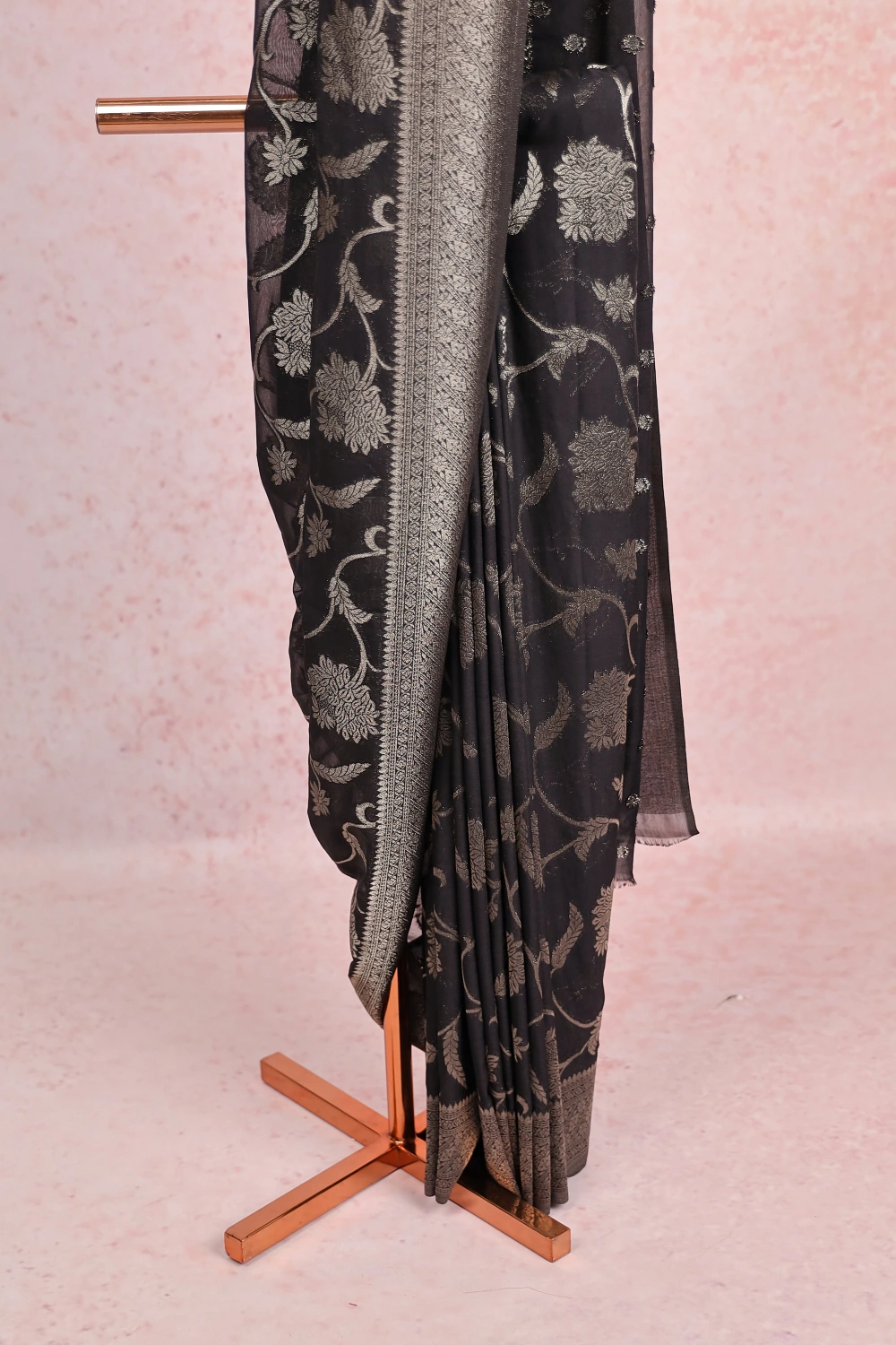 Black Banarasi Georgette Designer Body Saree with Designer Border. Includes Unstitched Blouse