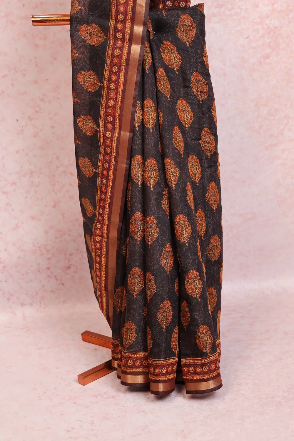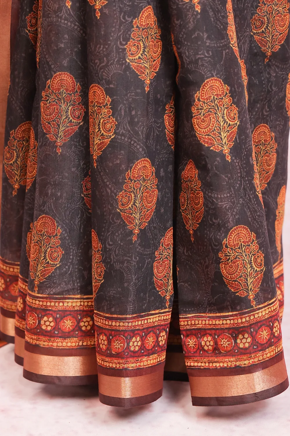 Black Chanderi Cotton Printed Saree with Printed Border. Includes Unstitched Blouse