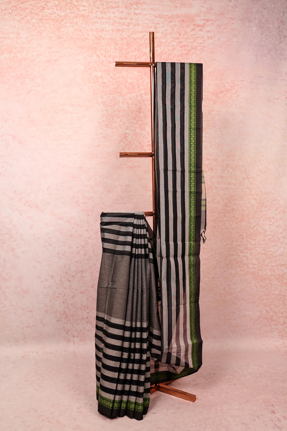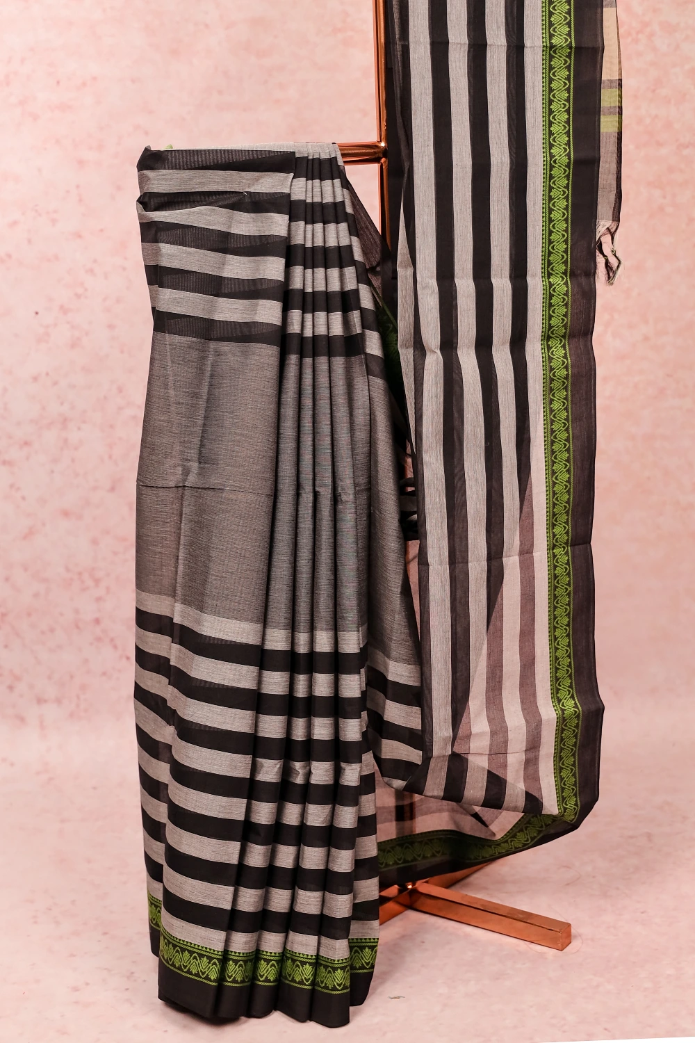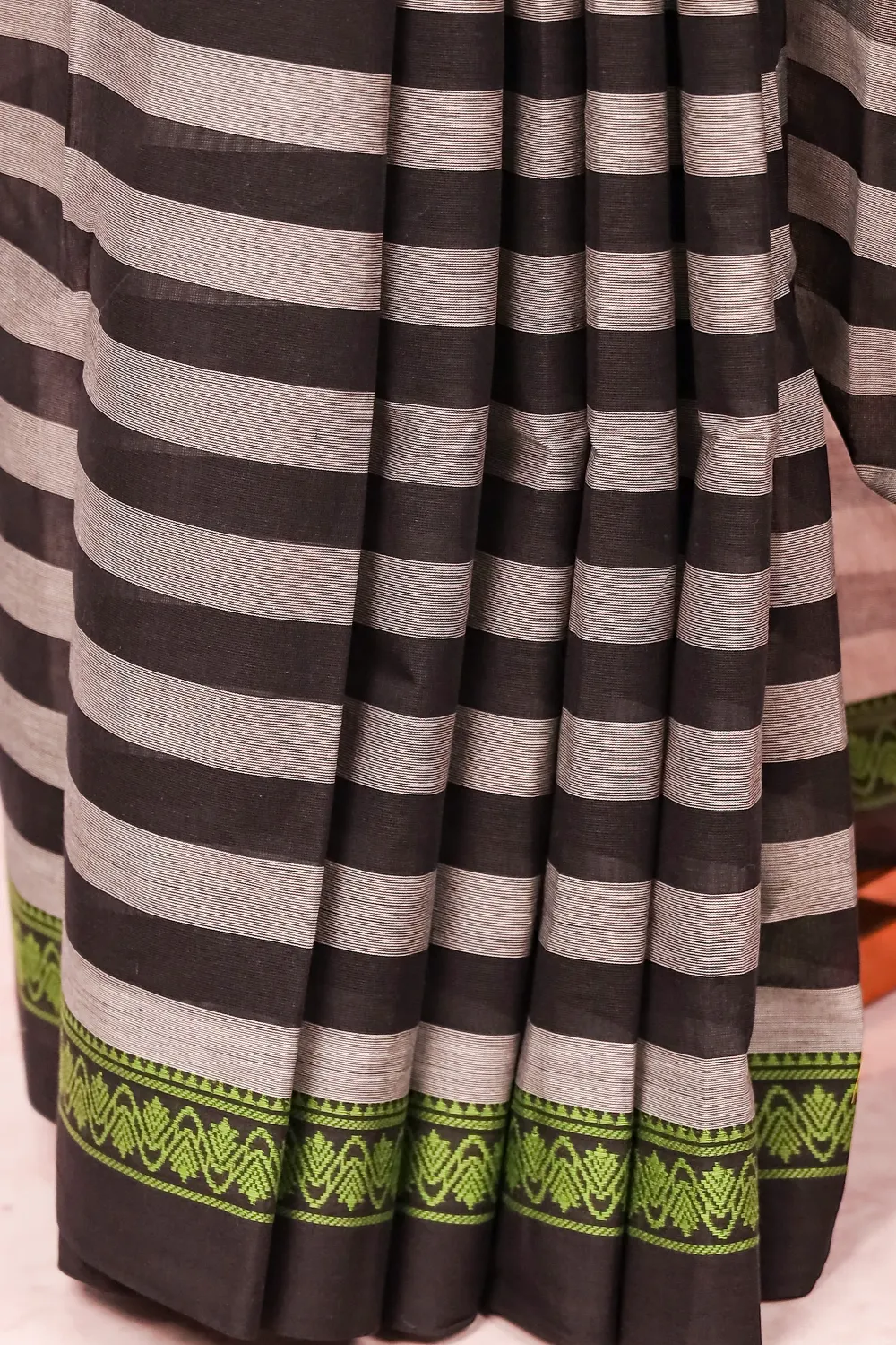 Black Cotton Lines Saree with Thread Border. Unstiched Blouse Piece