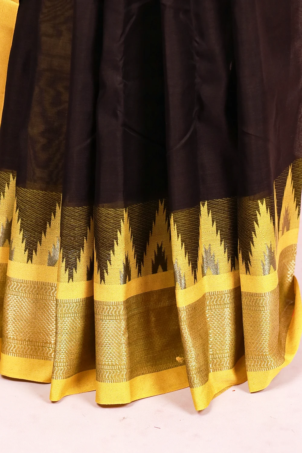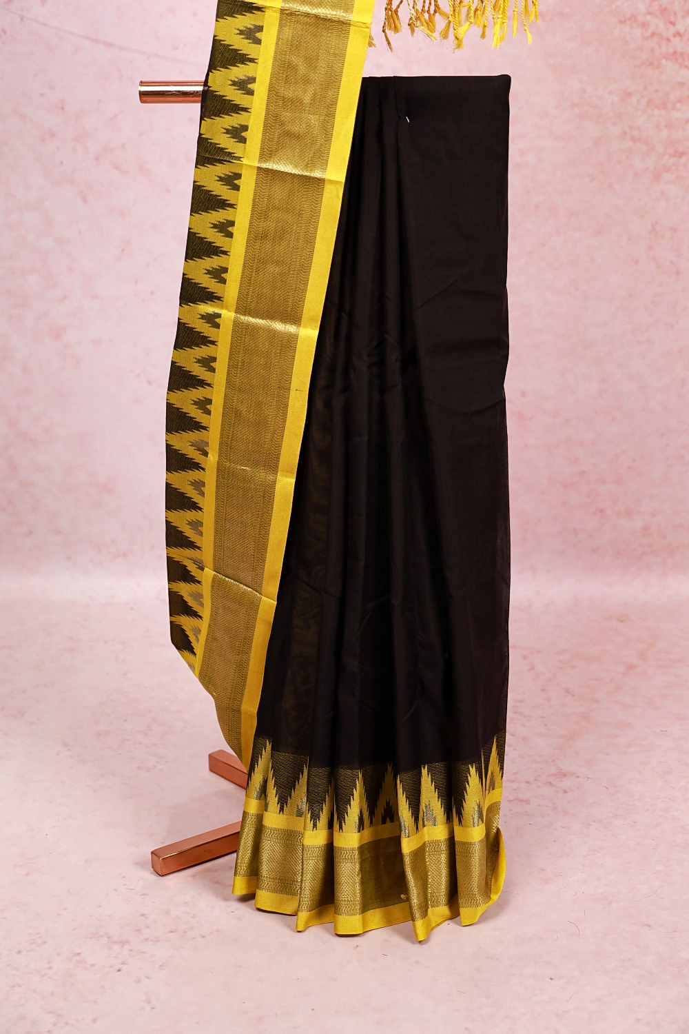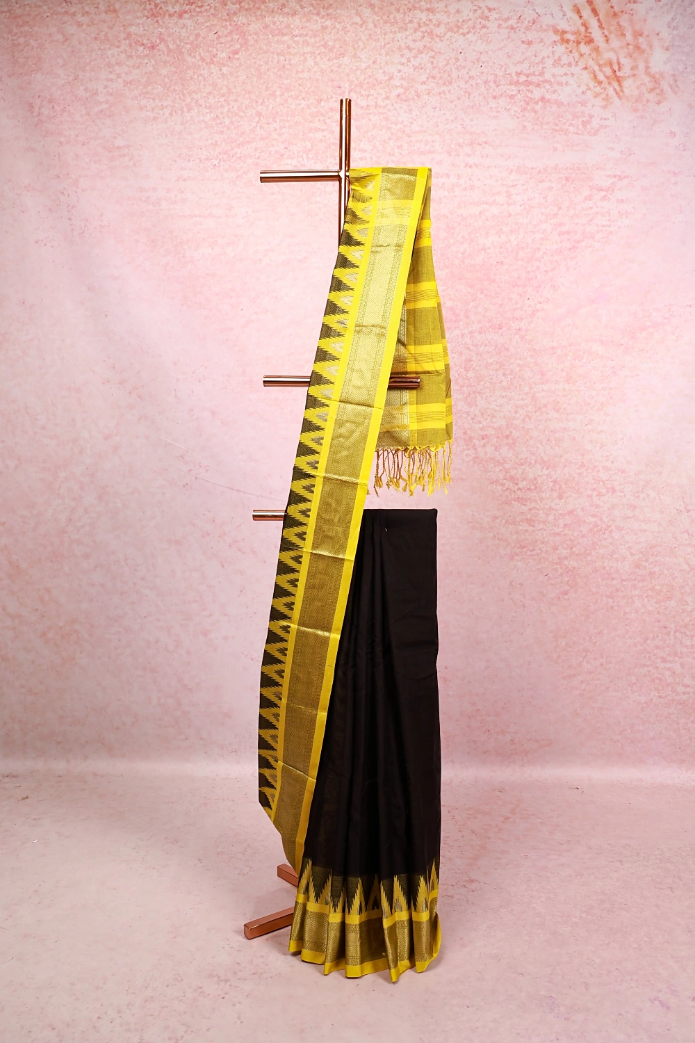 Black Cotton Silk Plain Body Saree With Zari Border. Includes Unstitched Blouse