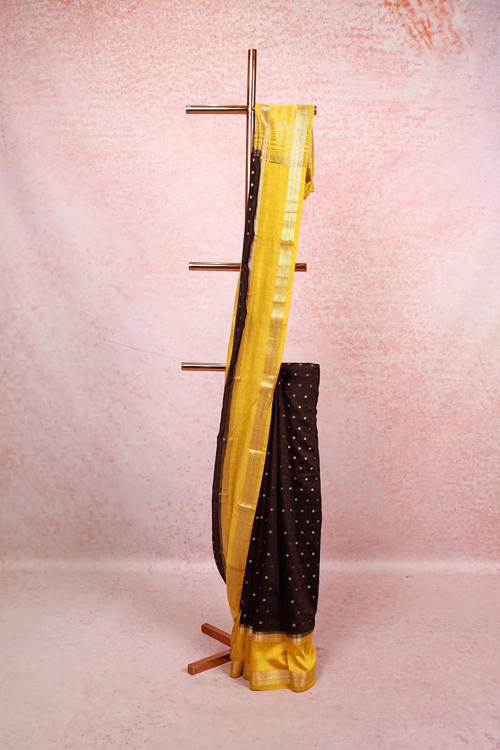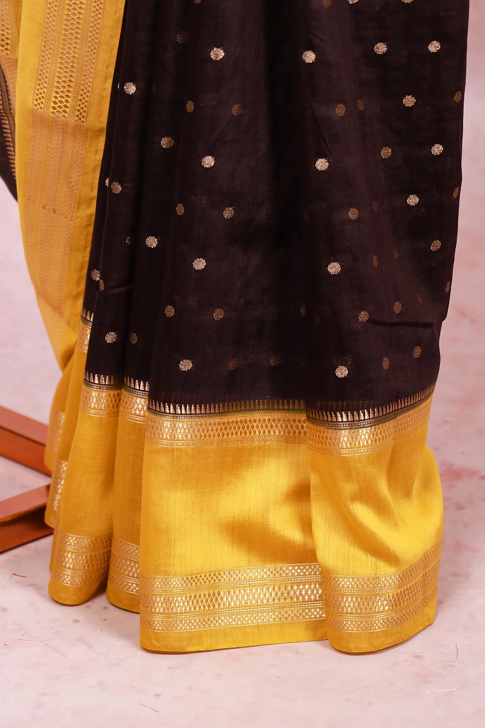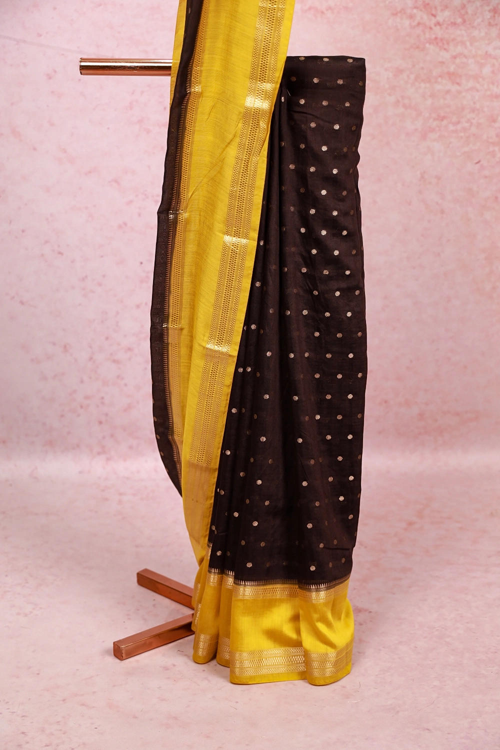 Black Crepe Butta Saree With Zari Border. Includes Unstitched Blouse