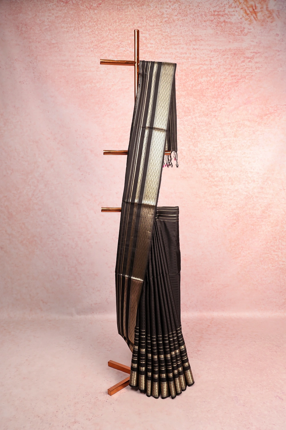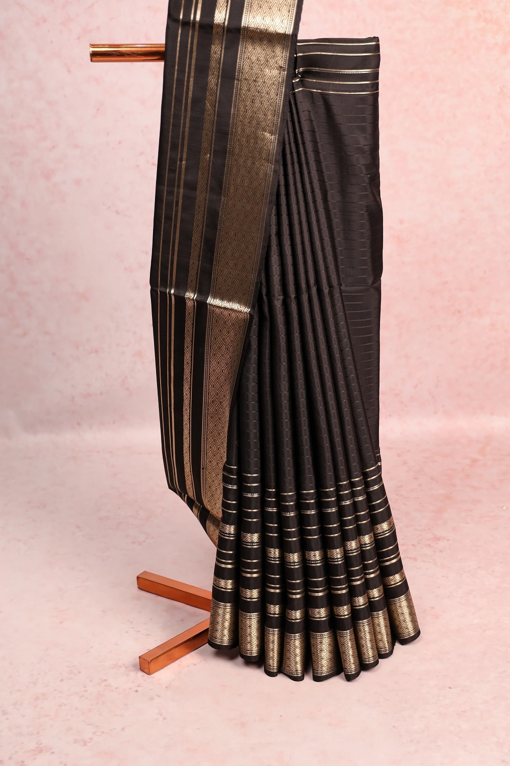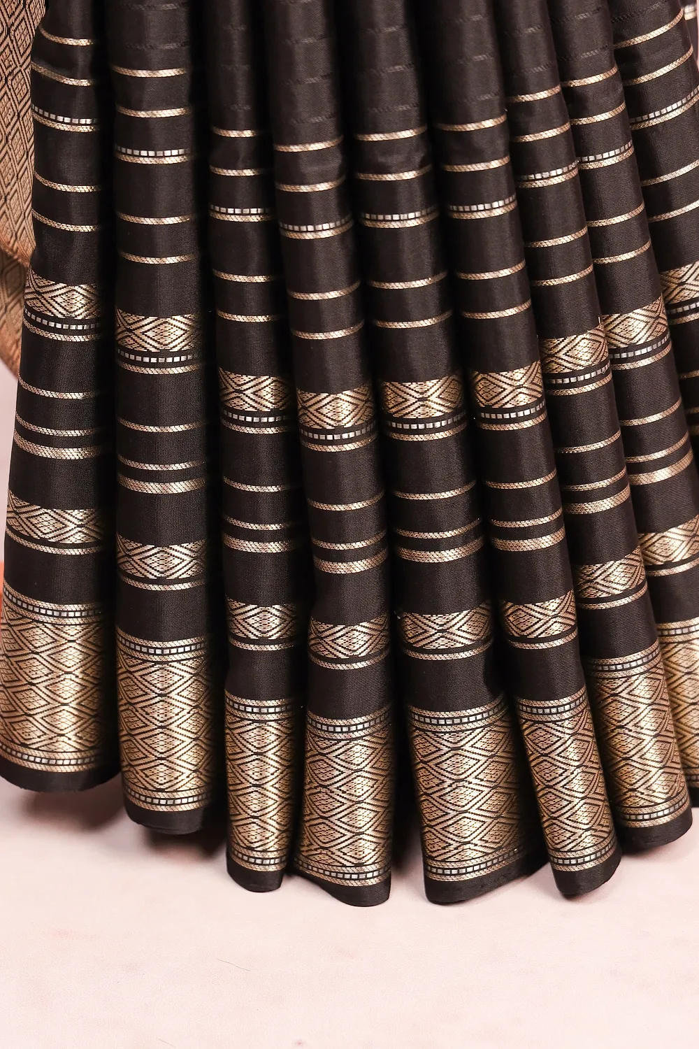 Black Kancheepuram Soft Silk Lines Saree with Designer Border. Includes Un stitched Blouse