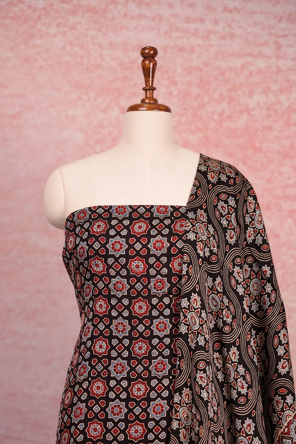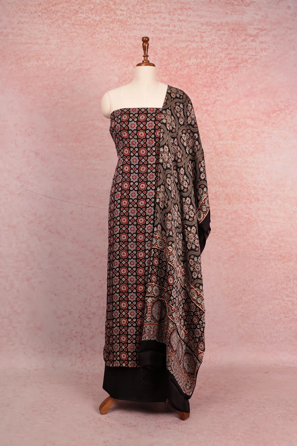 Black Modal Ajrakh Unstitched Churidar Material. Includes Dupatta.