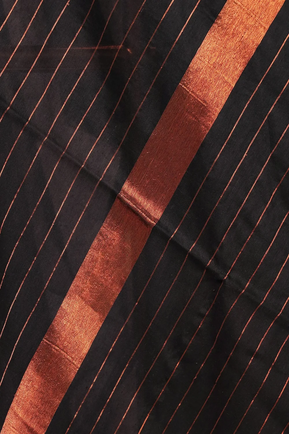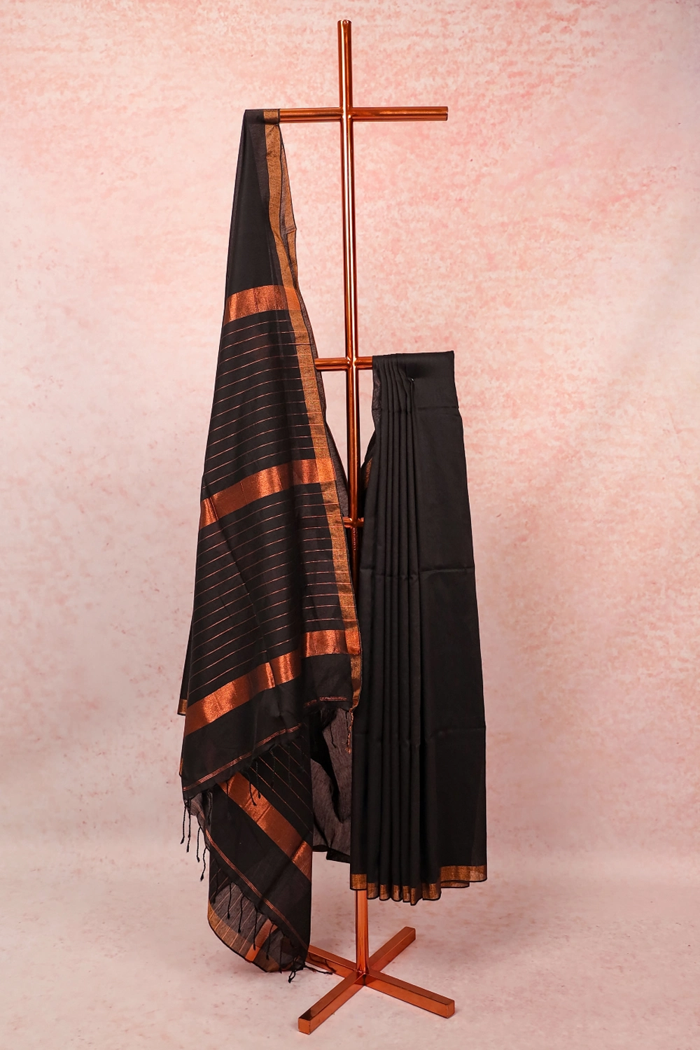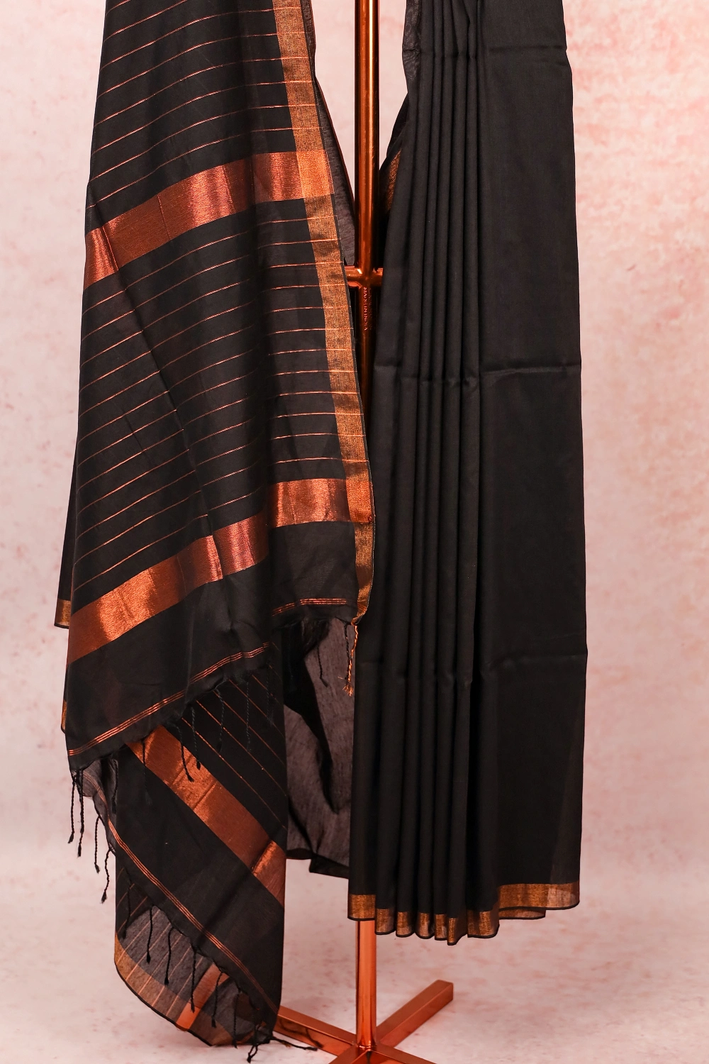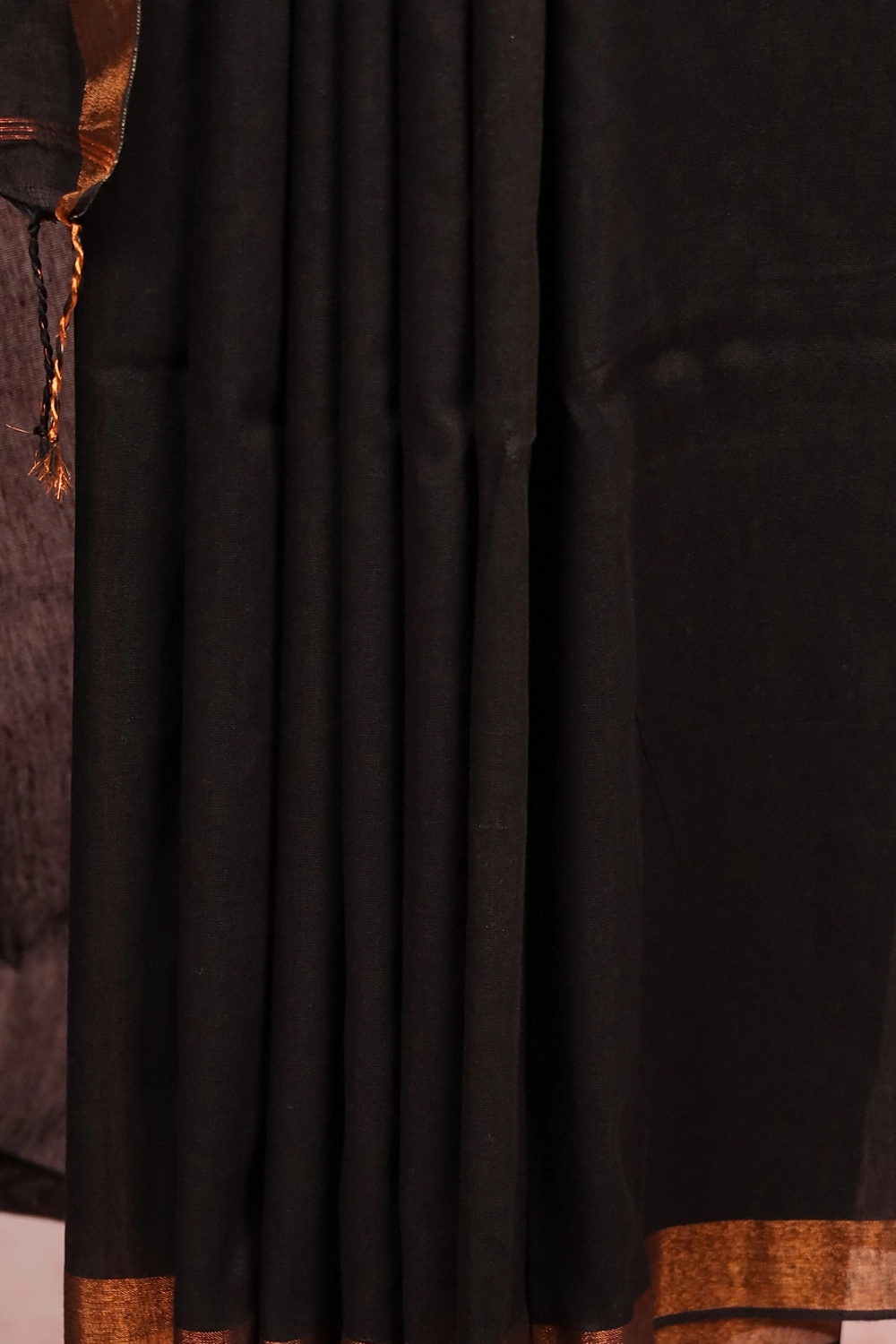 Black Mul Cotton Plain Body Saree with Copper Border. Includes Unstitched Blouse