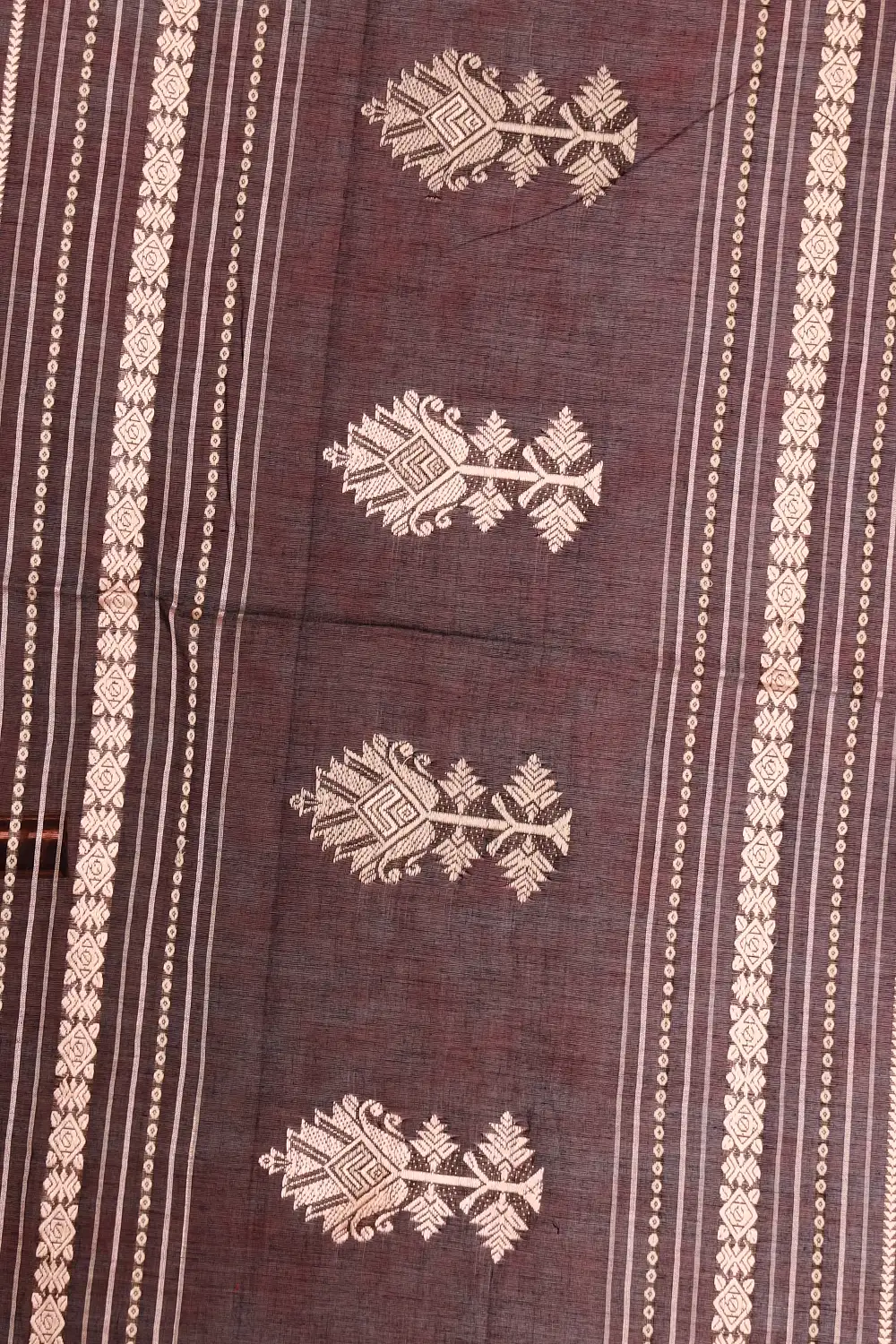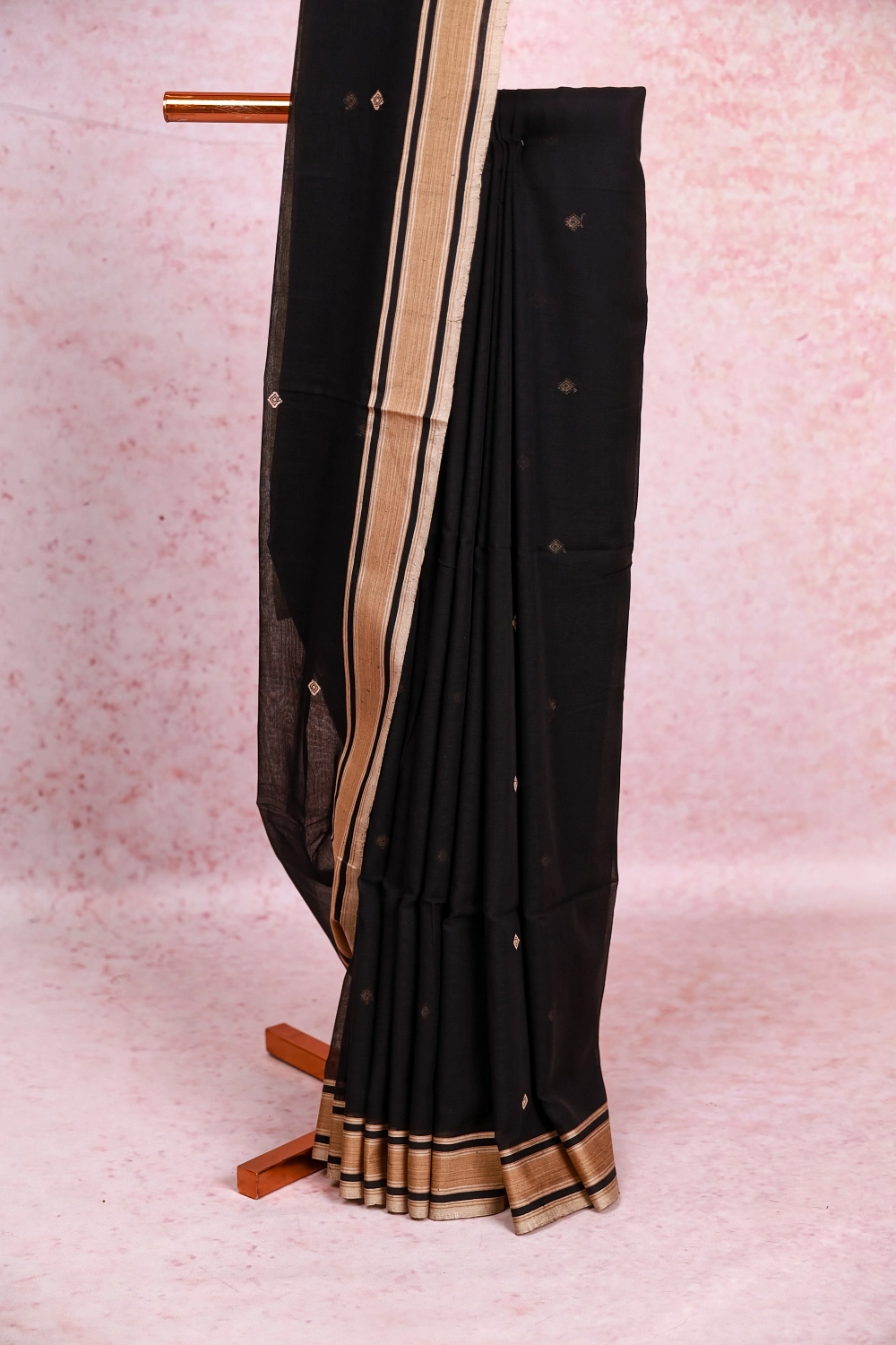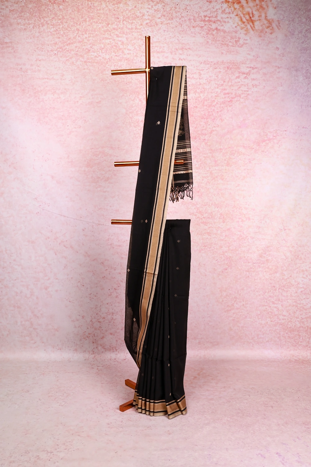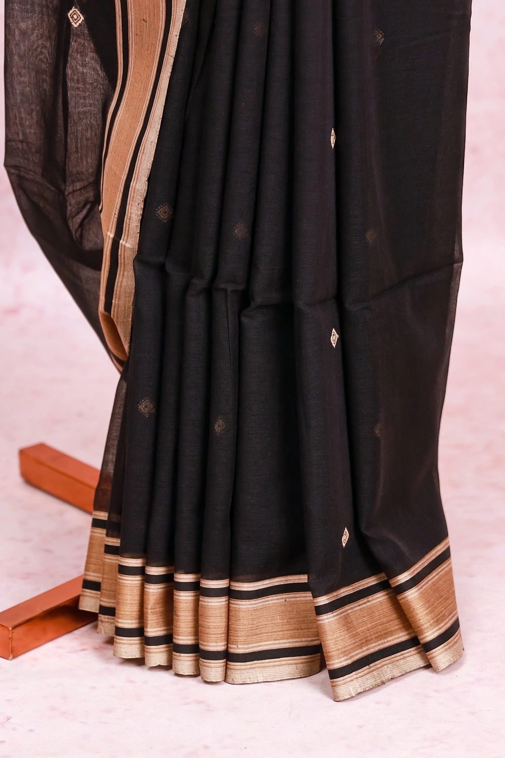 Black Mul Cotton Small Butta Saree With Line Border. Includes Unstitched Blouse