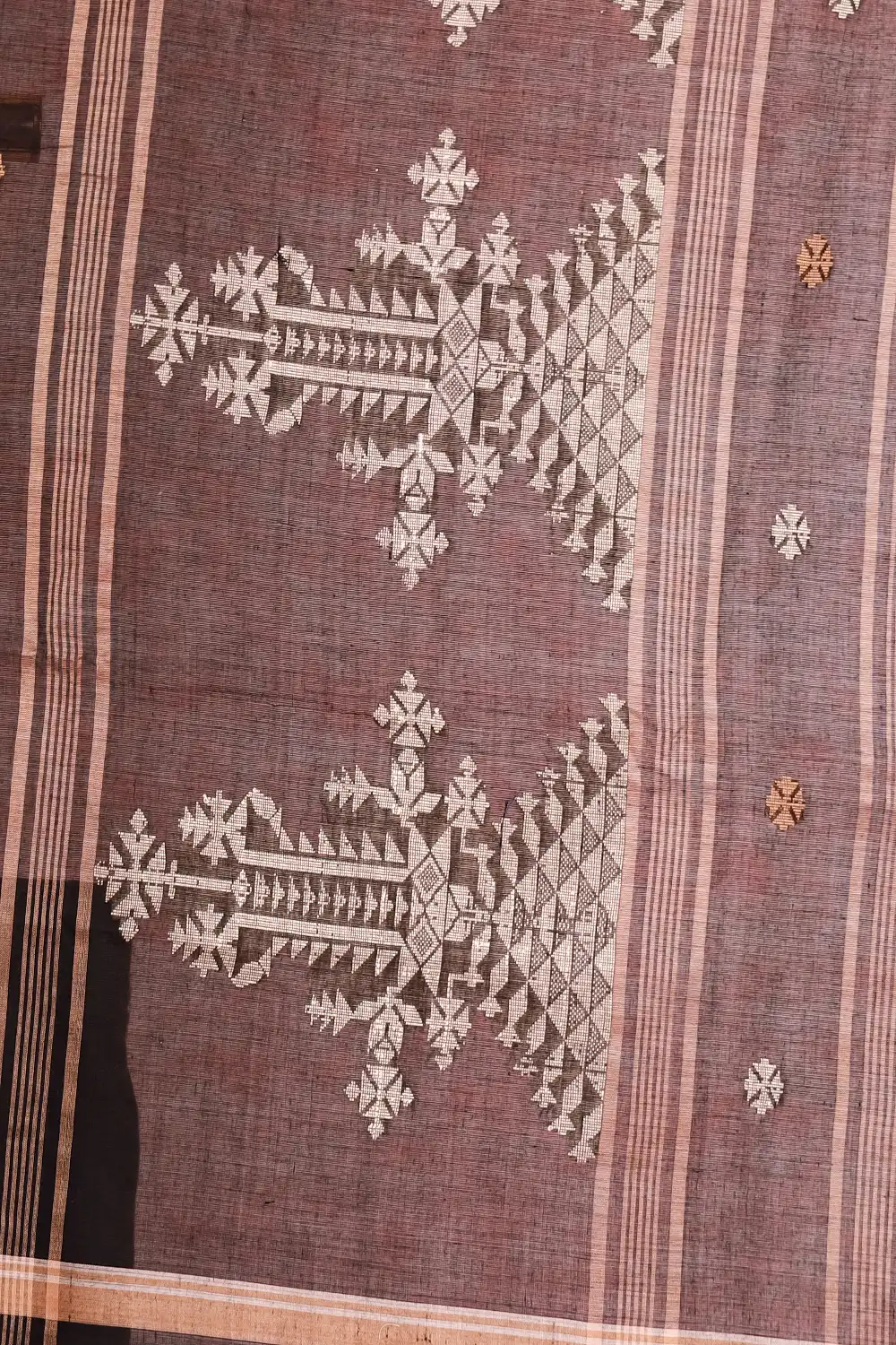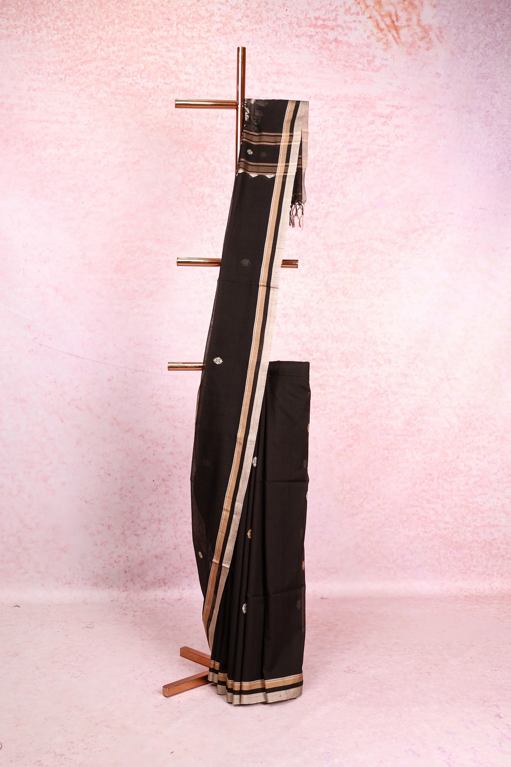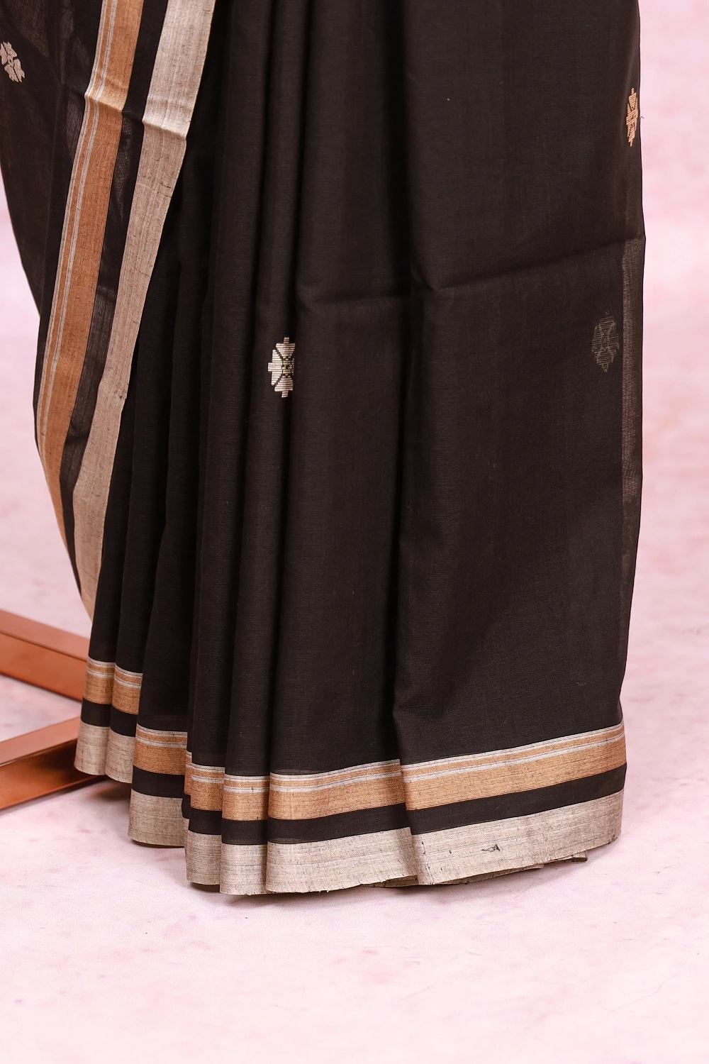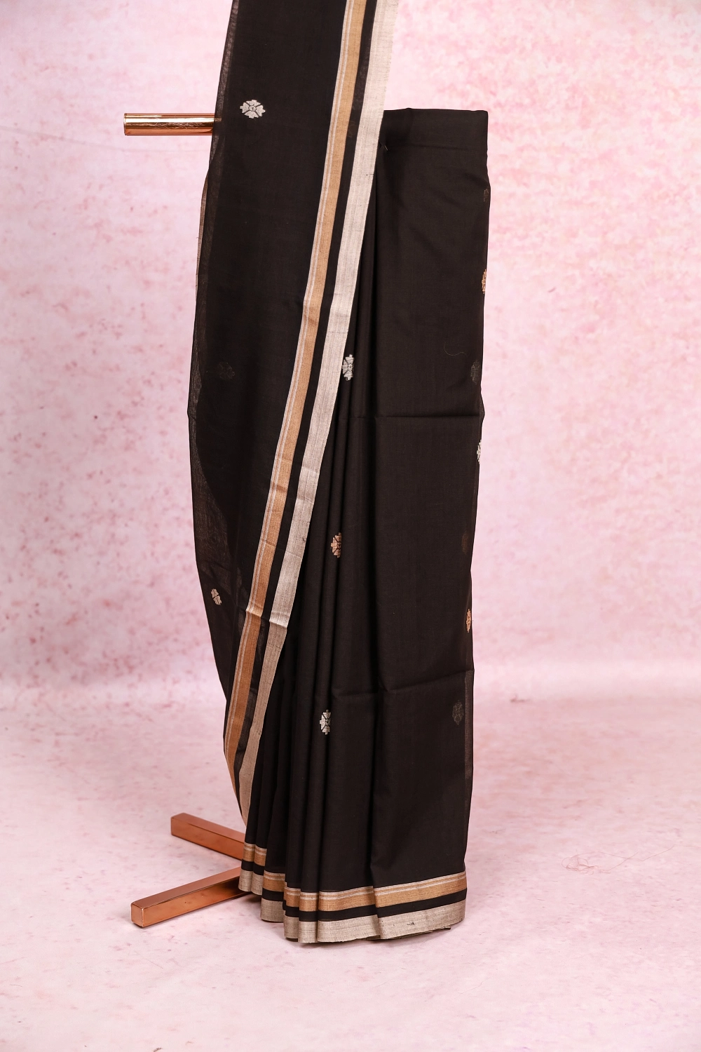 Black Mul Cotton Butta Saree With Line Border. Includes Un Stitched Blouse