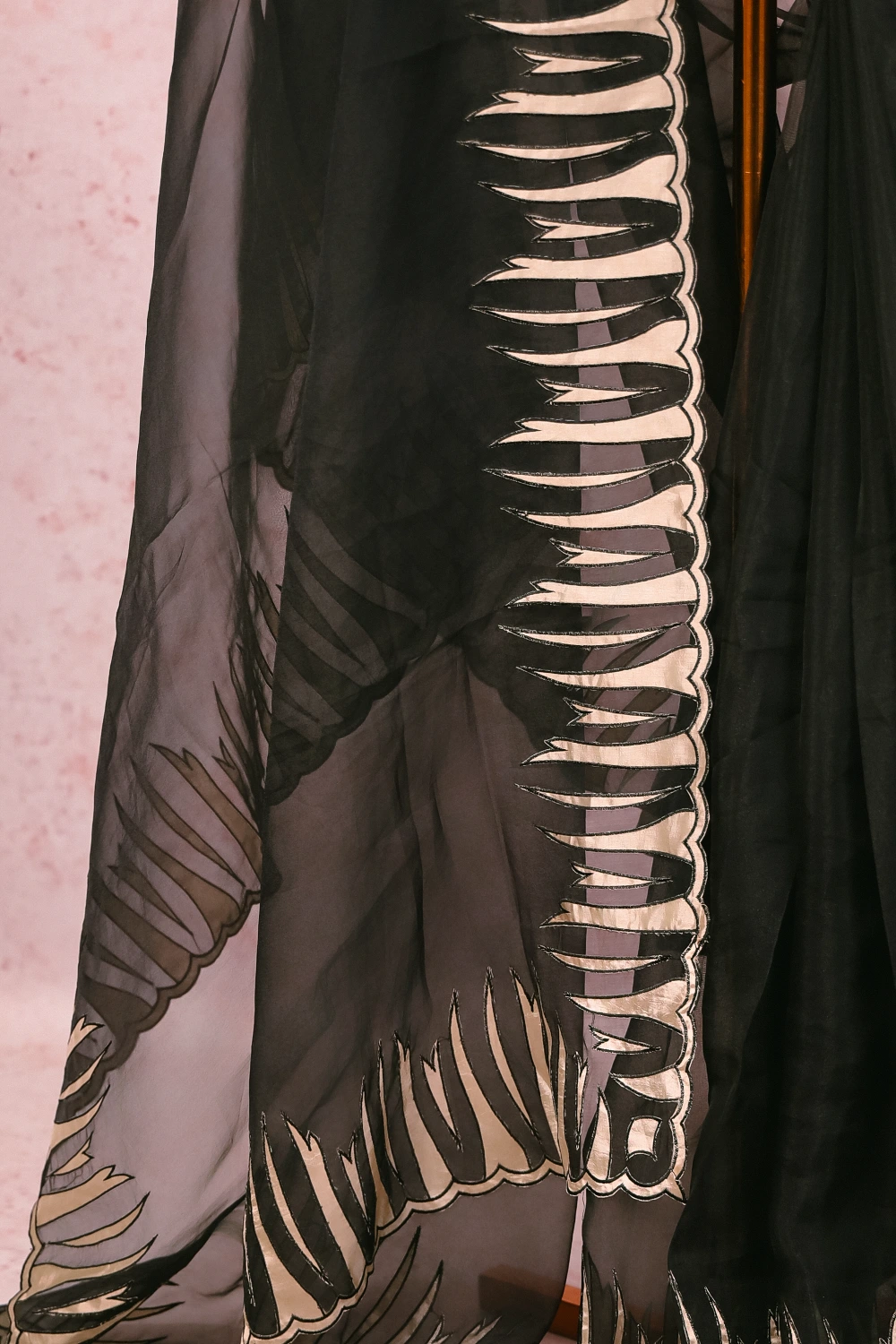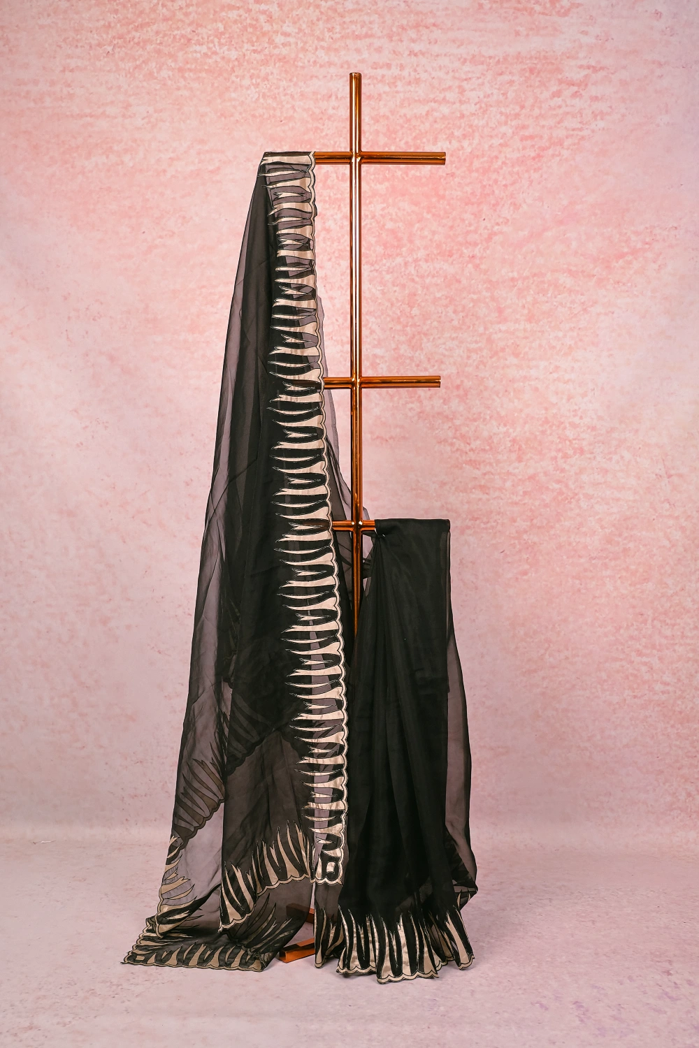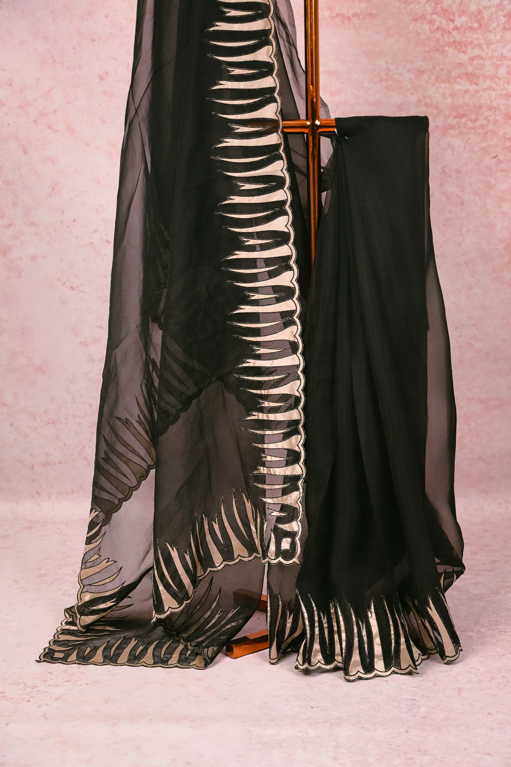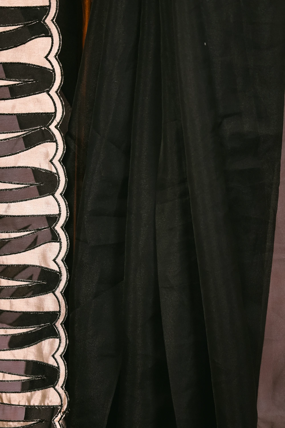 Black Organza Plain Body Saree with Designer border. Includes Unstitched Blouse
