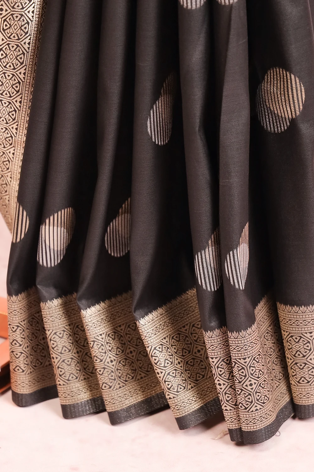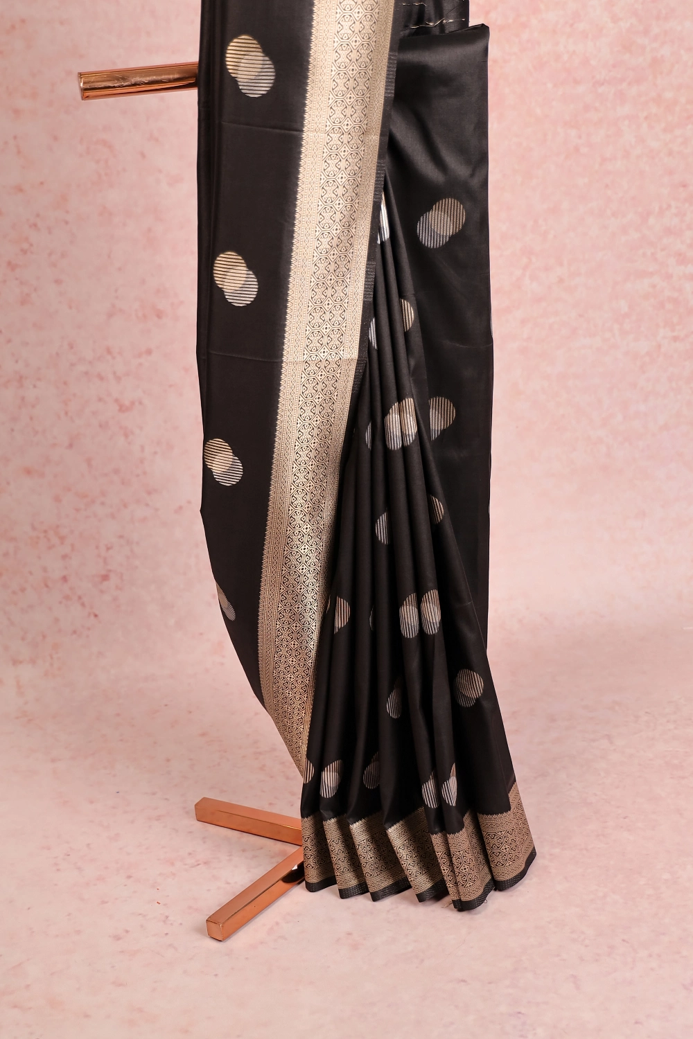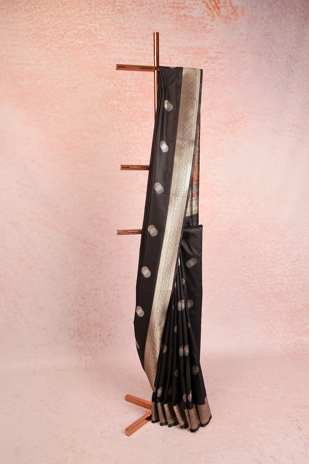 Black Satin Banarasi Butta Saree with Designer Border. Includes Unstitched Blouse