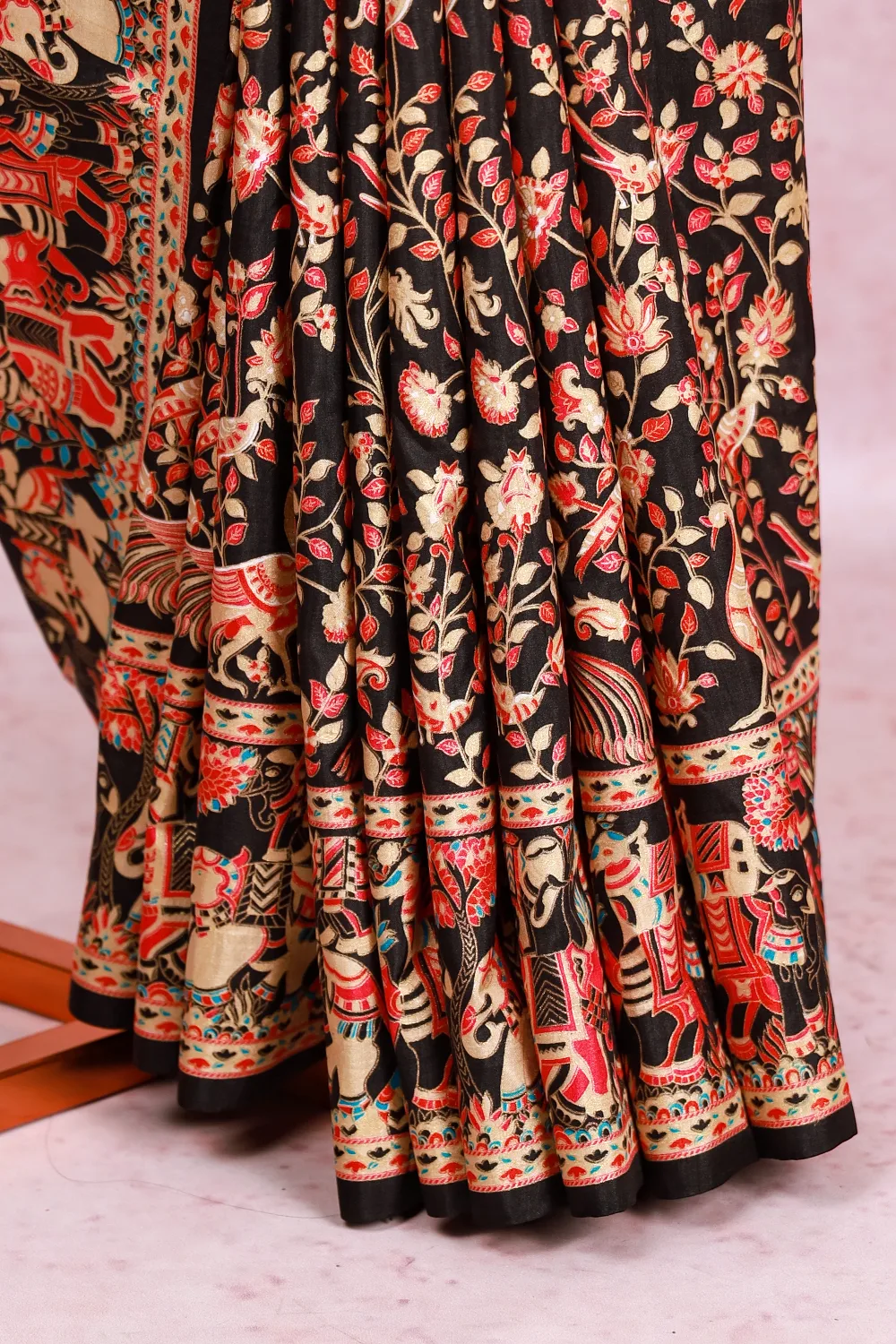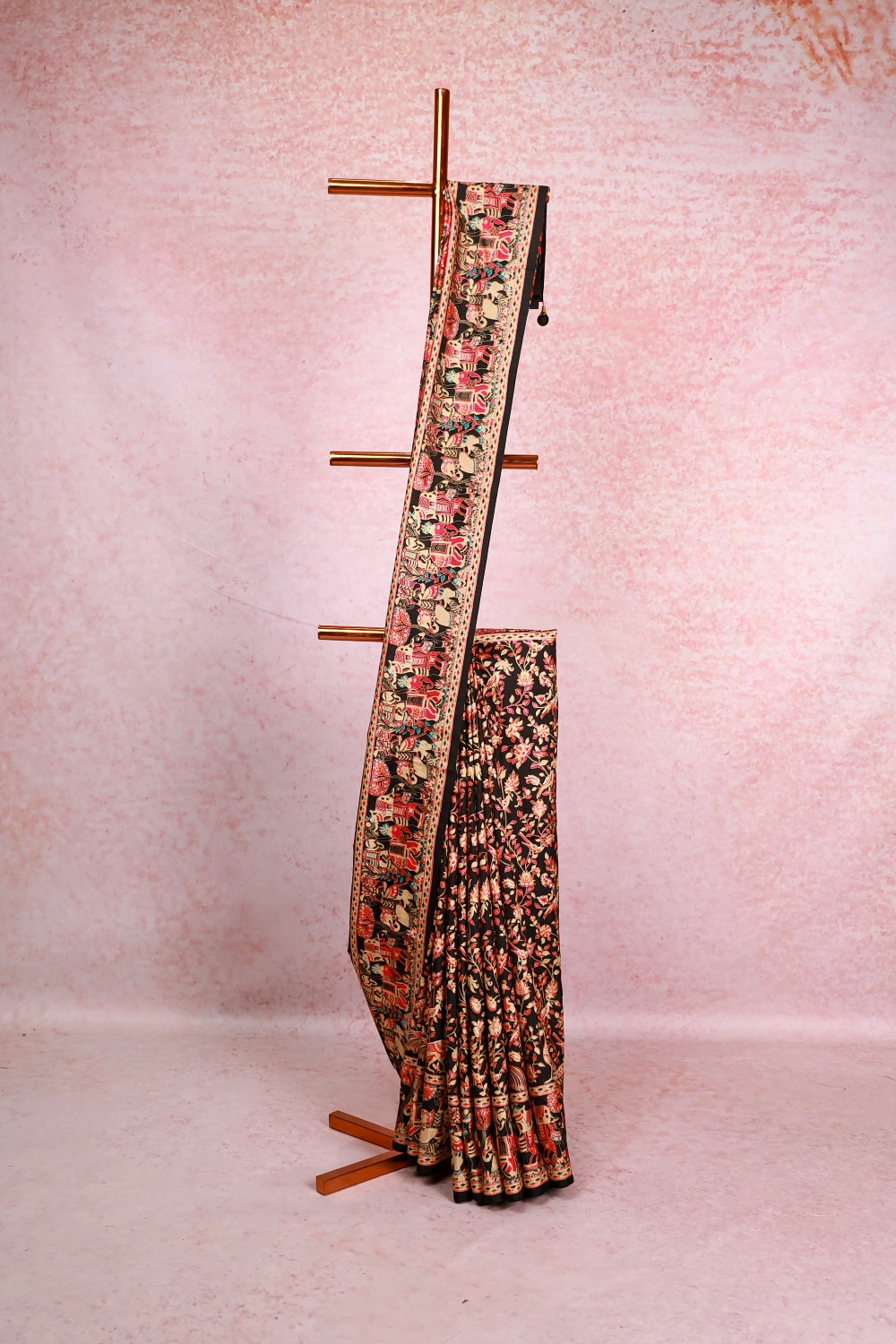 Black Semi Jute Floral Design Saree With Designer Border. Includes Un Stitched Blouse