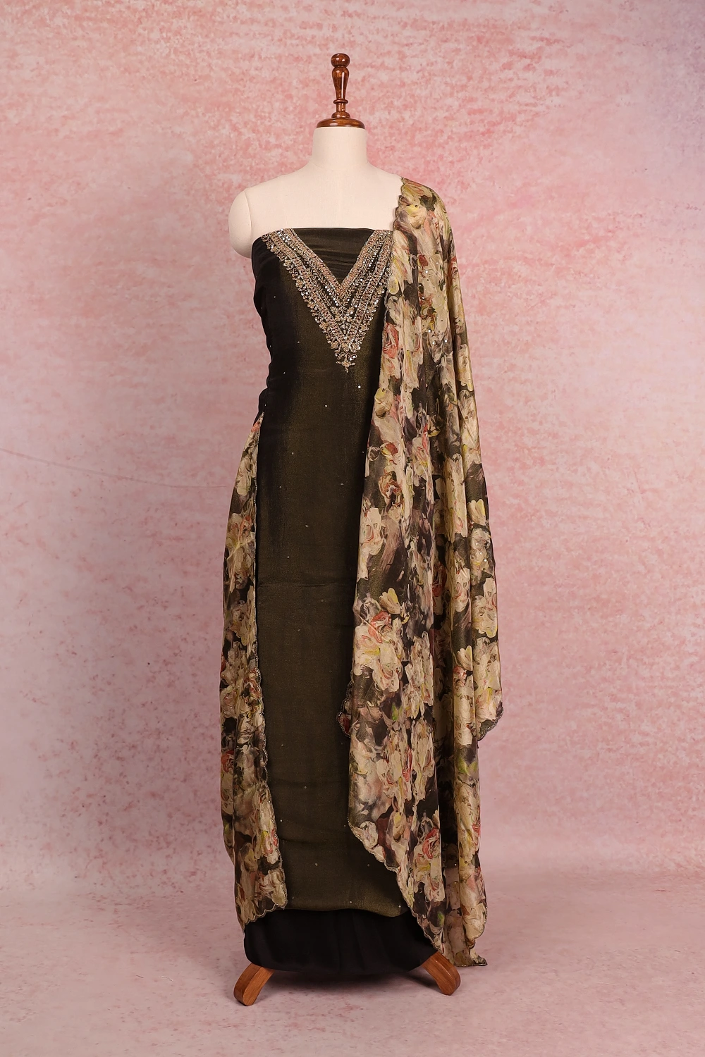 Black Tissue Hand Work Unstitched Churidar Material. Includes Dupatta.