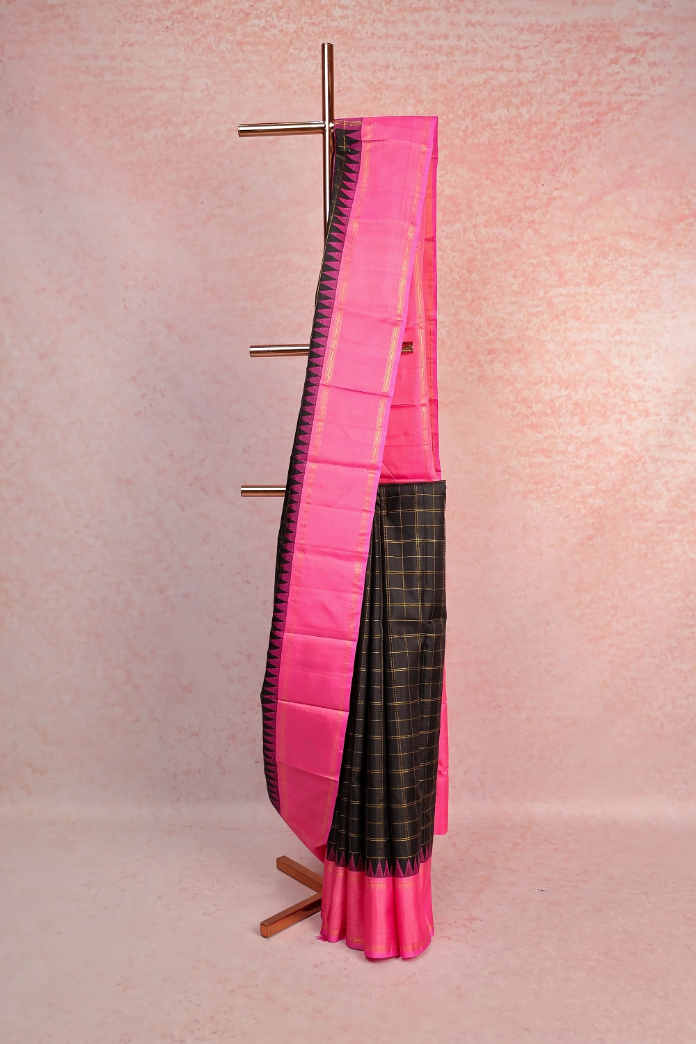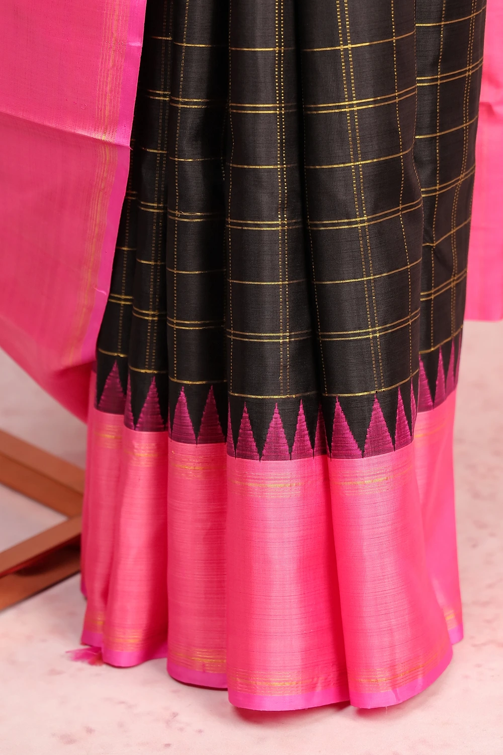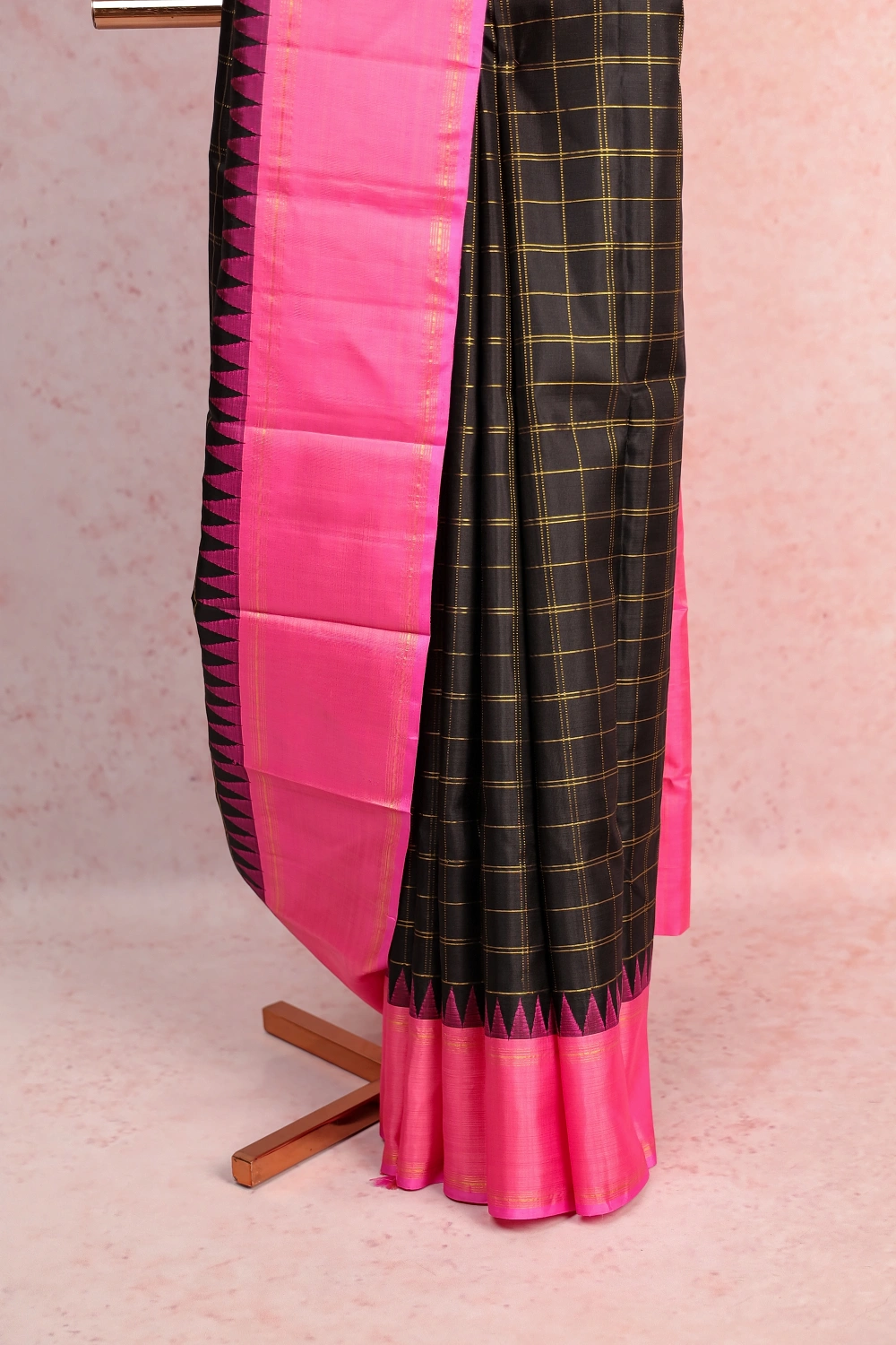 Black Tradional Kancheepuram Silk Check Saree with Temple Border. Includes Unstitched Blouse