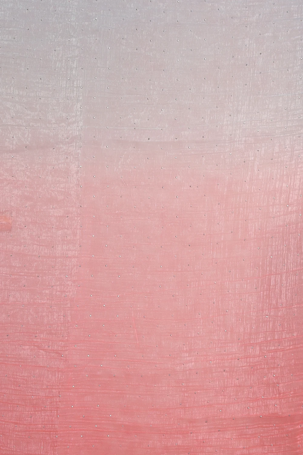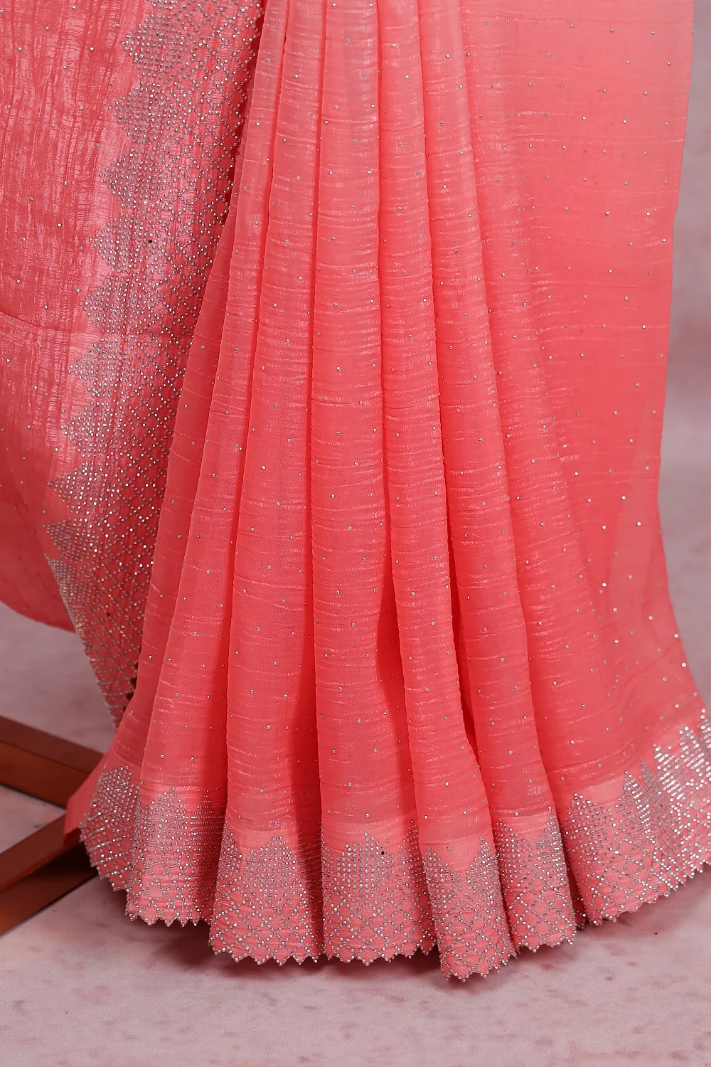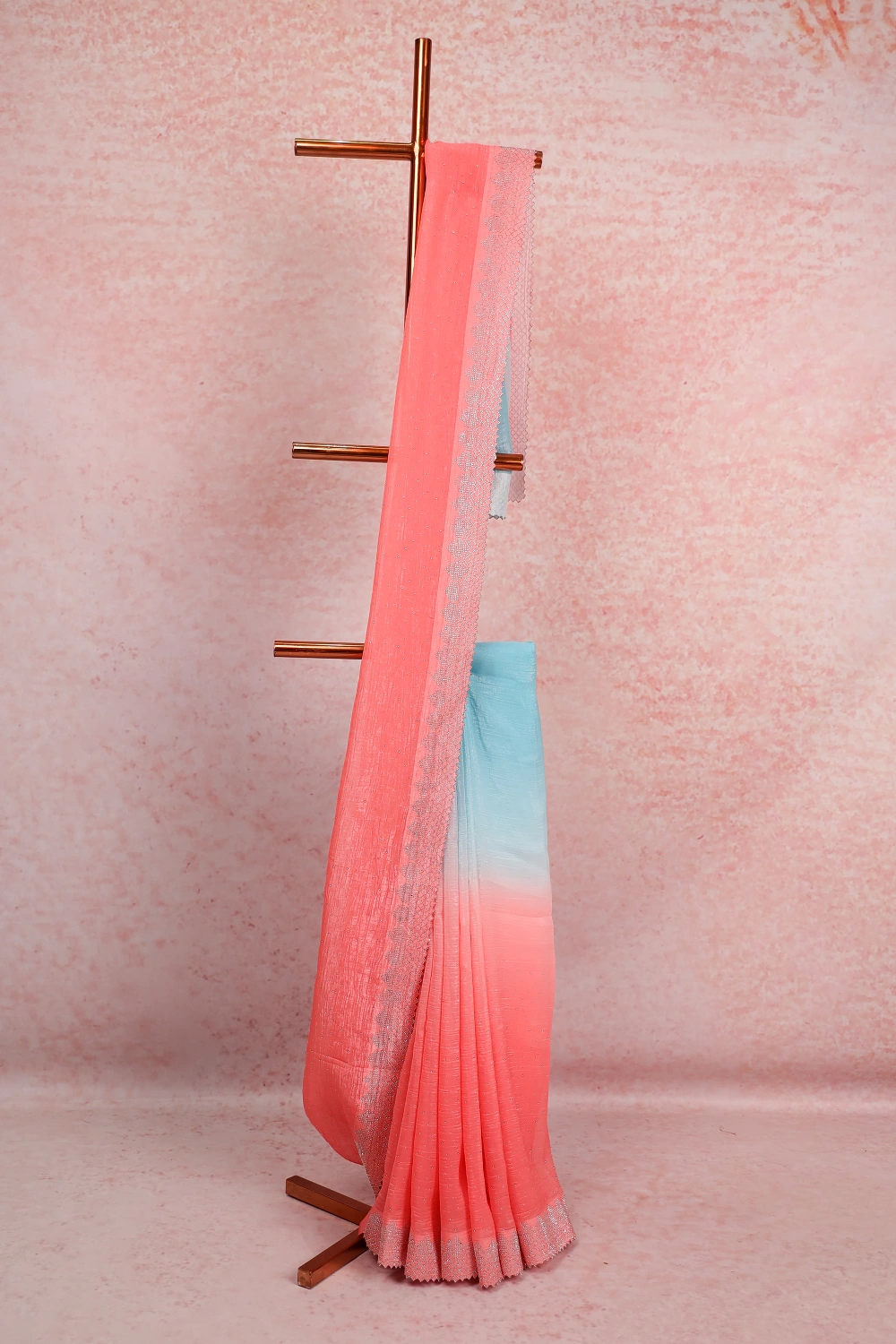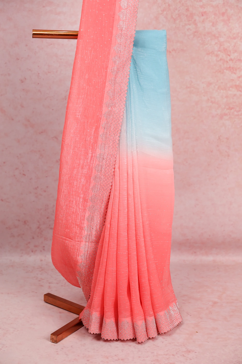 Blue Orange Organza Stone Work Saree With Stone Work Border. Includes Un Stitched Blouse