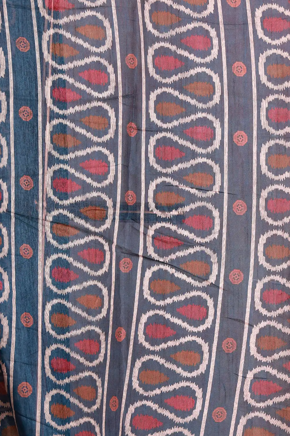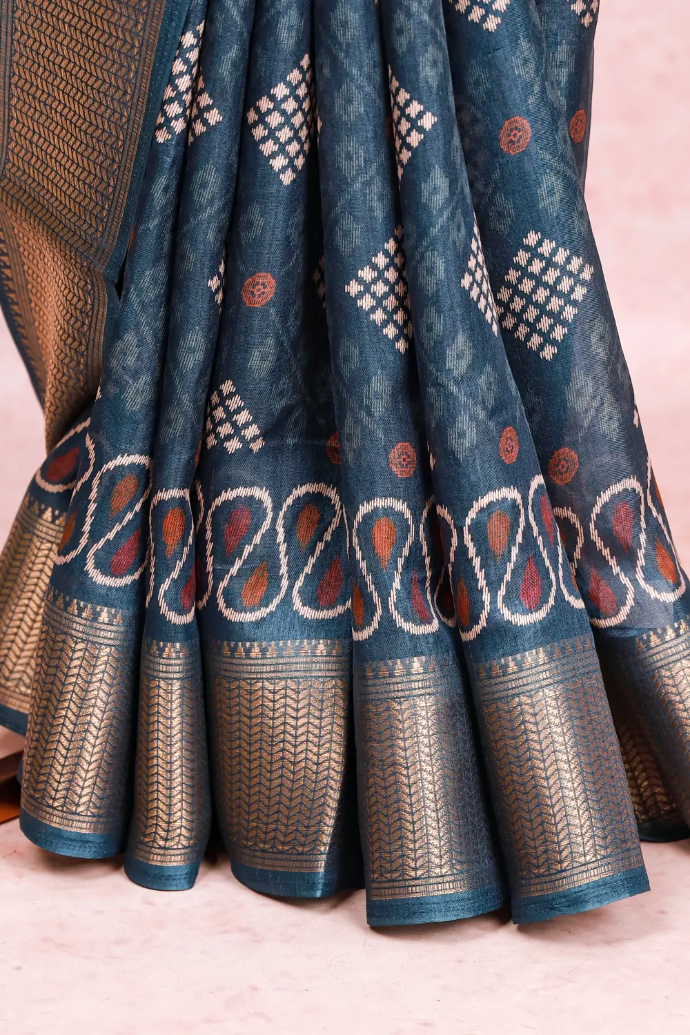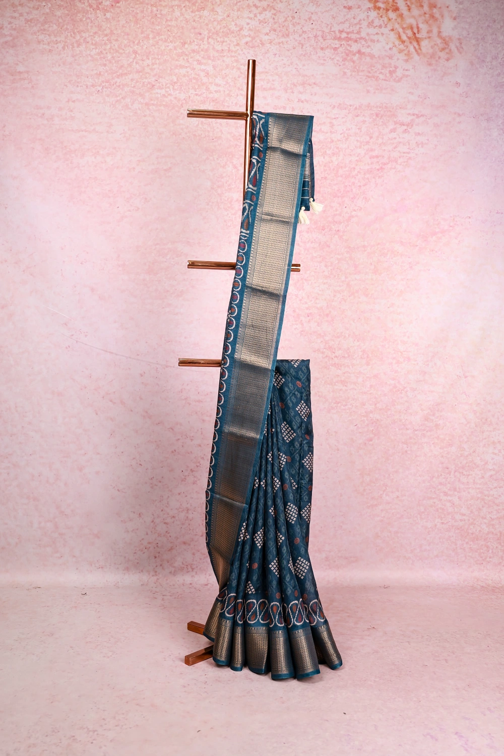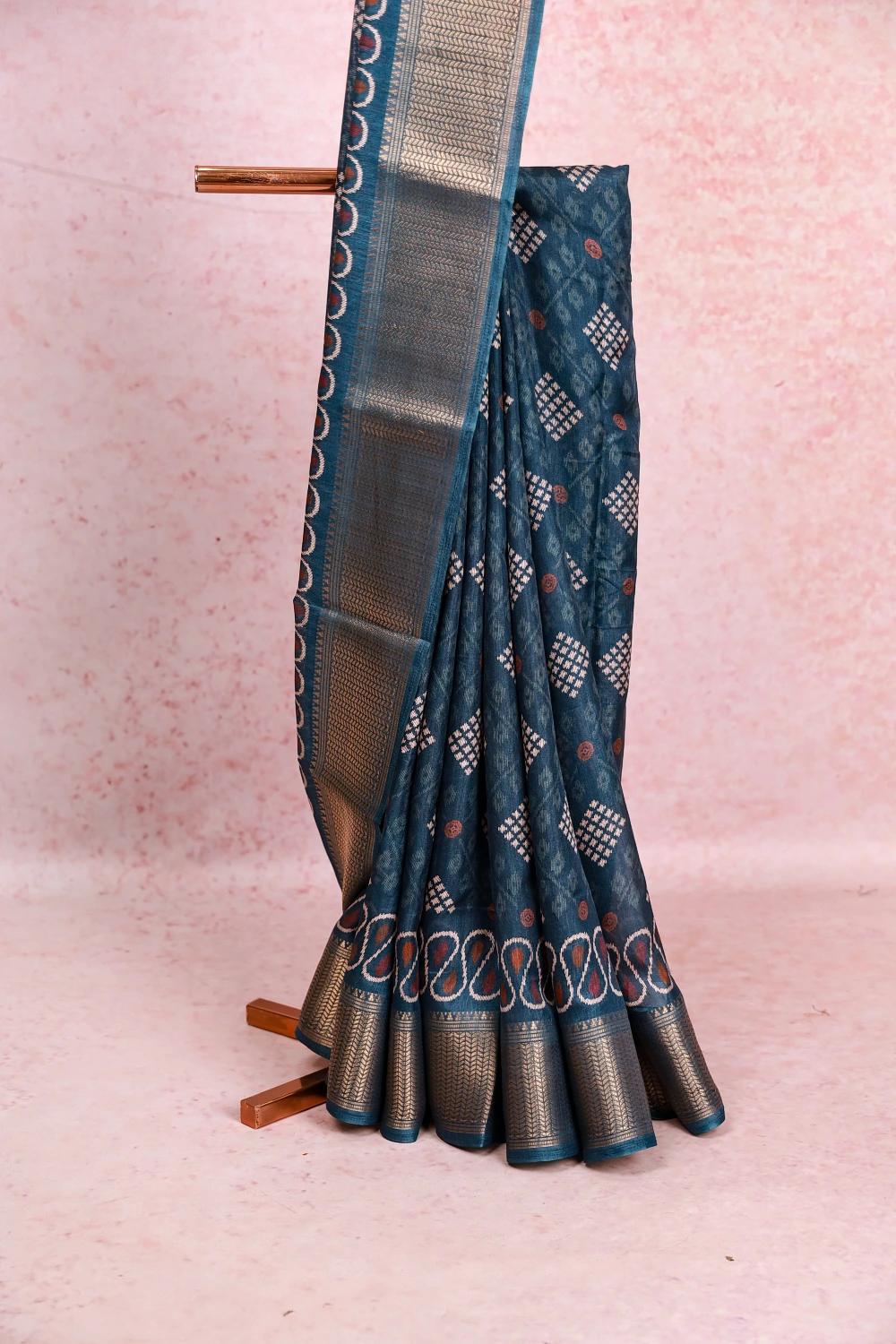 Blue Chanderi Silk Printed Saree with Designer Border. Includes Unstitched Blouse