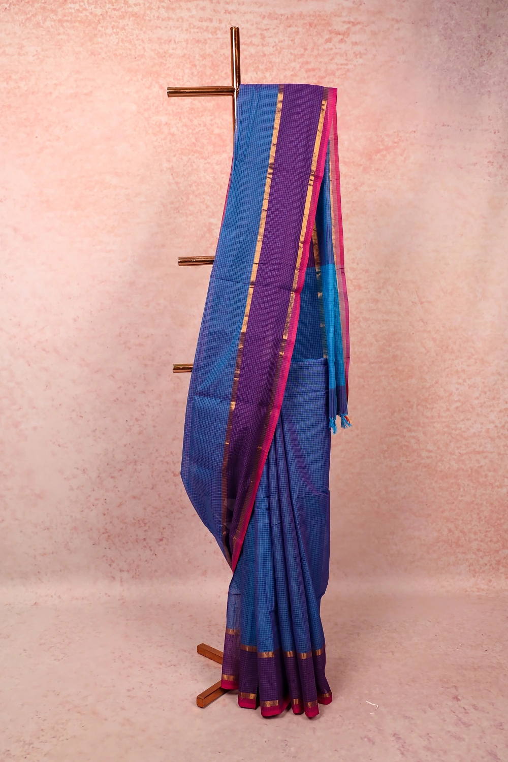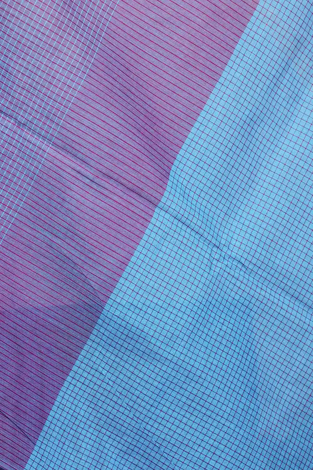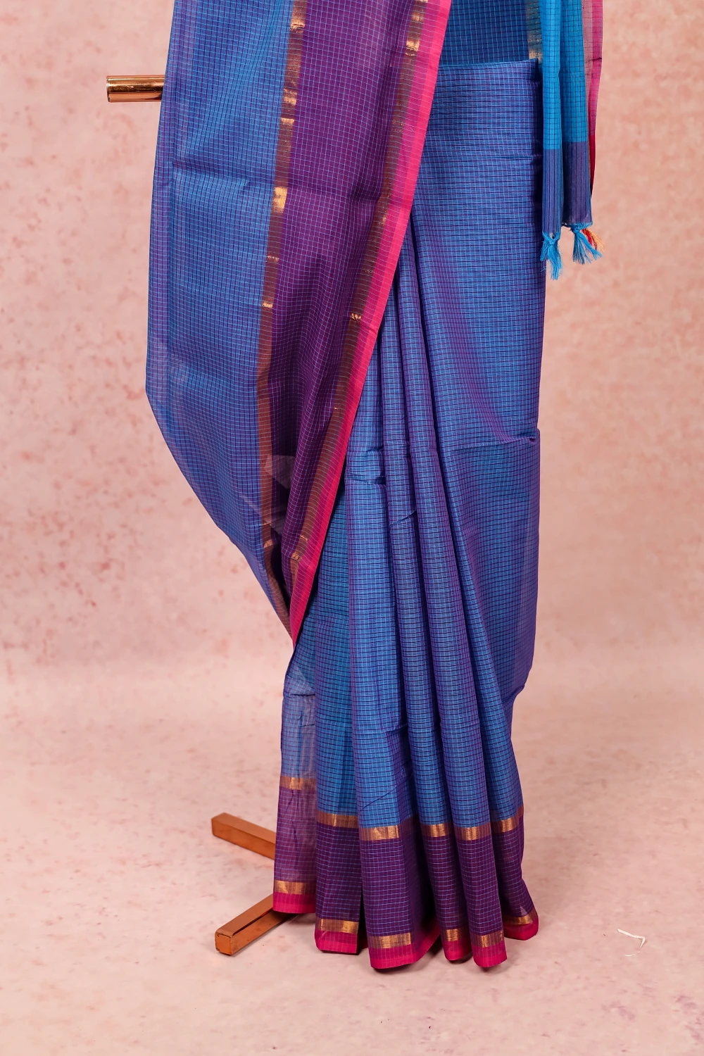 Blue Cotton Check Saree with Line Border. Includes Unstitched Blouse