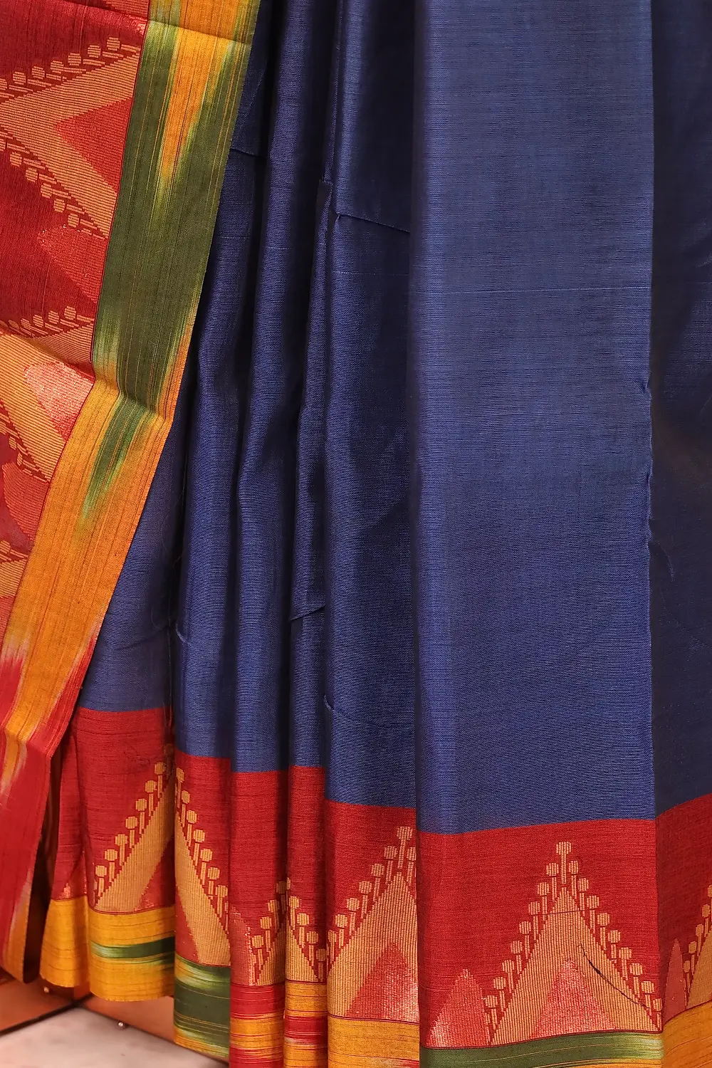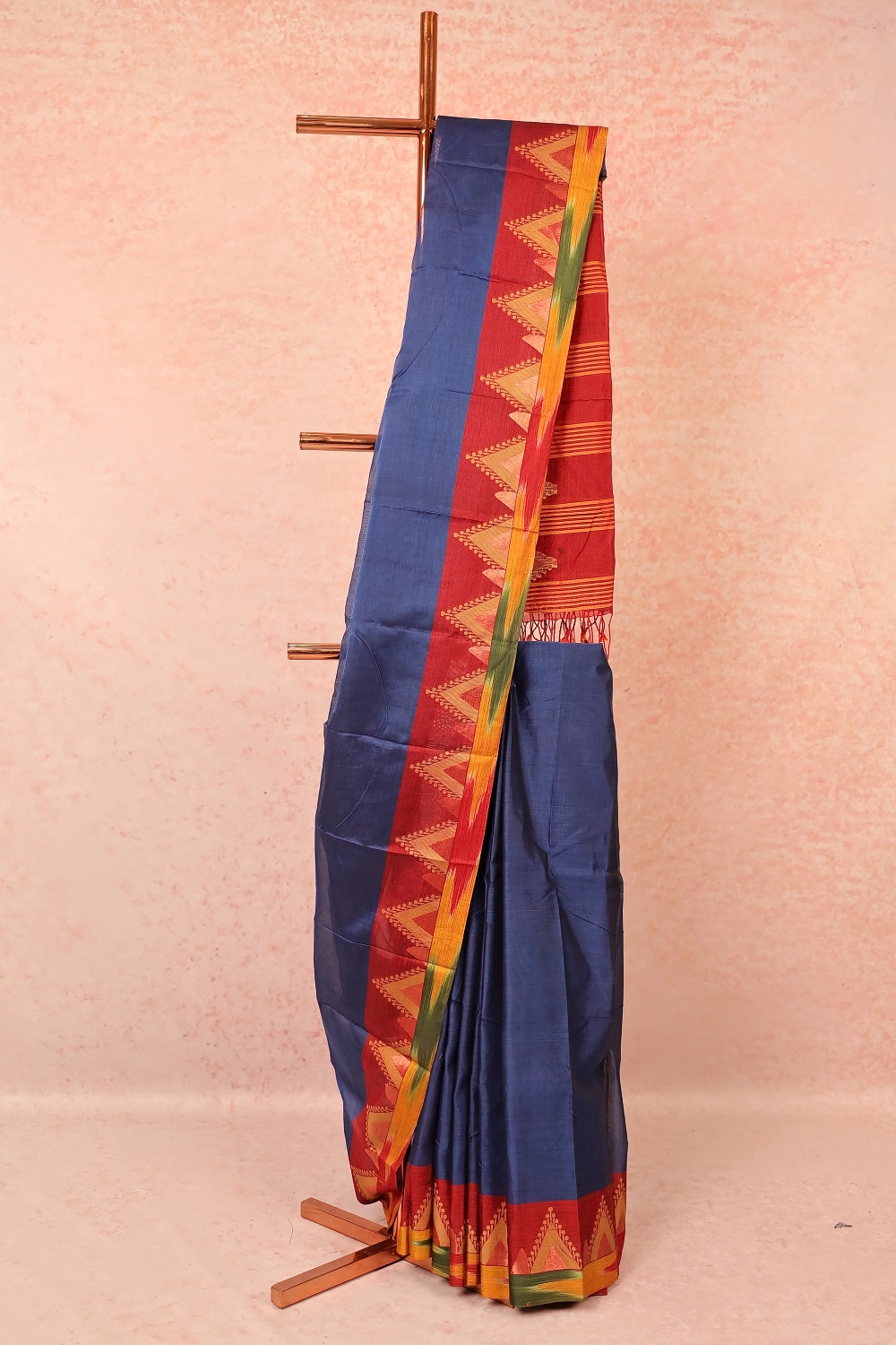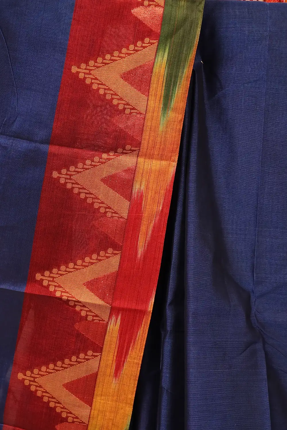 Blue Cotton Plain Body Saree with Temple border. Includes Unstitched Blouse