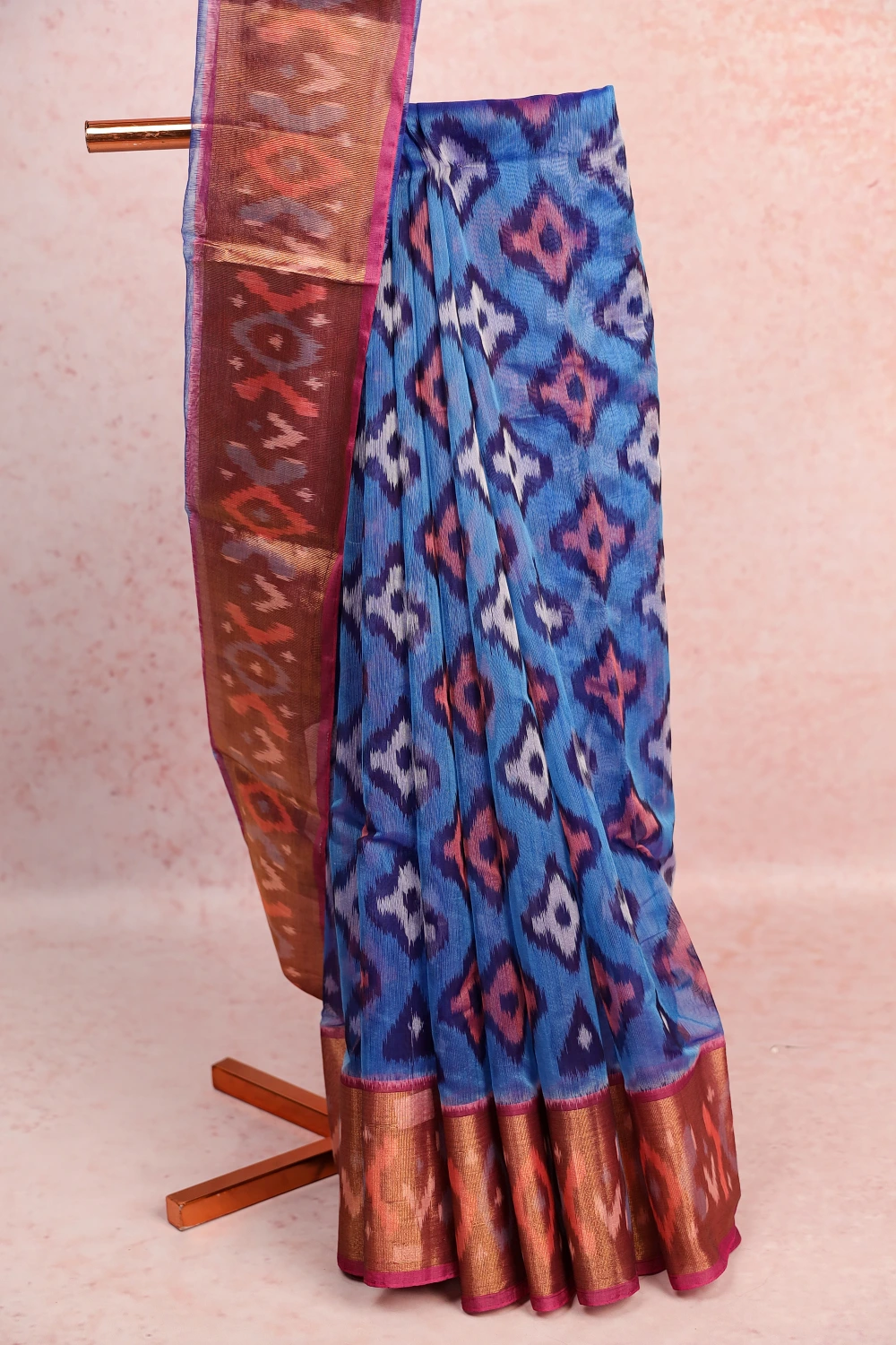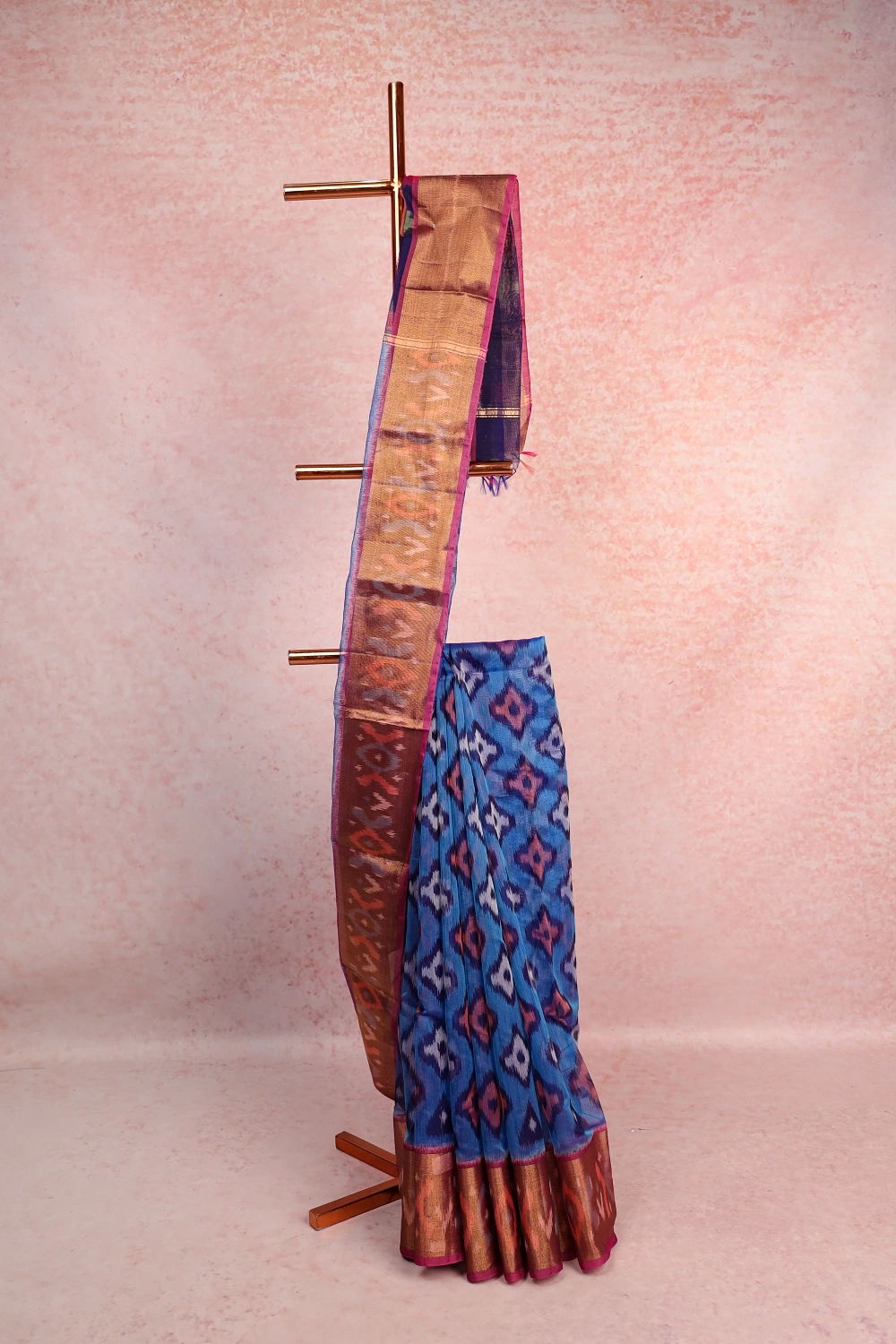 Blue Cotton Silk Pochamalli Saree Without Border. Includes Un Stitched Blouse