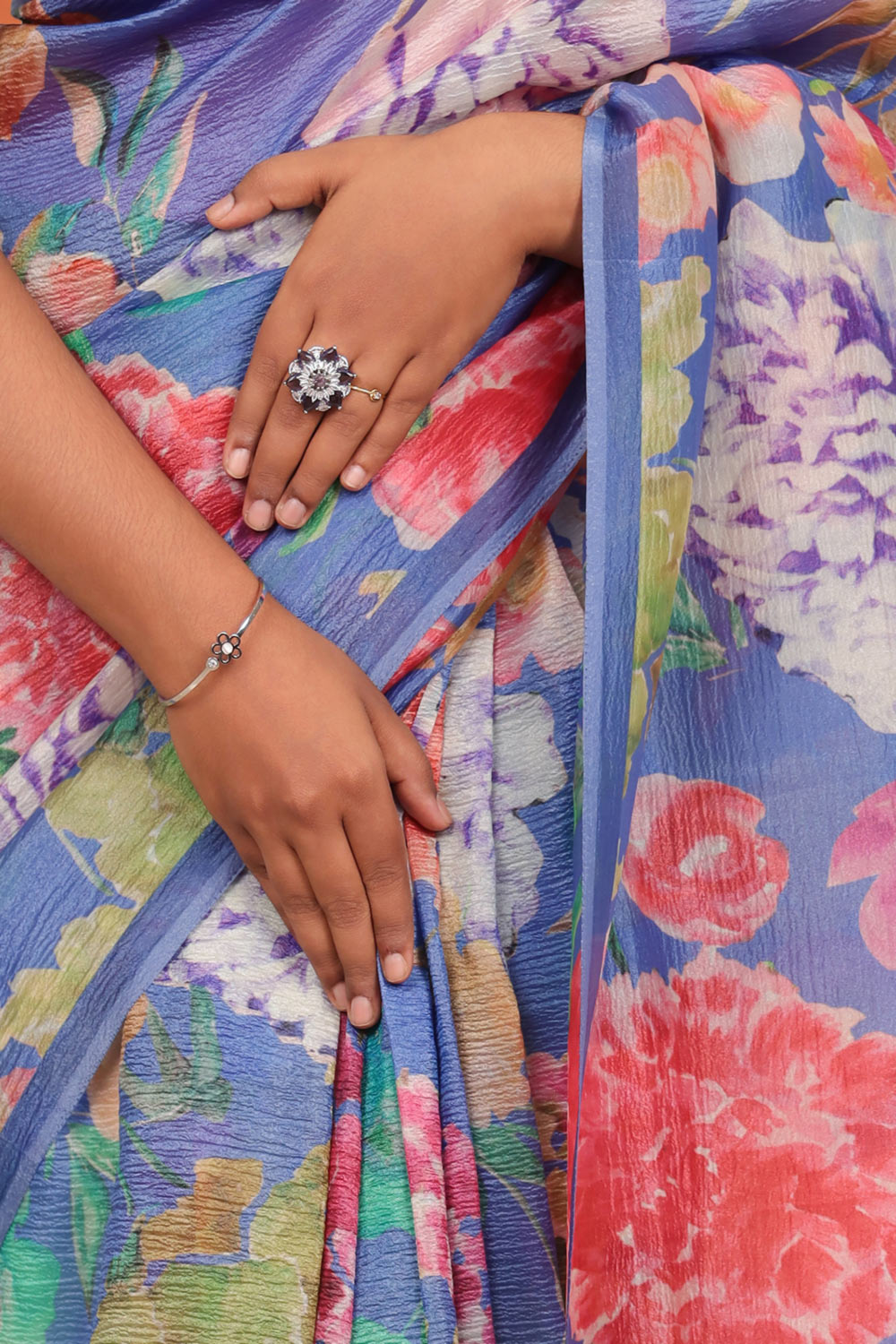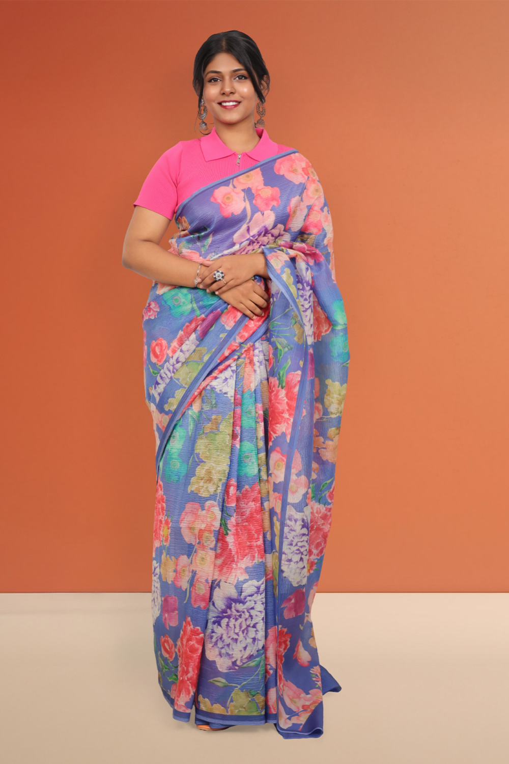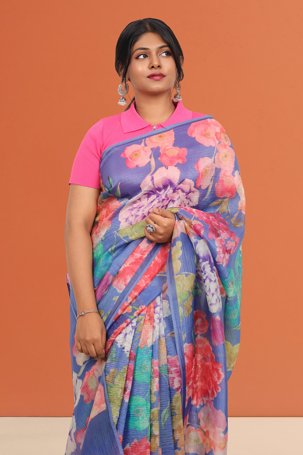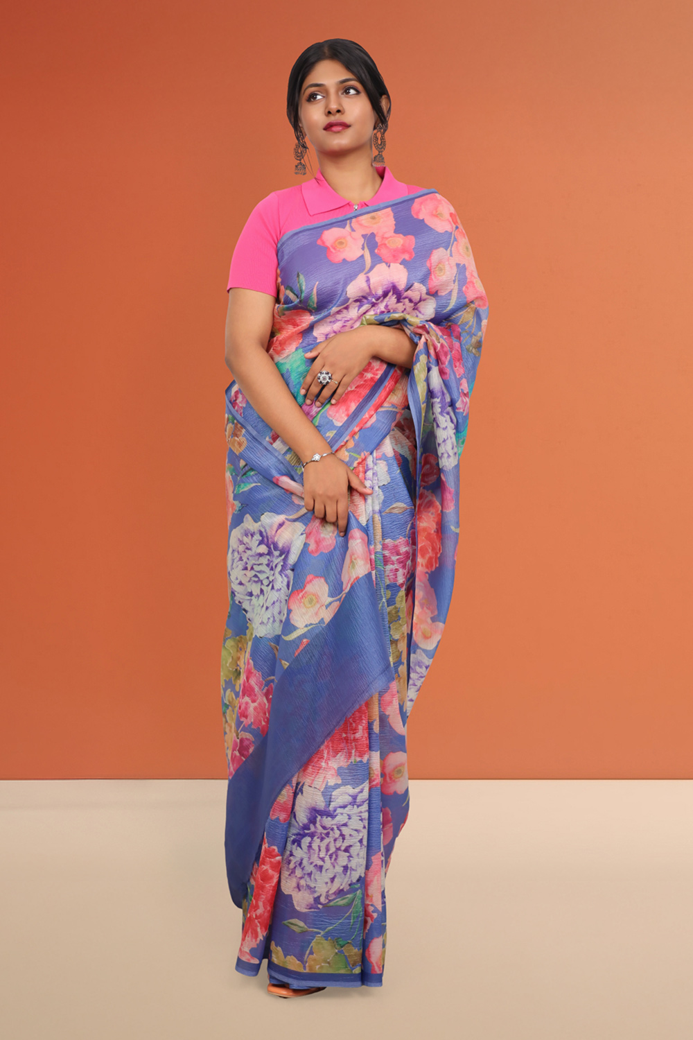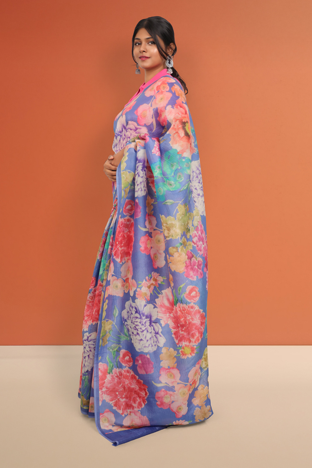 Blue Crush Organza Floral Print Saree with Without border. Includes Unstitched Blouse