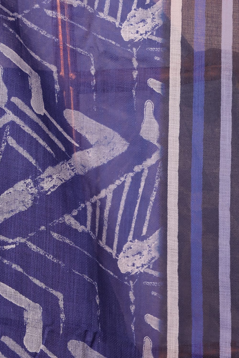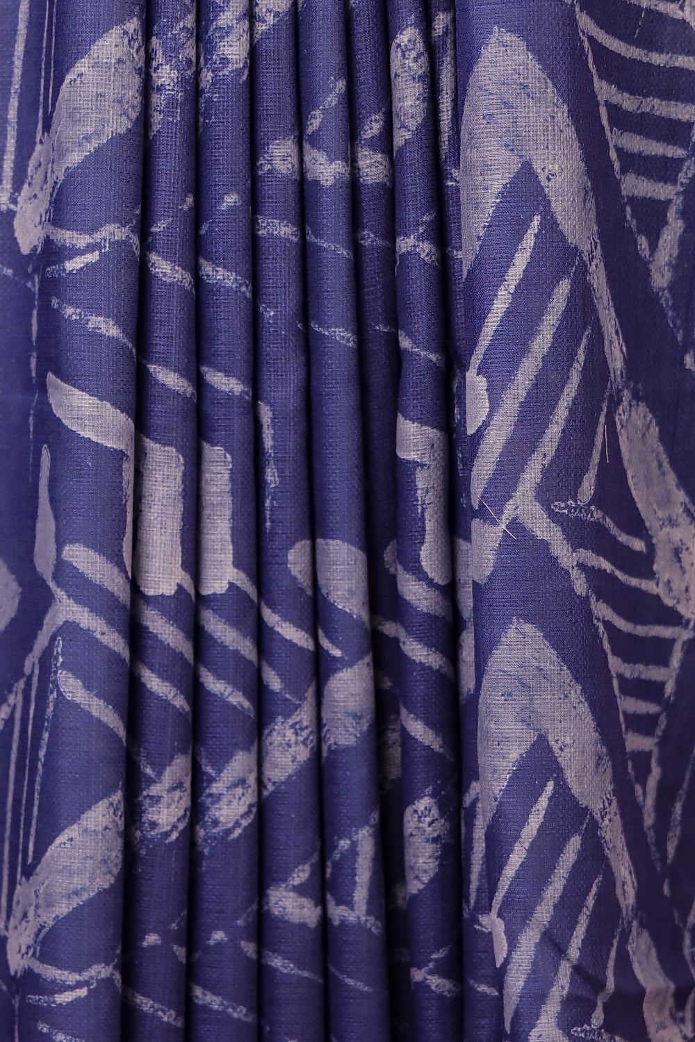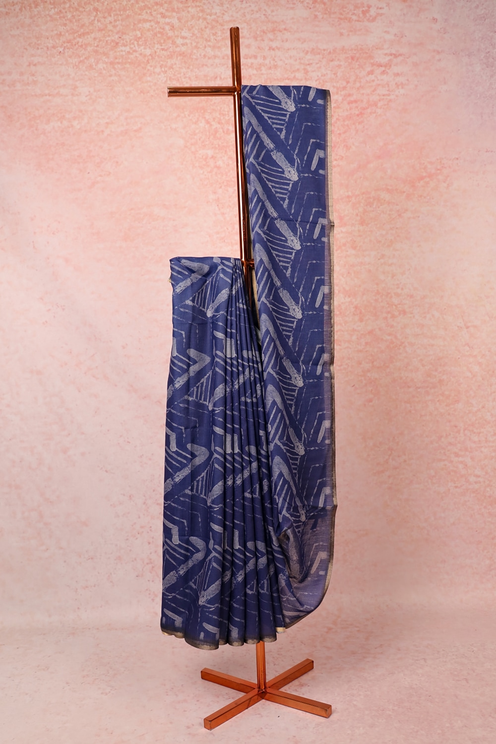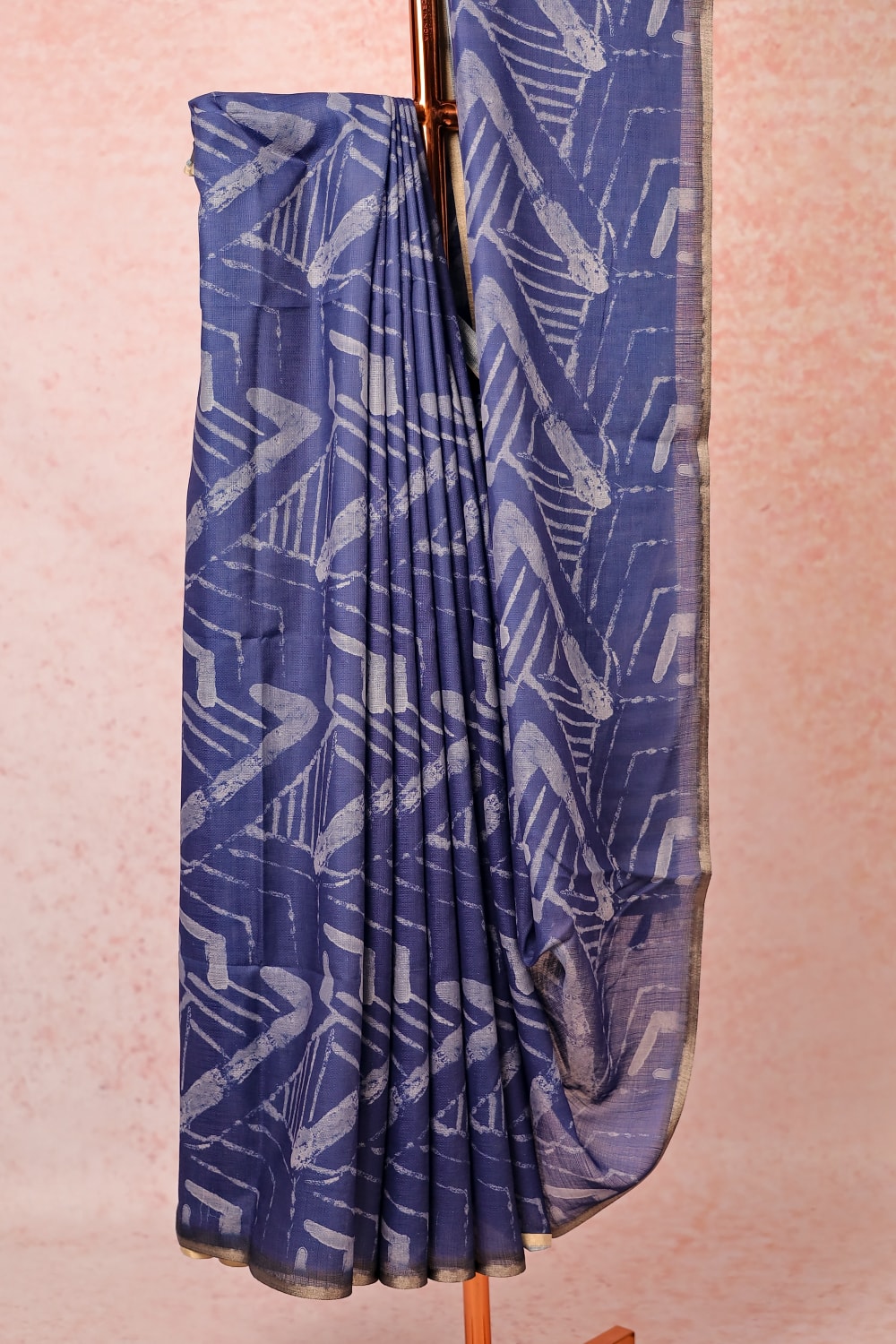 Blue Semi Linen Printed Saree with Small Border. Unstiched Blouse Piece
