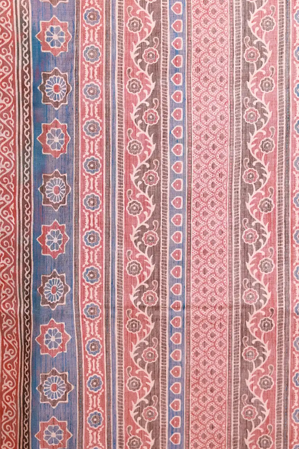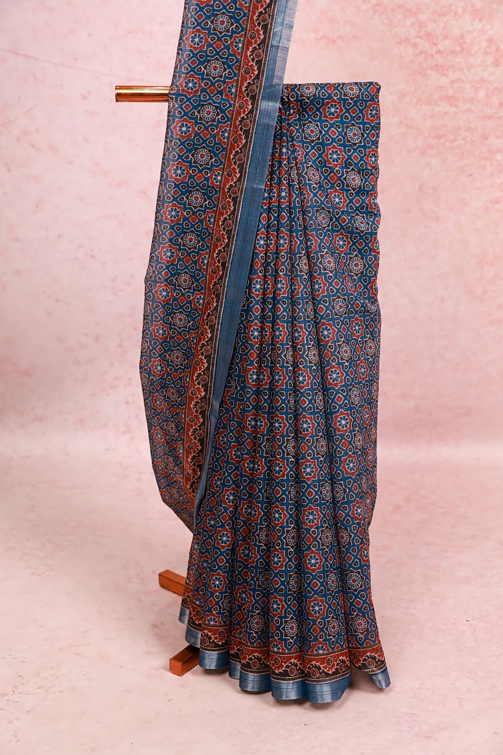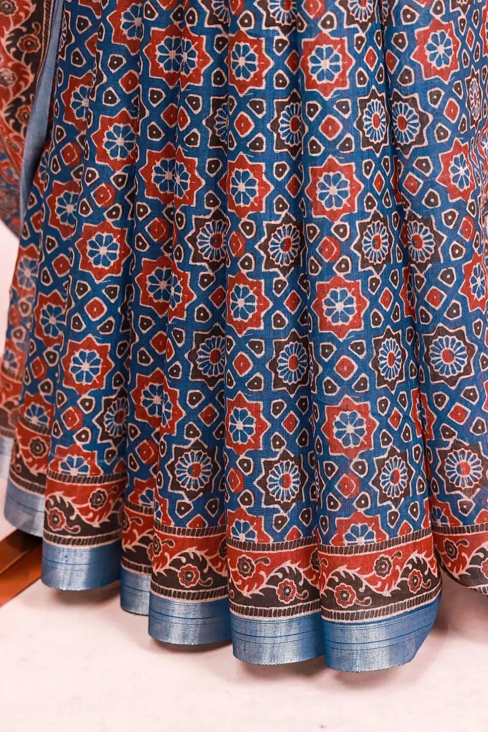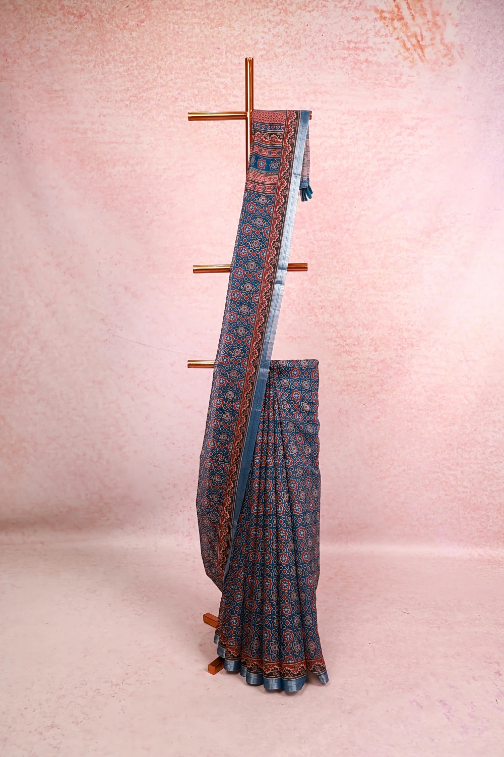Blue Semi Linen Ajrakh Saree with Silver Tissue Border. Includes Unstitched Blouse