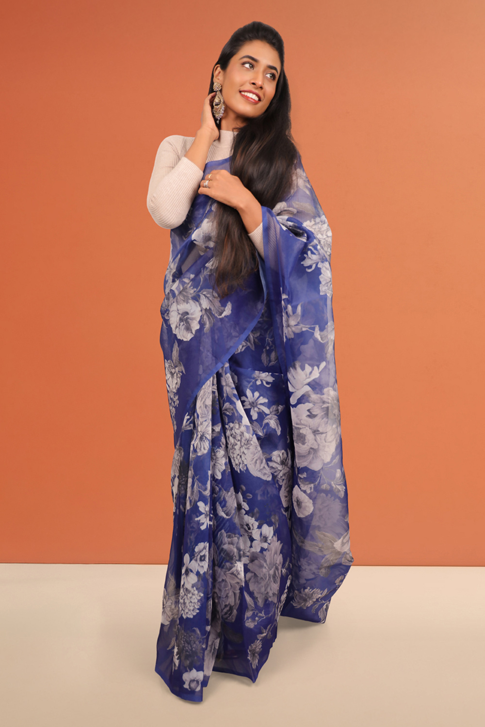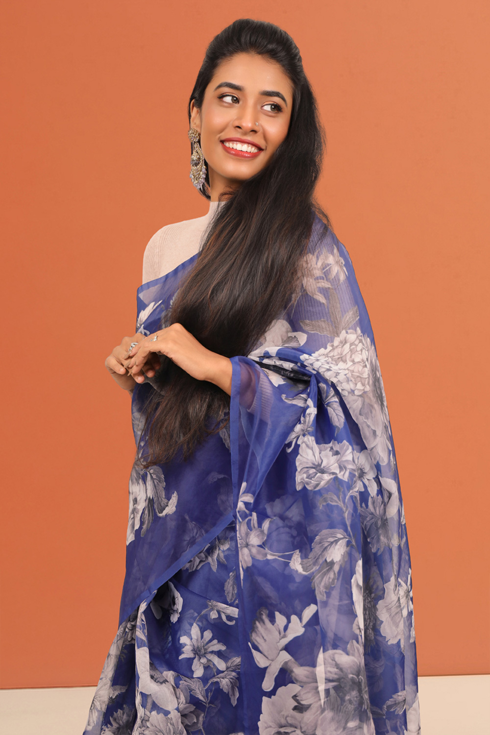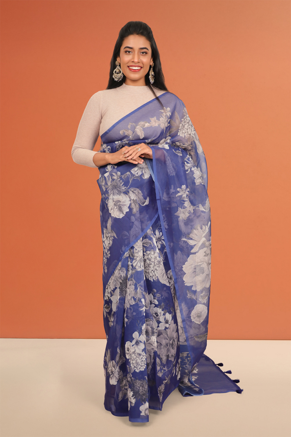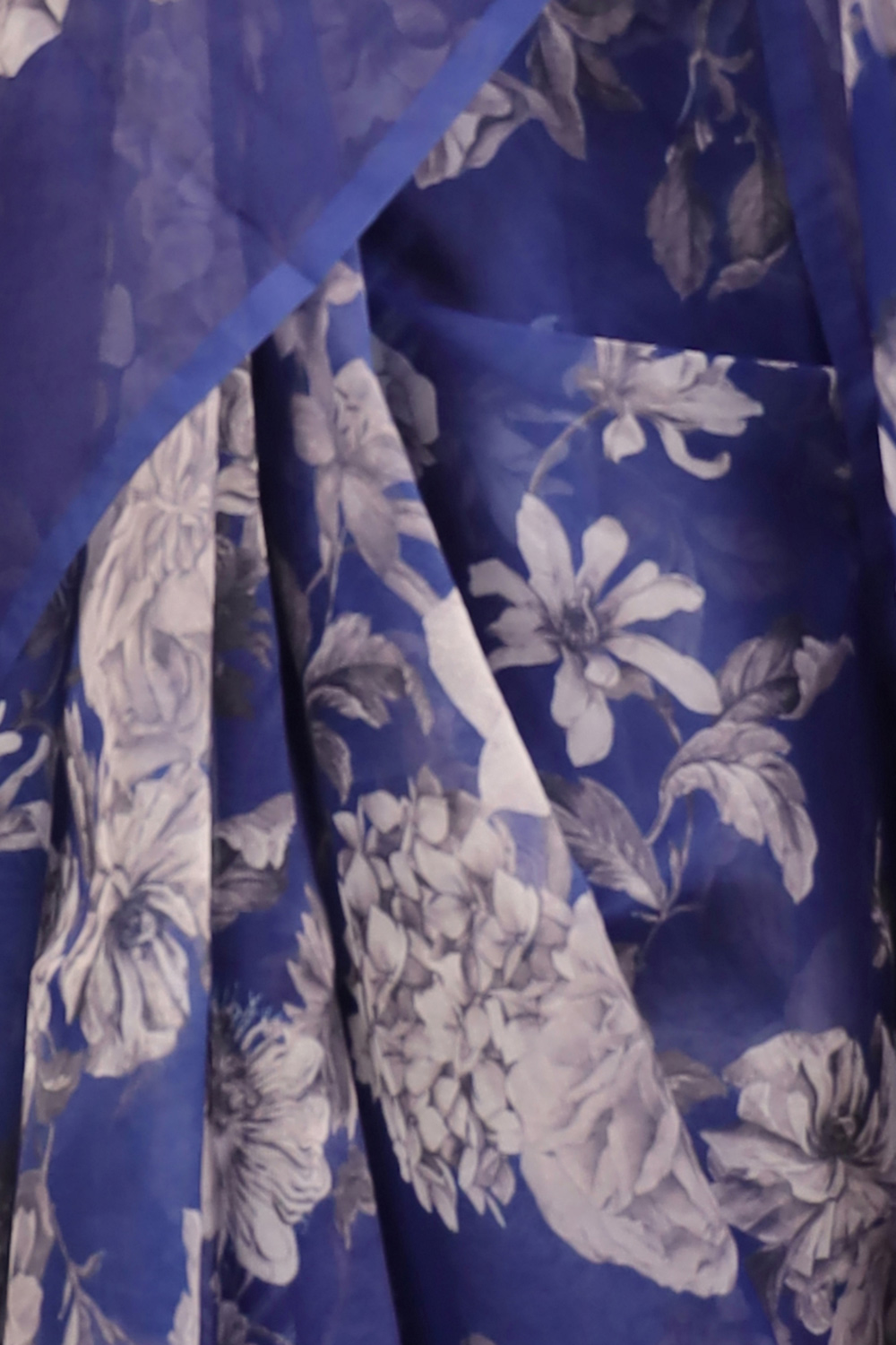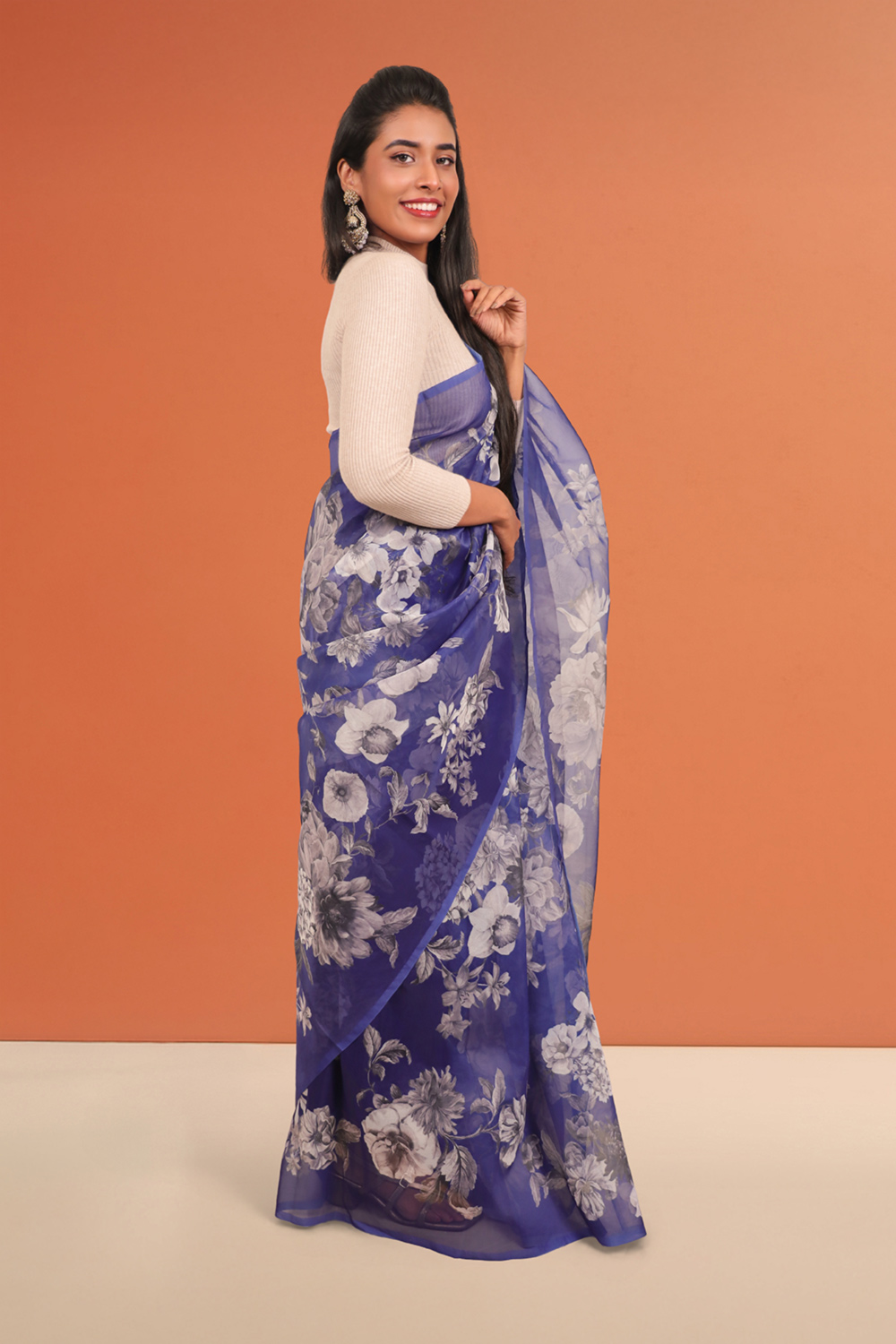 Blue Semi Organza Floral Printed Saree with Without border. Includes unstitched Blouse Material