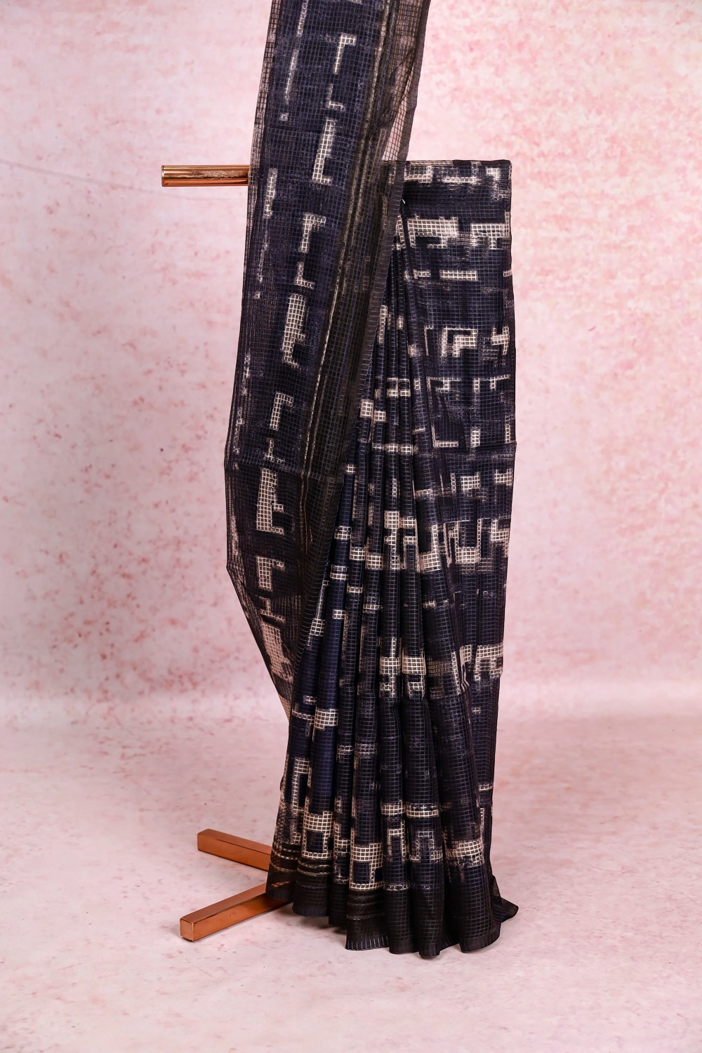 Blue Semi Tussar Check Saree With Check Border. Includes Unstitched Blouse