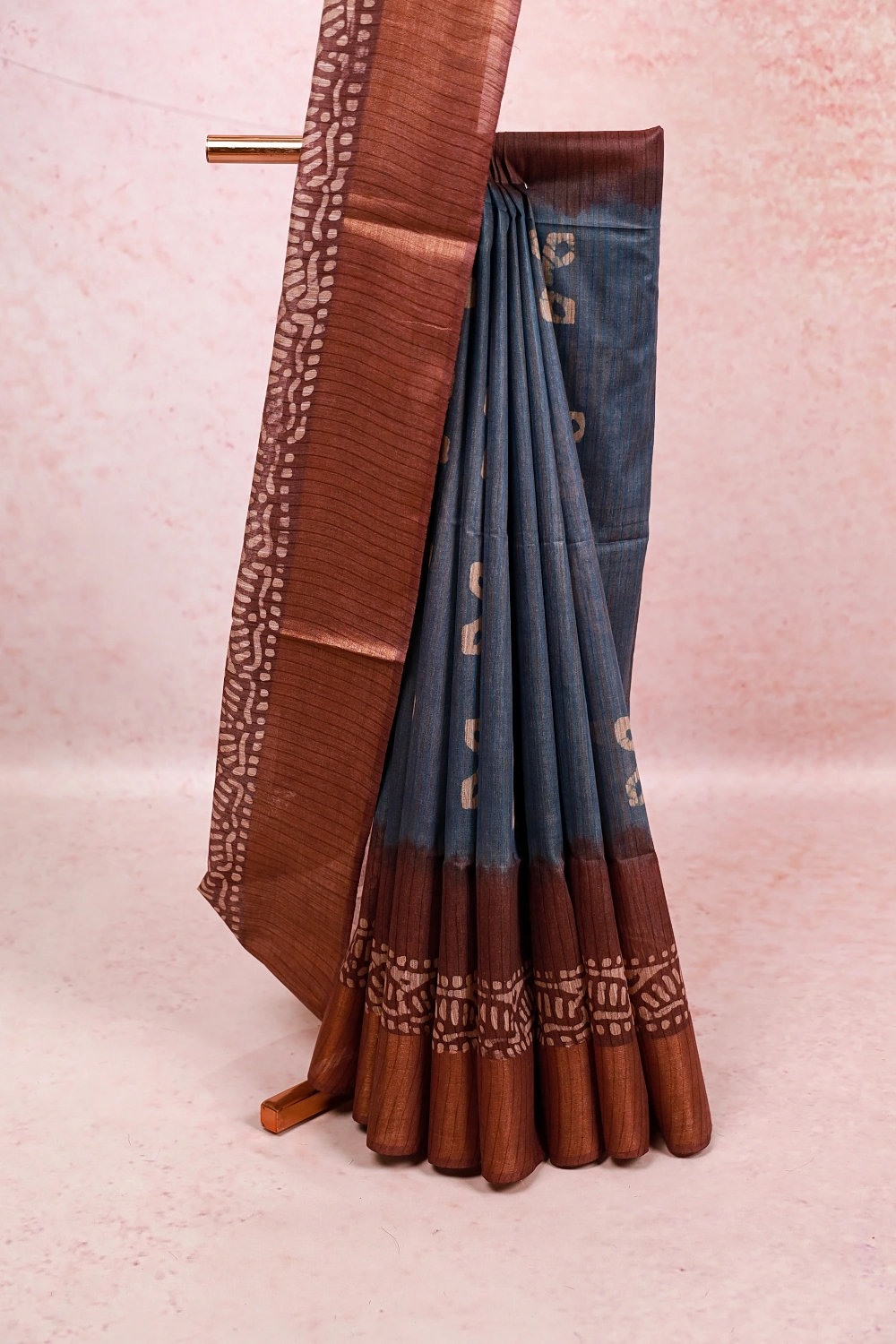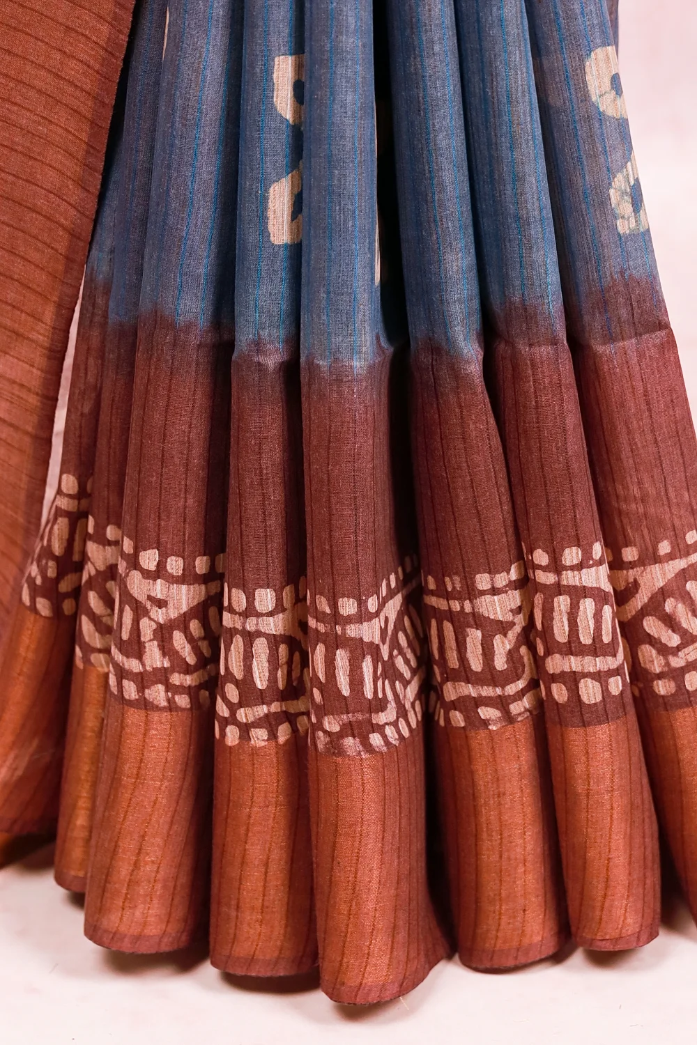 Blue Semi Tussar Bathik Printed Saree With Zari Border. Includes Unstitched Blouse