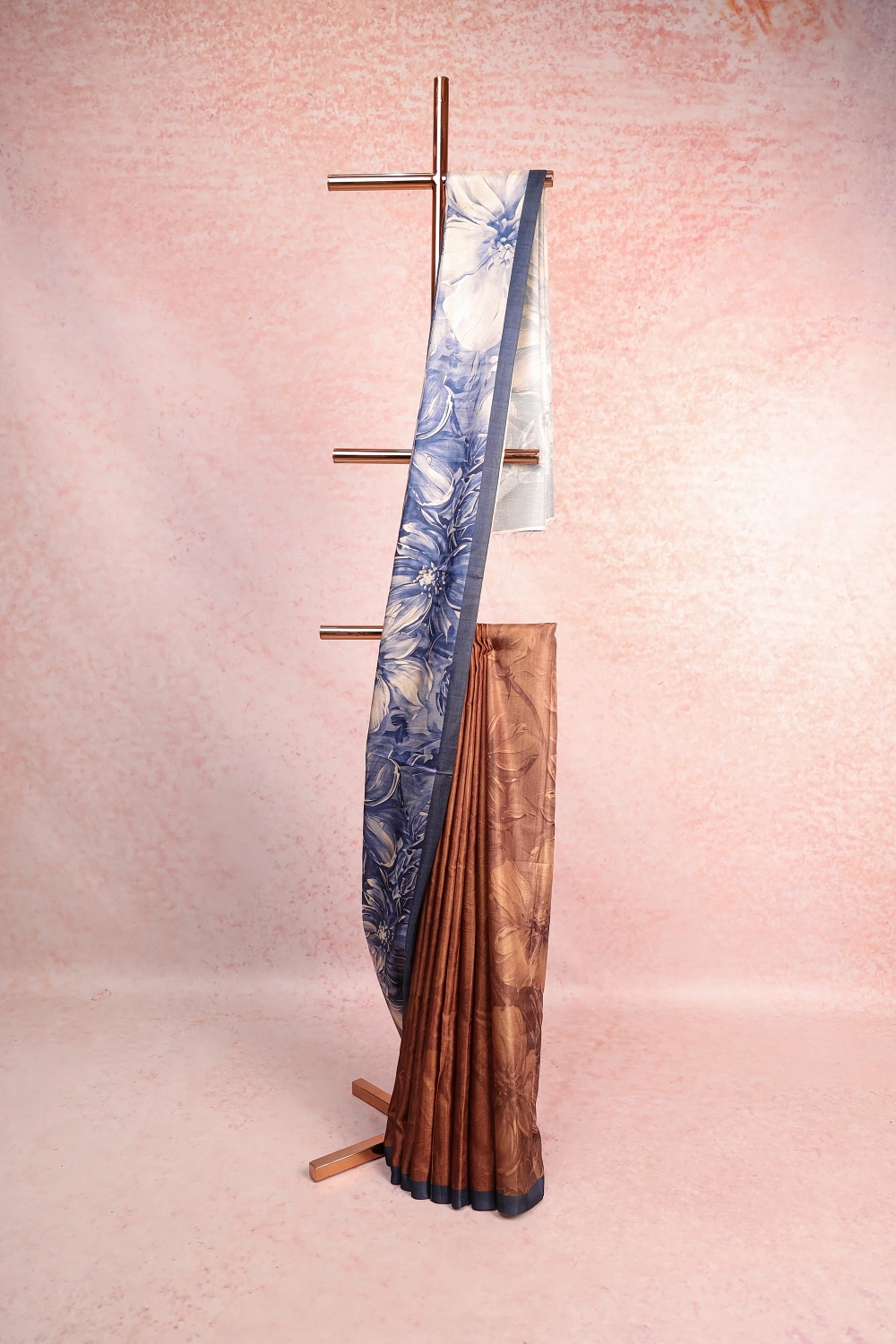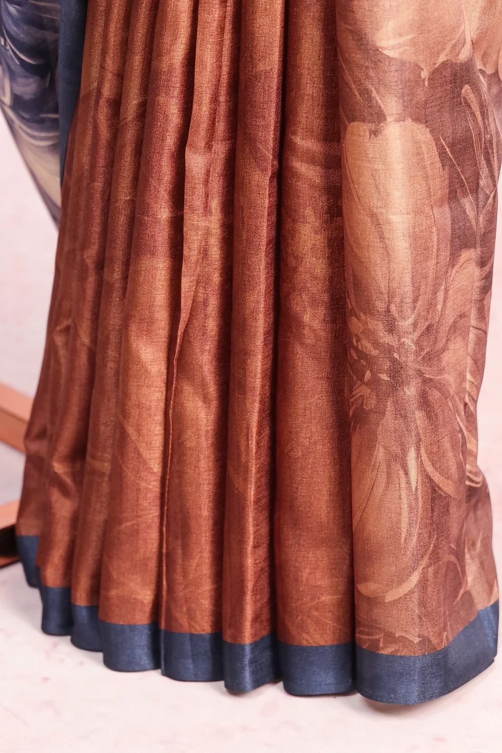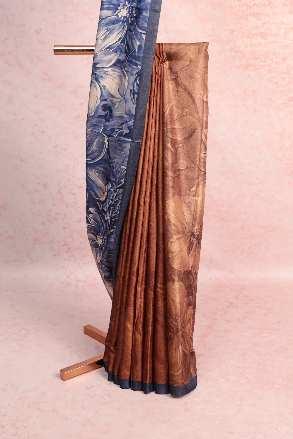 Blue Semi Tussar Printed Saree with Plain Border. Includes Unstitched Blouse
