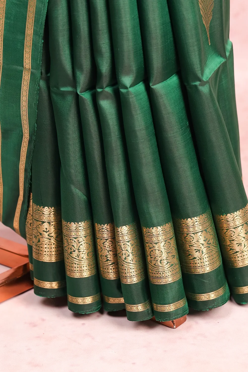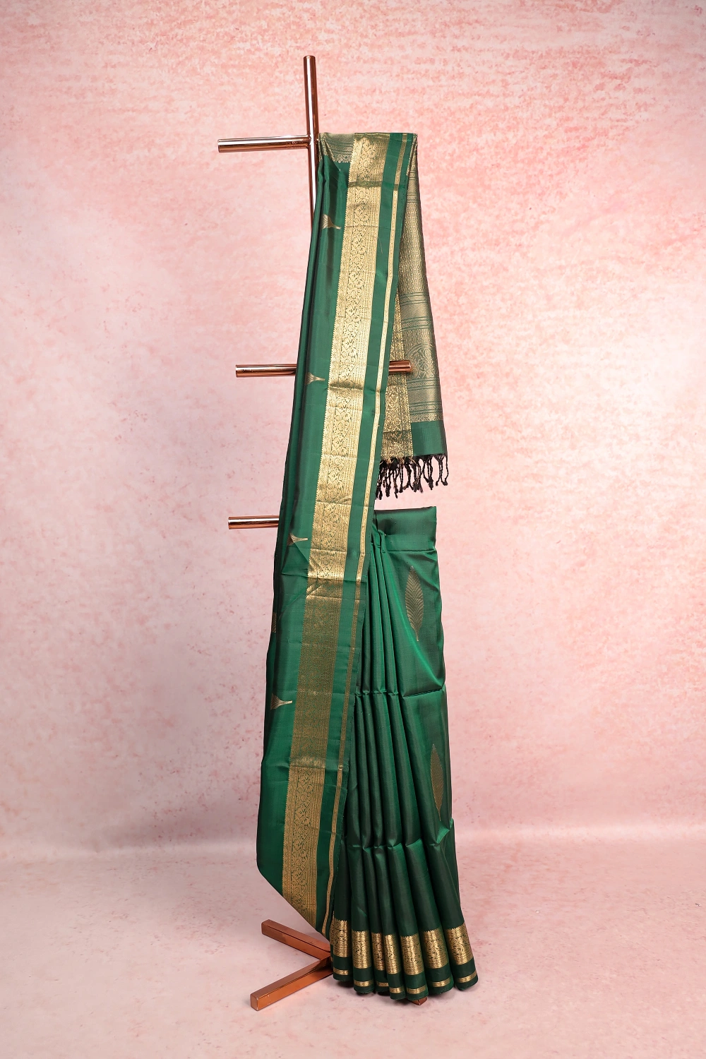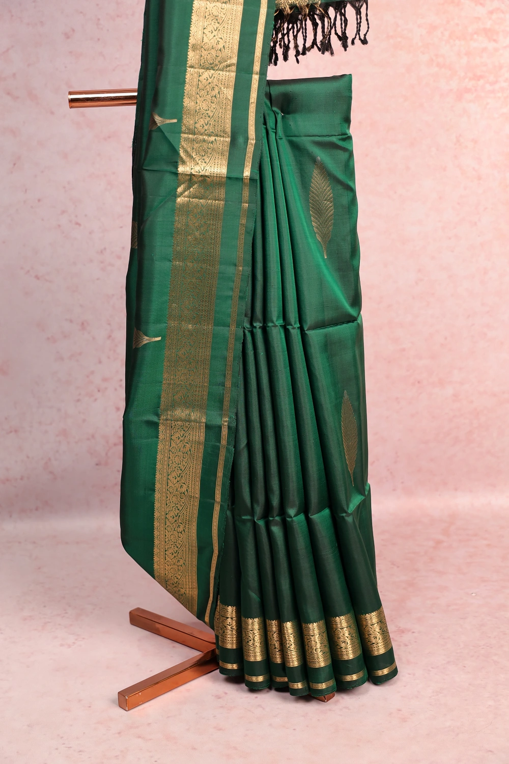 Bottle Green Kanchi Soft Silk Leaf Butta Saree with Designer Border. Includes Unstitched Blouse