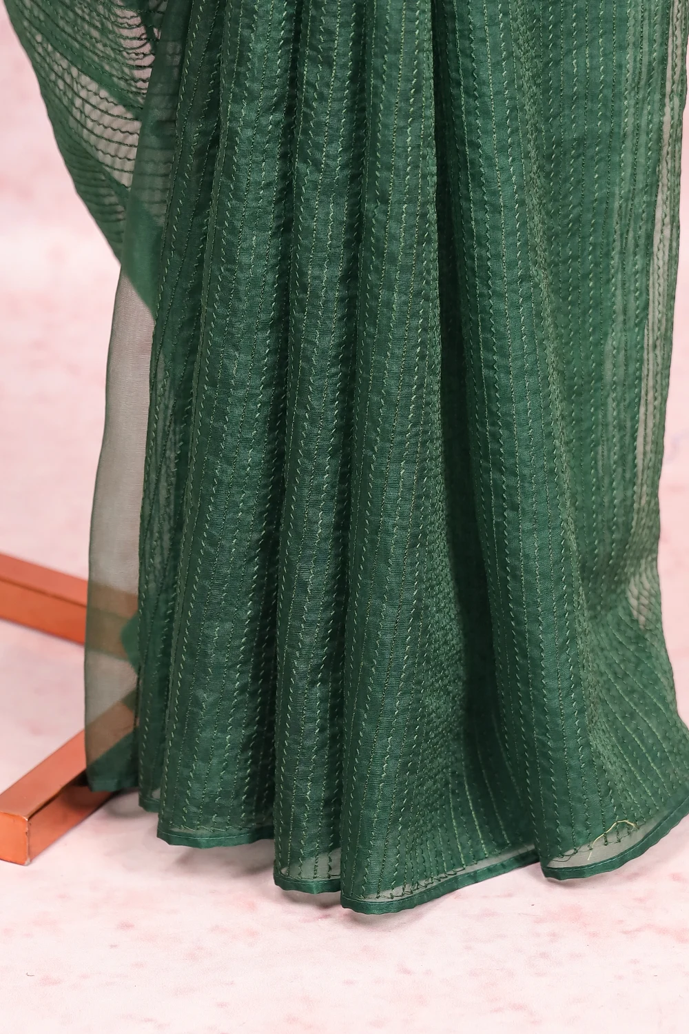 Bottle Green Organza Thread Work Saree Without Border. Includes Unstitched Blouse