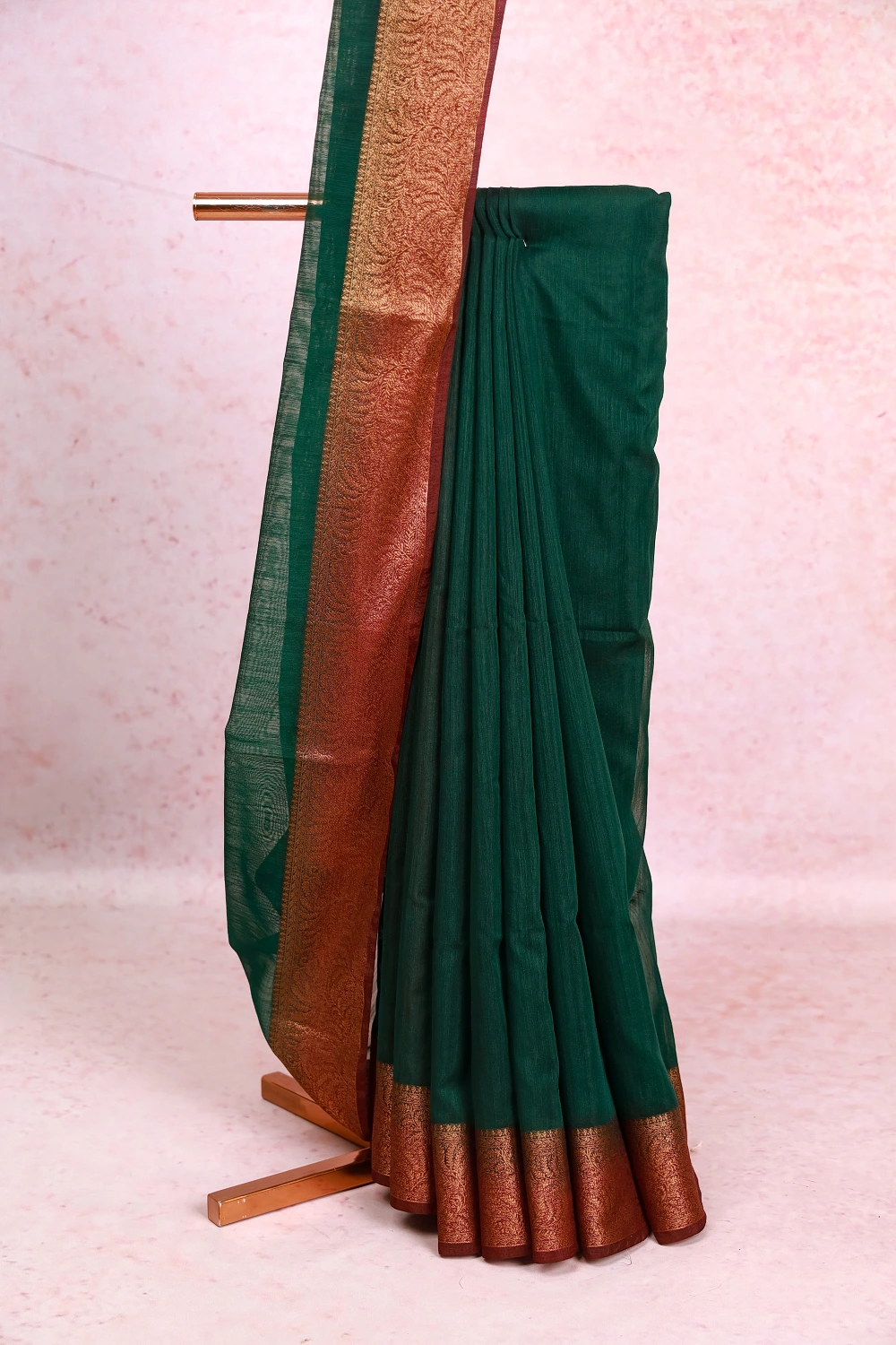Bottle Green Semi Jute Plain Body Saree with Zari Border. Includes Unstitched Blouse