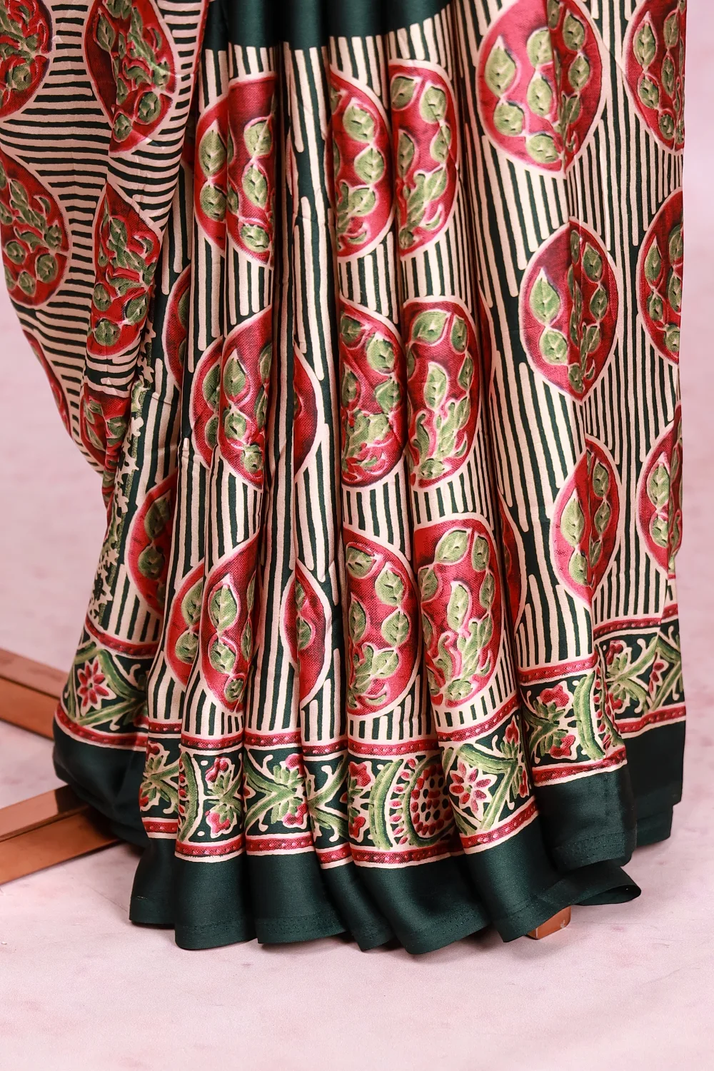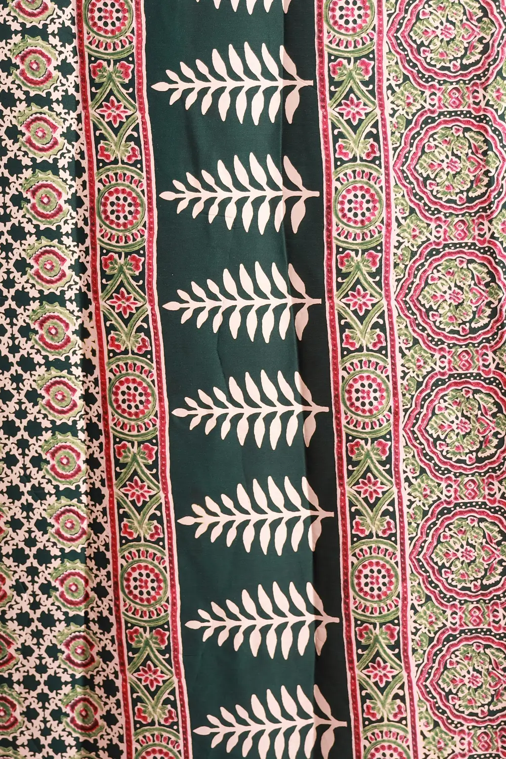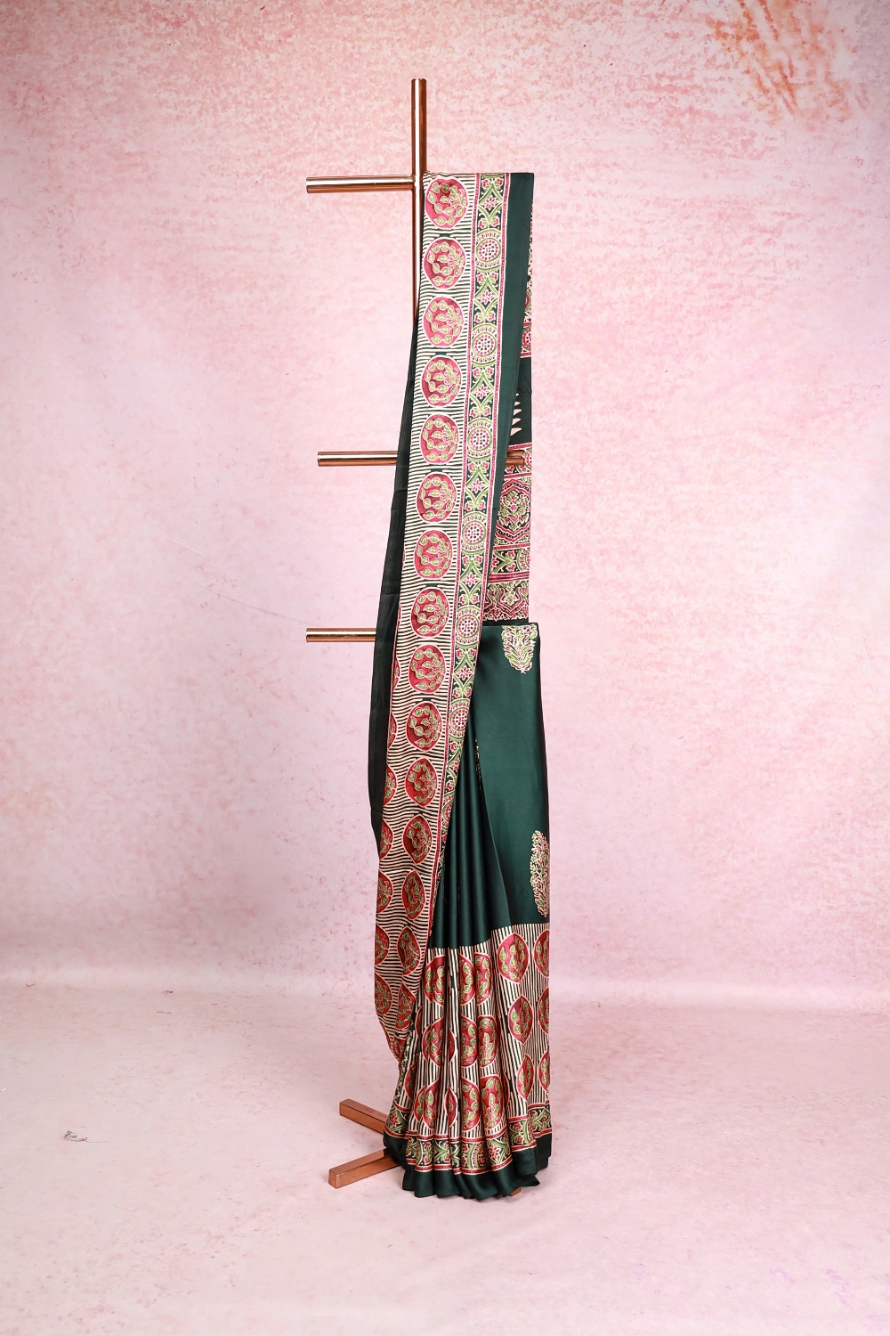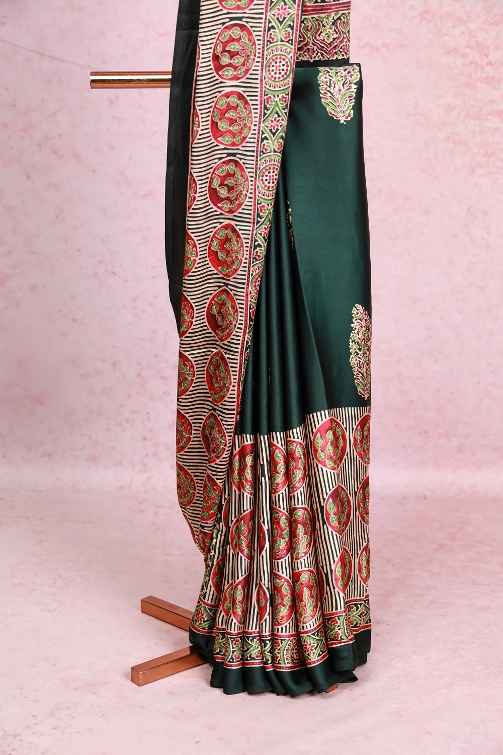 Bottle Green Semi Modal Ajrakh Printed Saree With Large Border. Includes Un Stitched Blouse