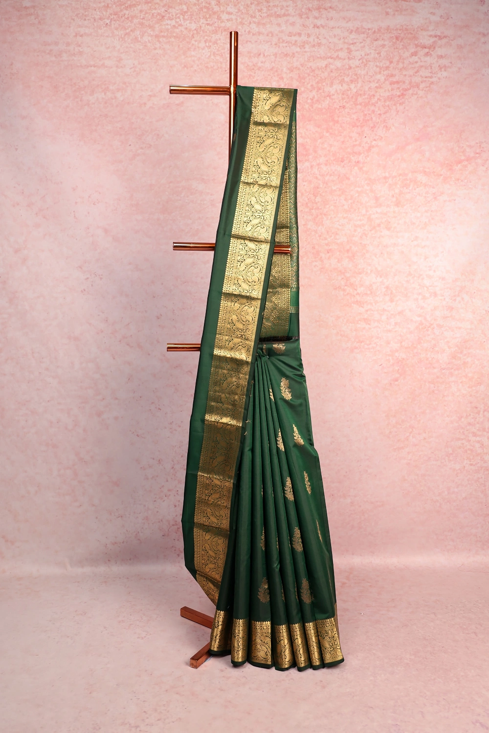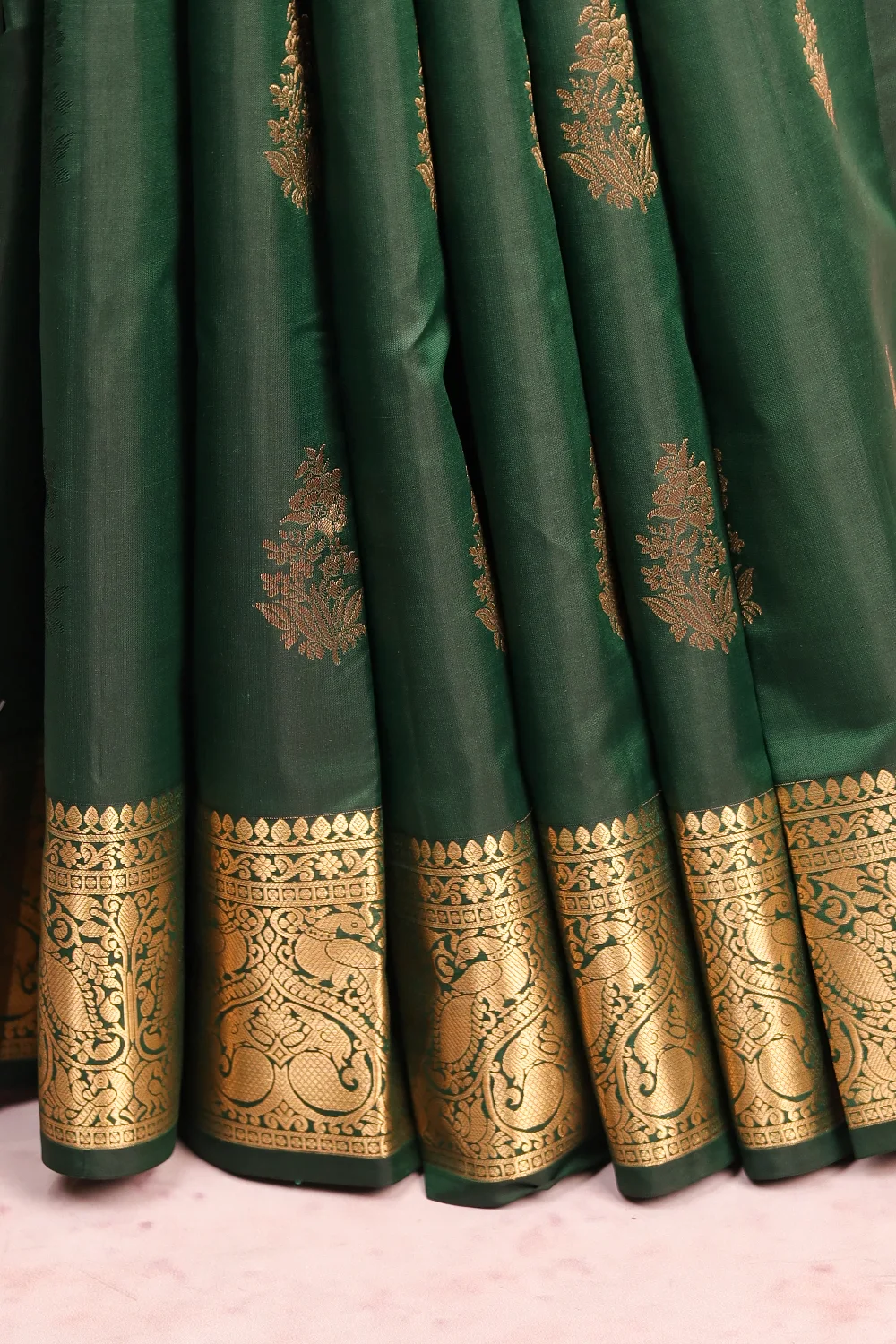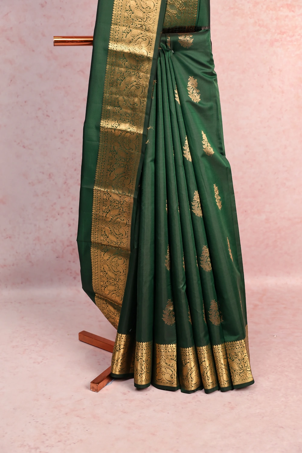 Bottle Green Traditional Kancheepuram Soft Silk Butta Saree with Designer Border. Includes Unstitched Blouse