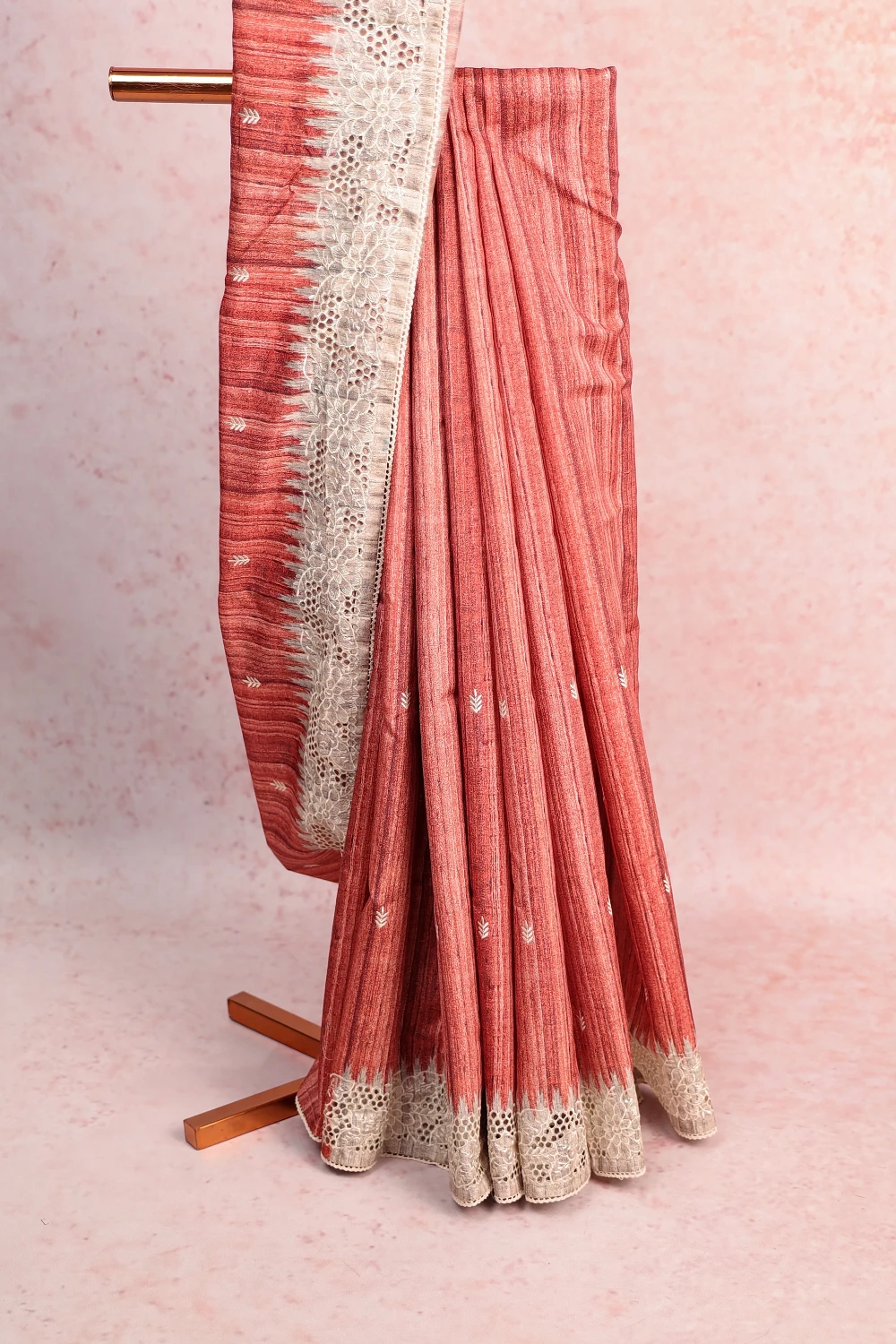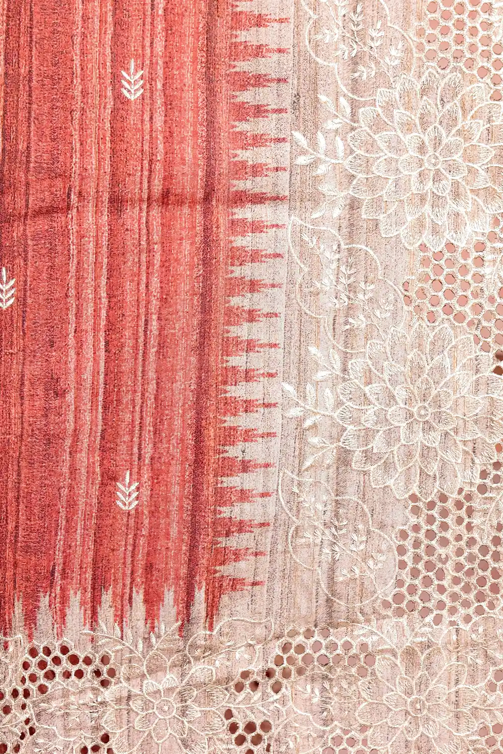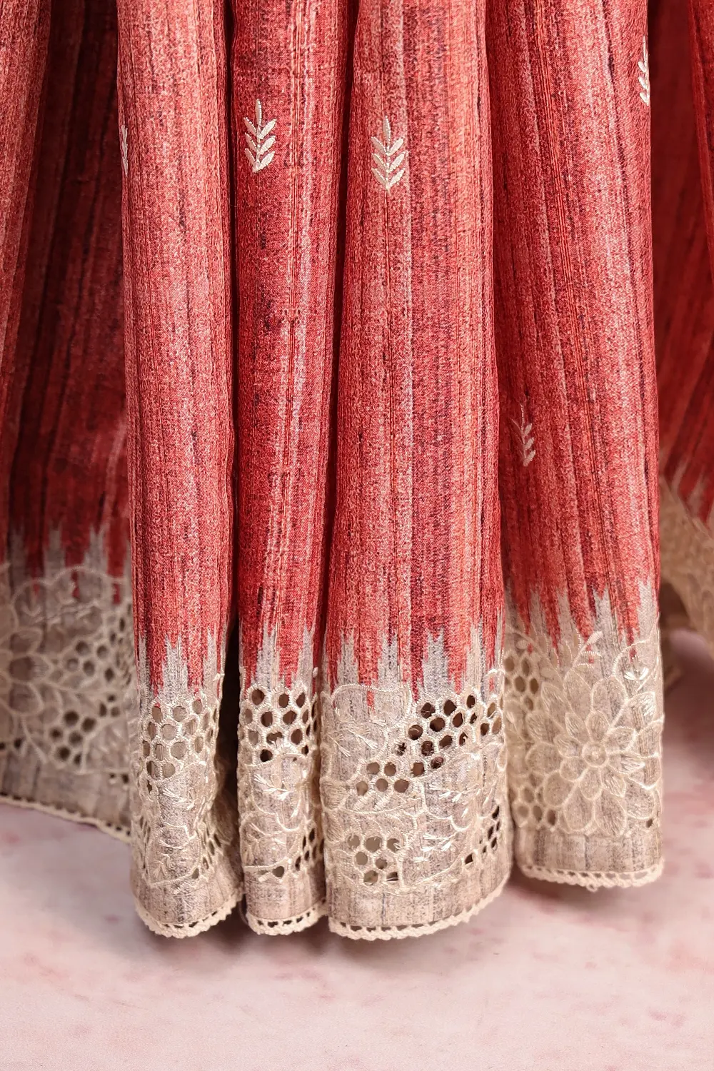 Brick Color Semi Tussar Plain Body Saree with Cutt Work Border. Includes Un stitched Blouse