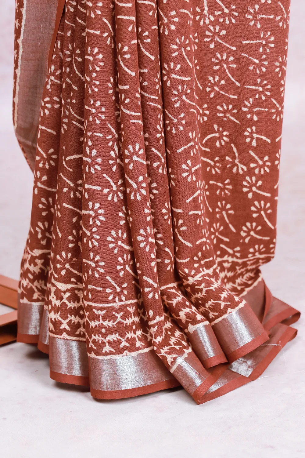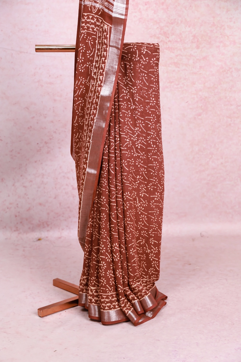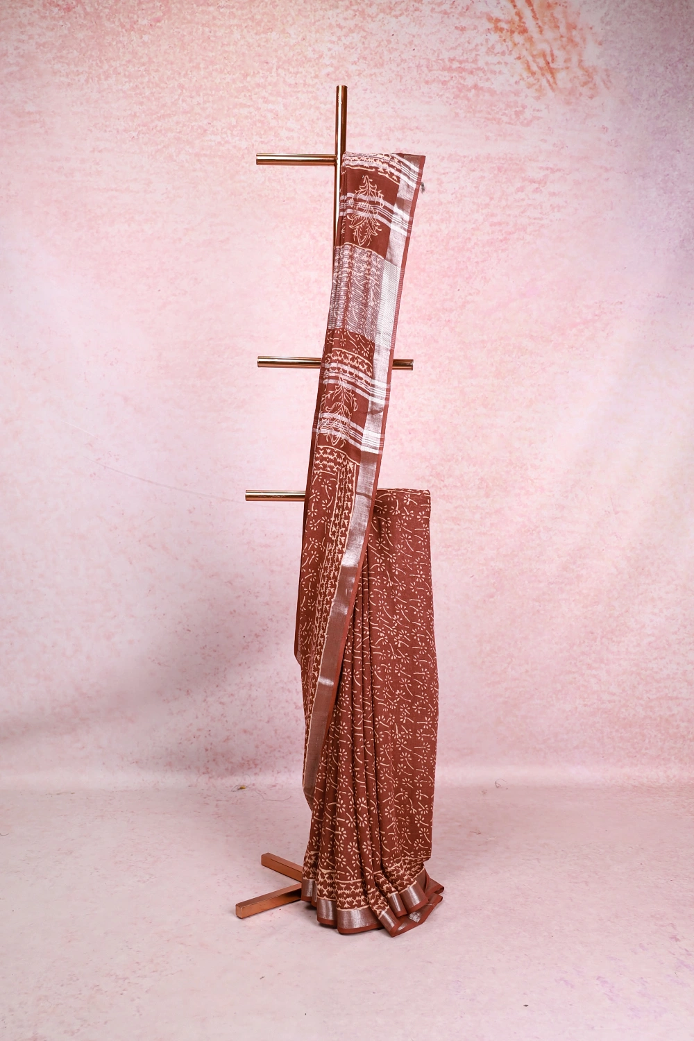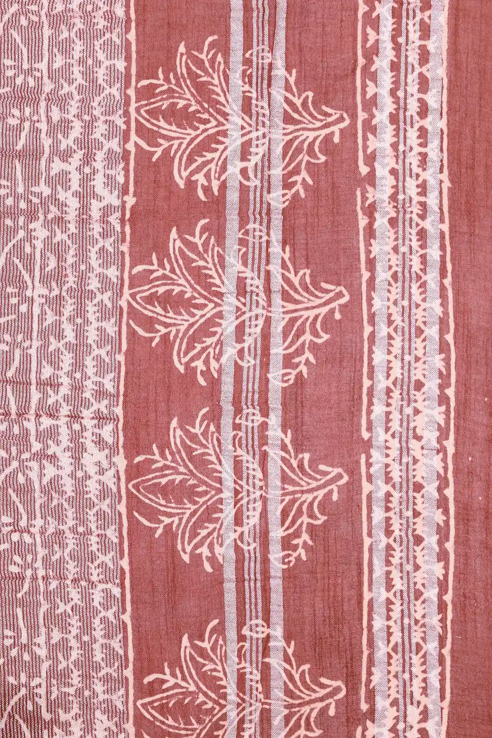 Brown Chanderi Cotton Printed Saree with Small Border. Includes Unstitched Blouse