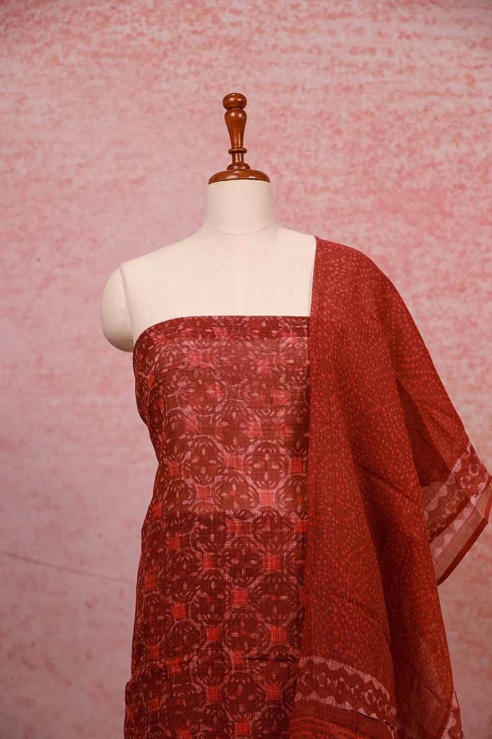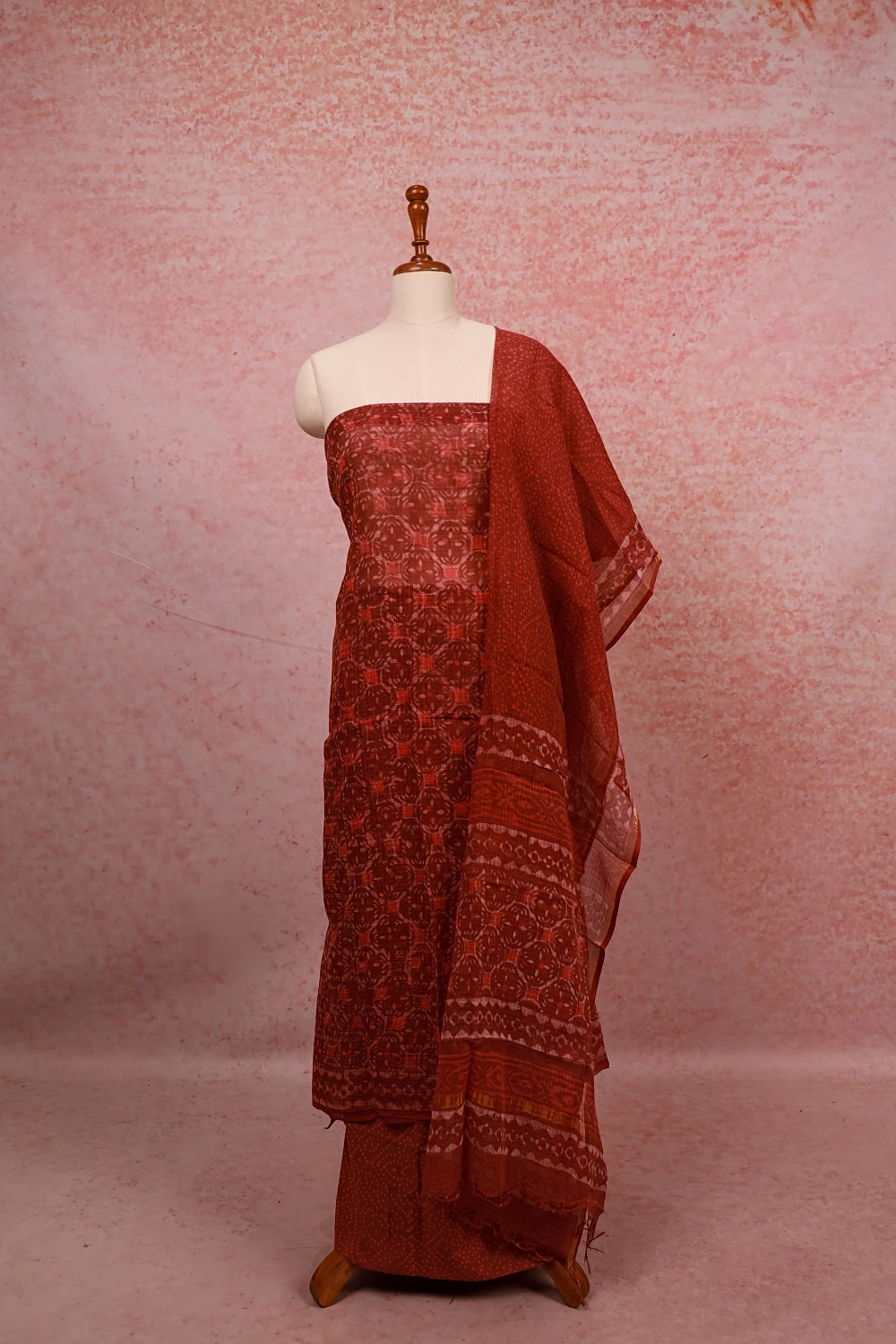Brown Net Kota Printed Unstitched Churidar Material. Includes Dupatta.