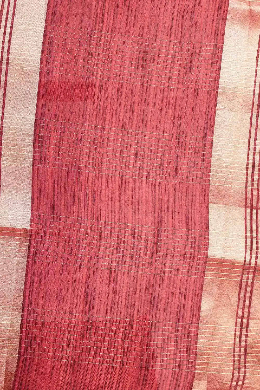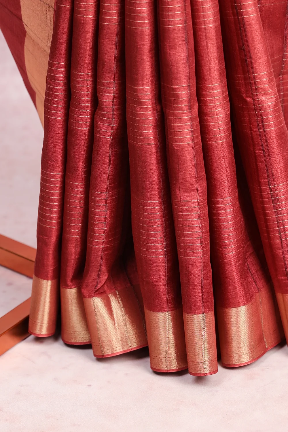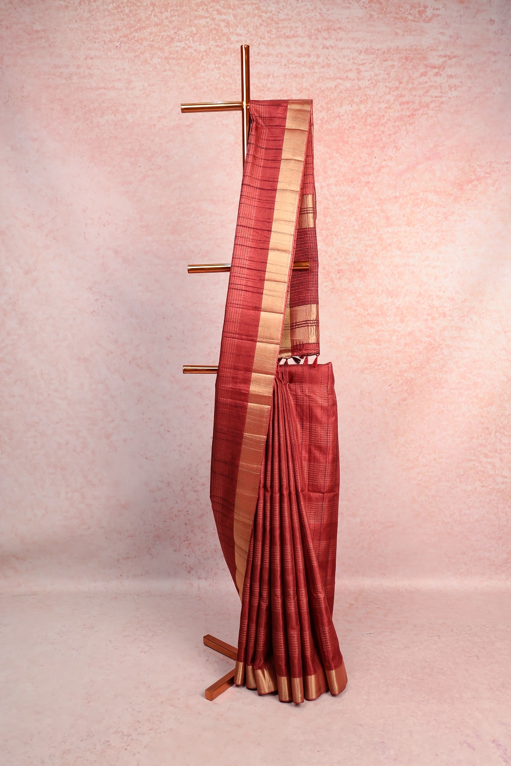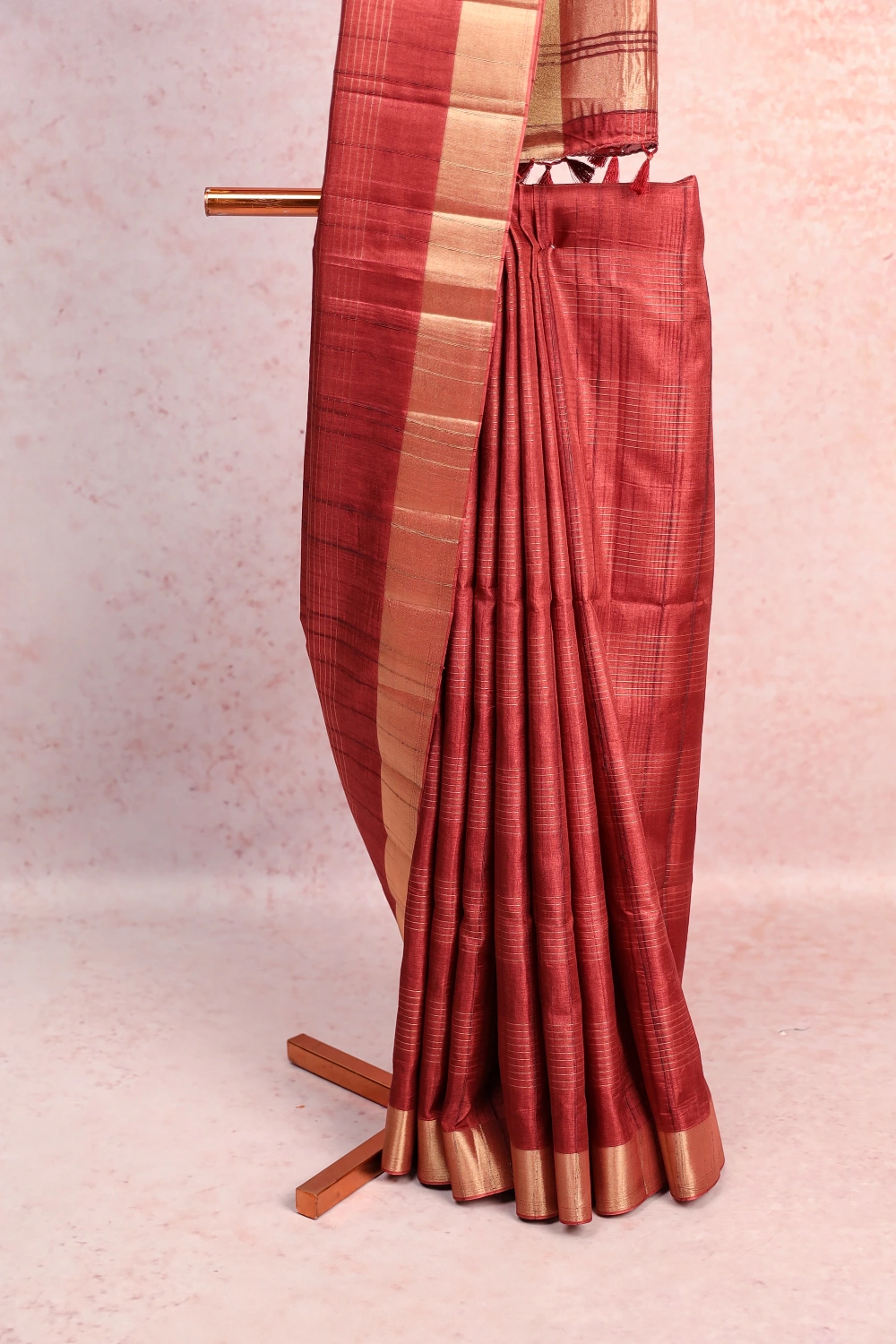 Brown Semi Jute Self Check Saree With Golden Border. Includes Un Stitched Blouse