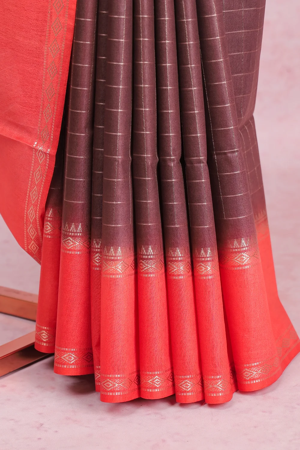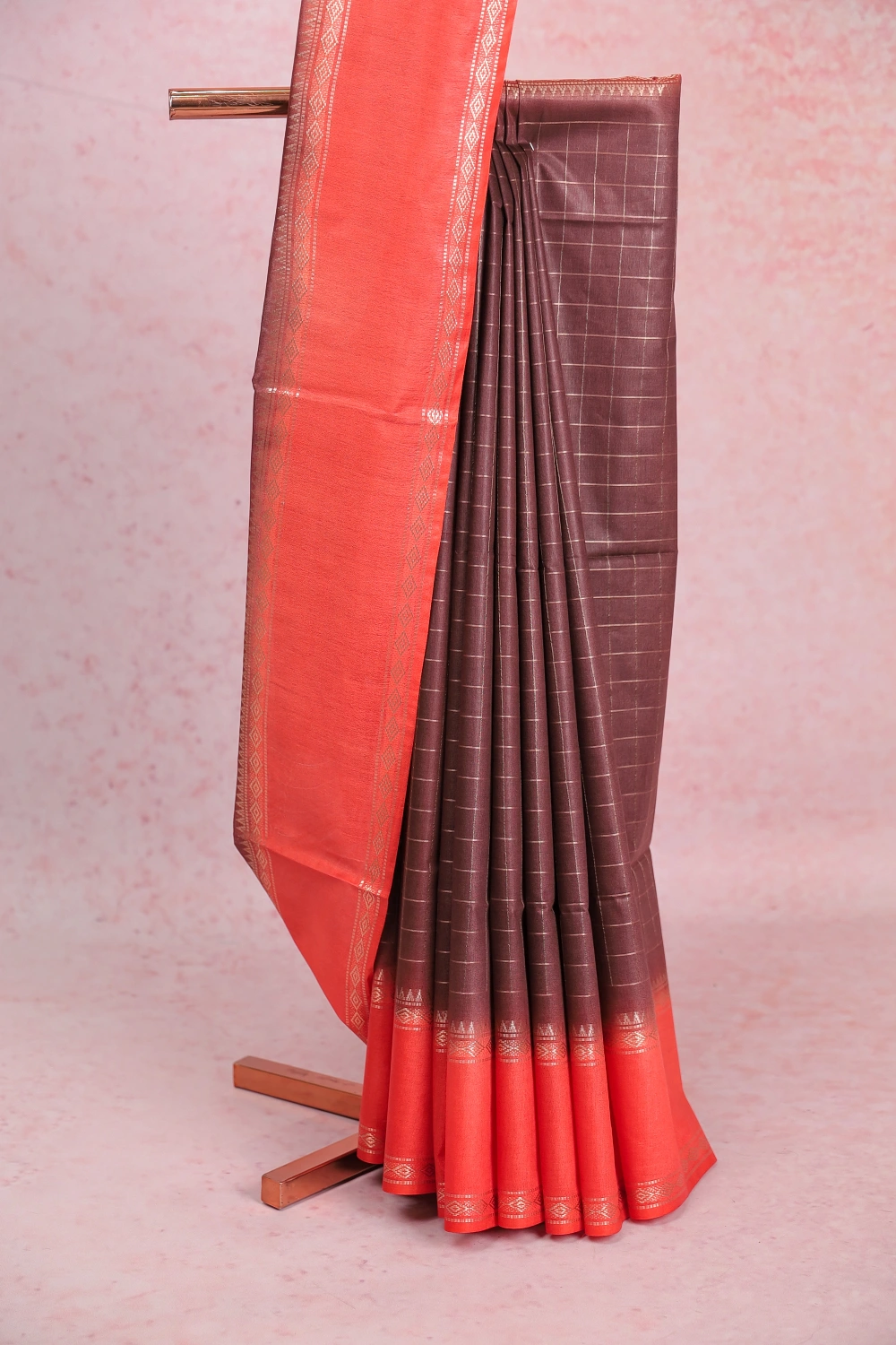 Brown Semi Tussar Check Saree with Small Border. Includes Unstitched Blouse