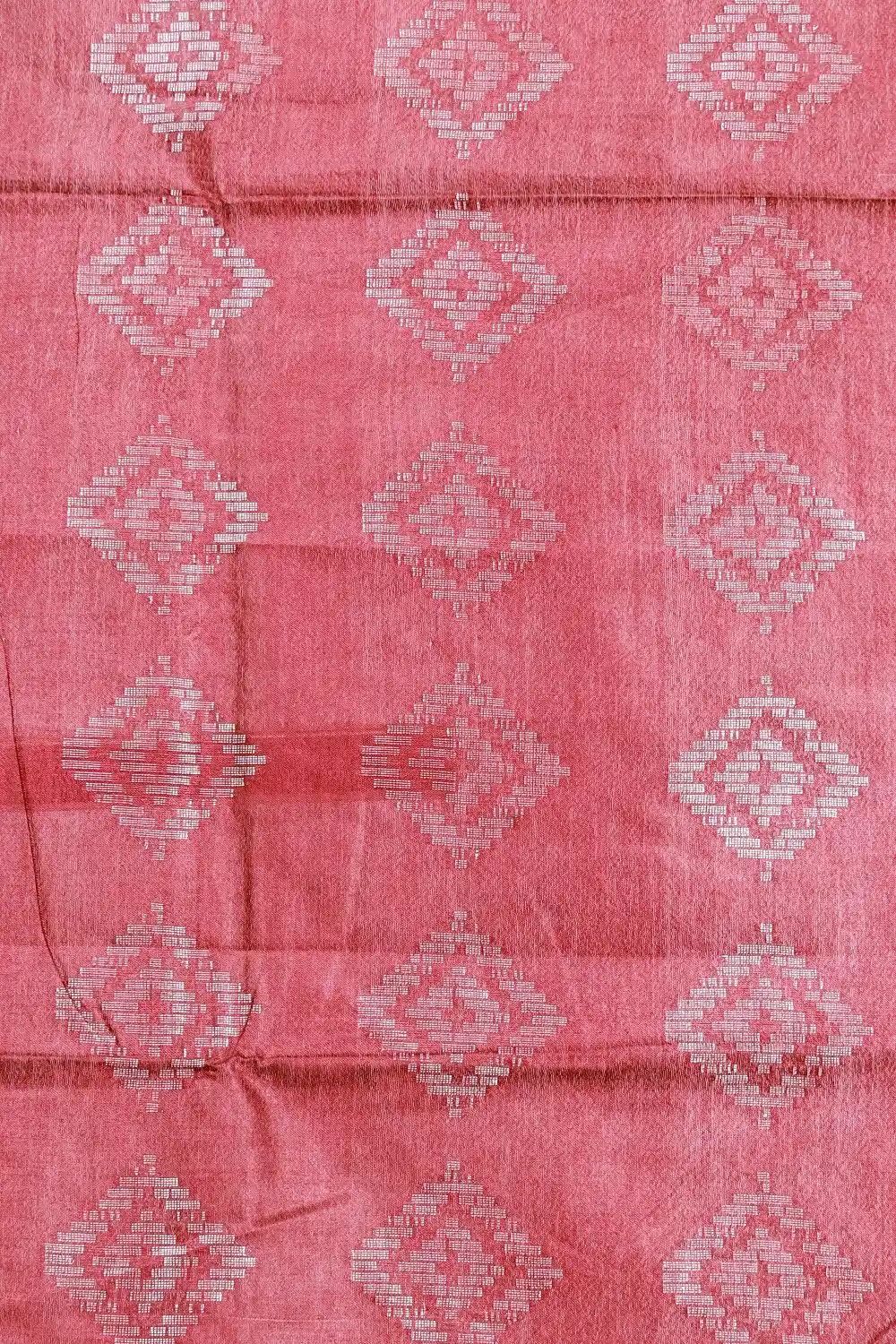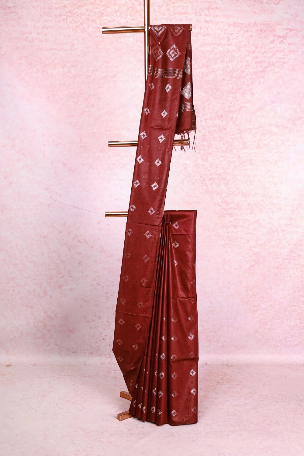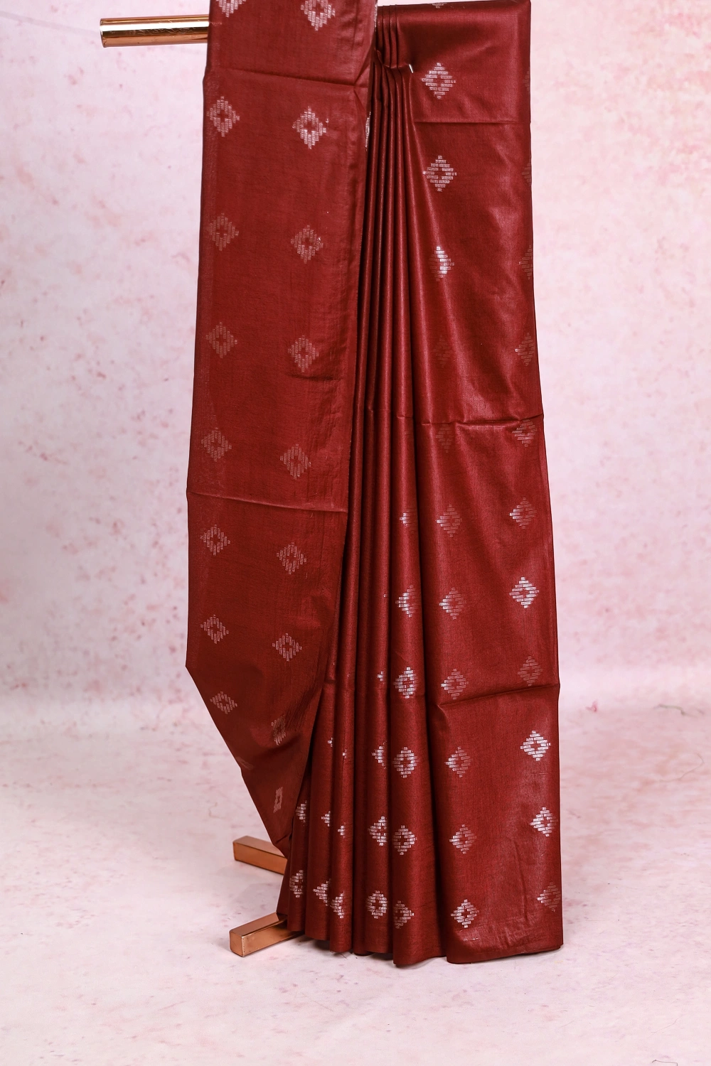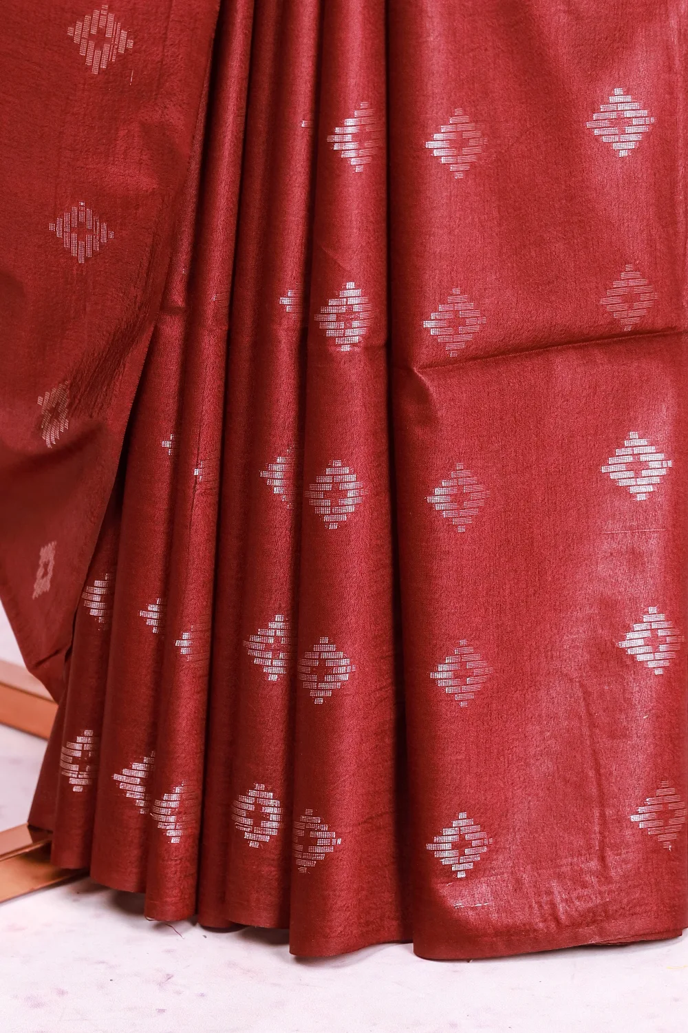 Burgundy Semi Tussar Silver Butta Saree Without Border. Includes Un Stitched Blouse