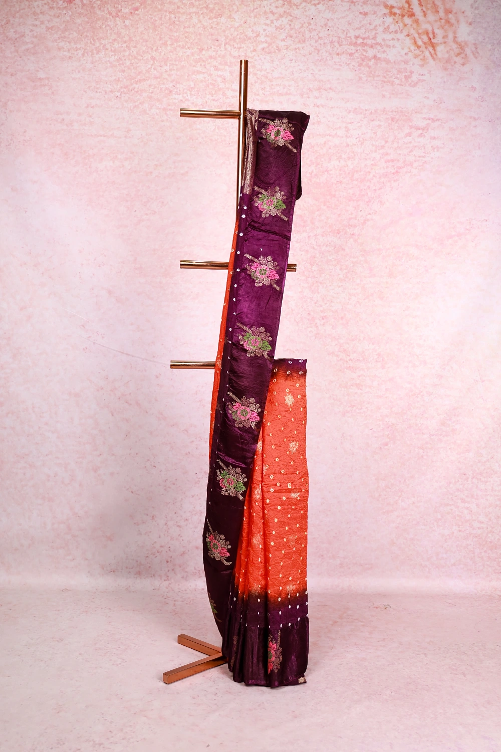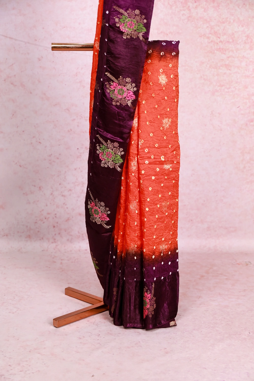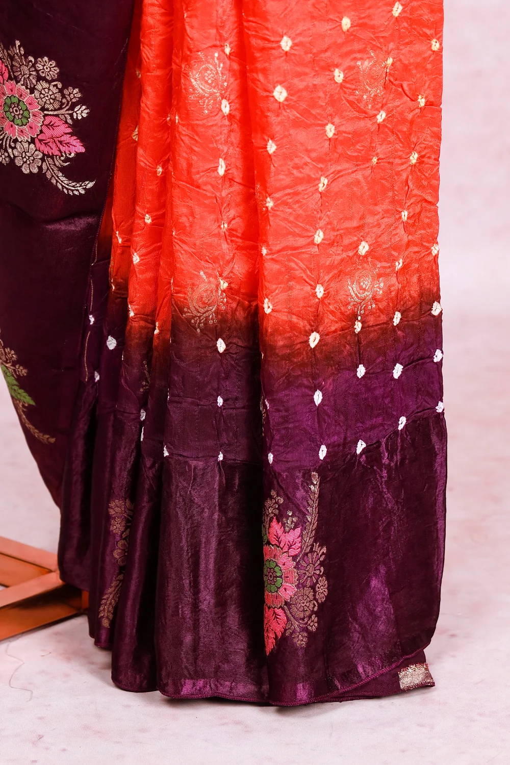 Carrot Orange Chunghadi Floral Printed With Zari Butta Saree With Zari Border. Includes Un Stitched Blouse
