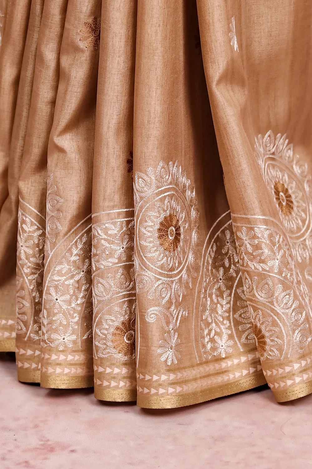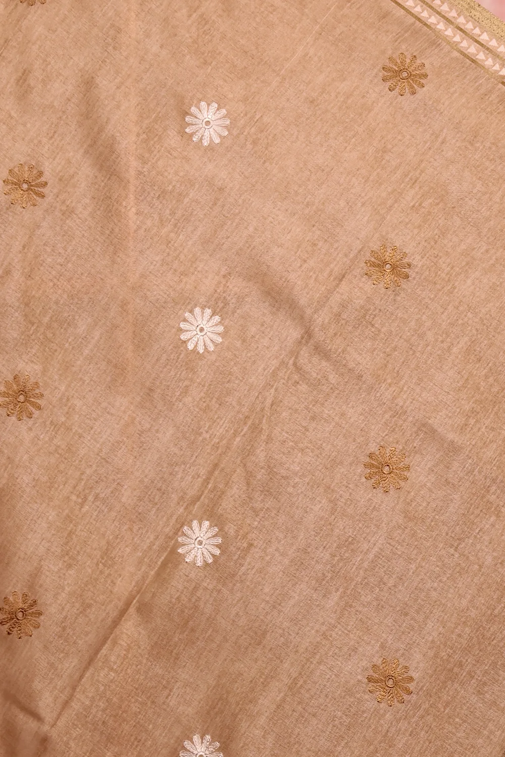 Chikku Color Semi Tussar Plain Body Saree with Thread Border. Includes Unstitched Blouse.