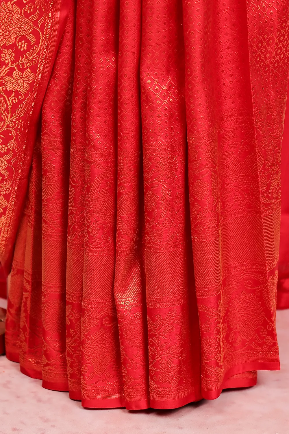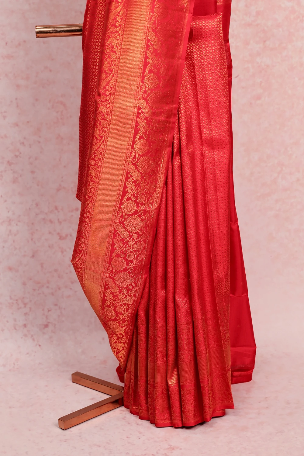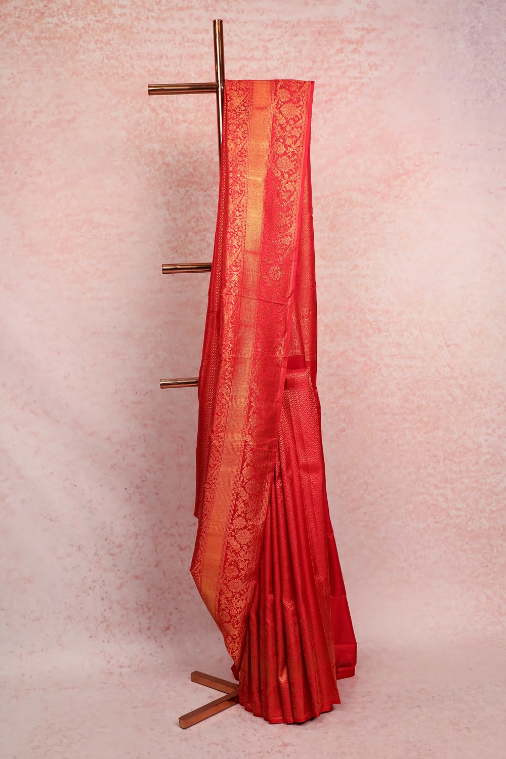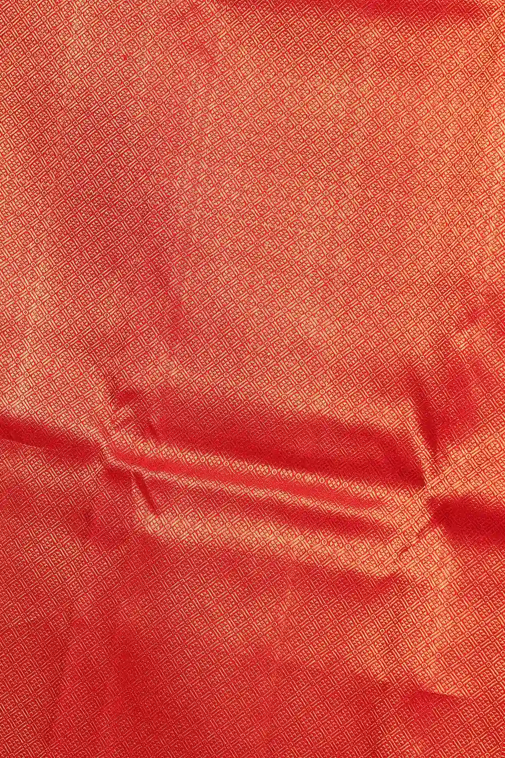 Chilly Red Kancheepuram Silk Brocade Saree with Designer Border. Includes Unstitched Blouse