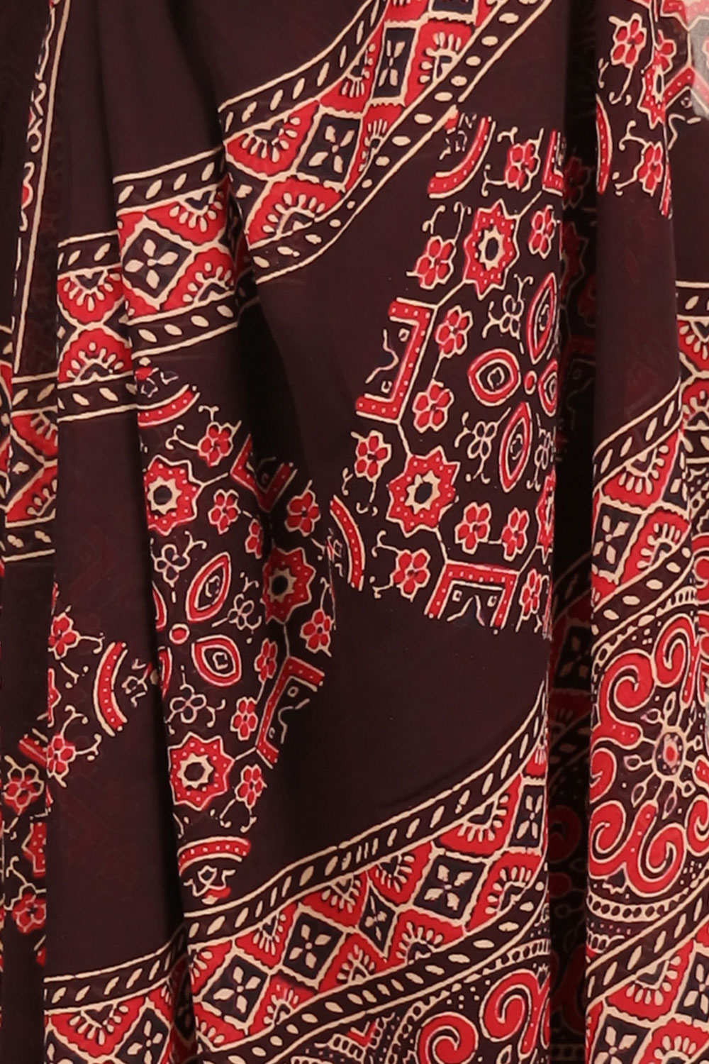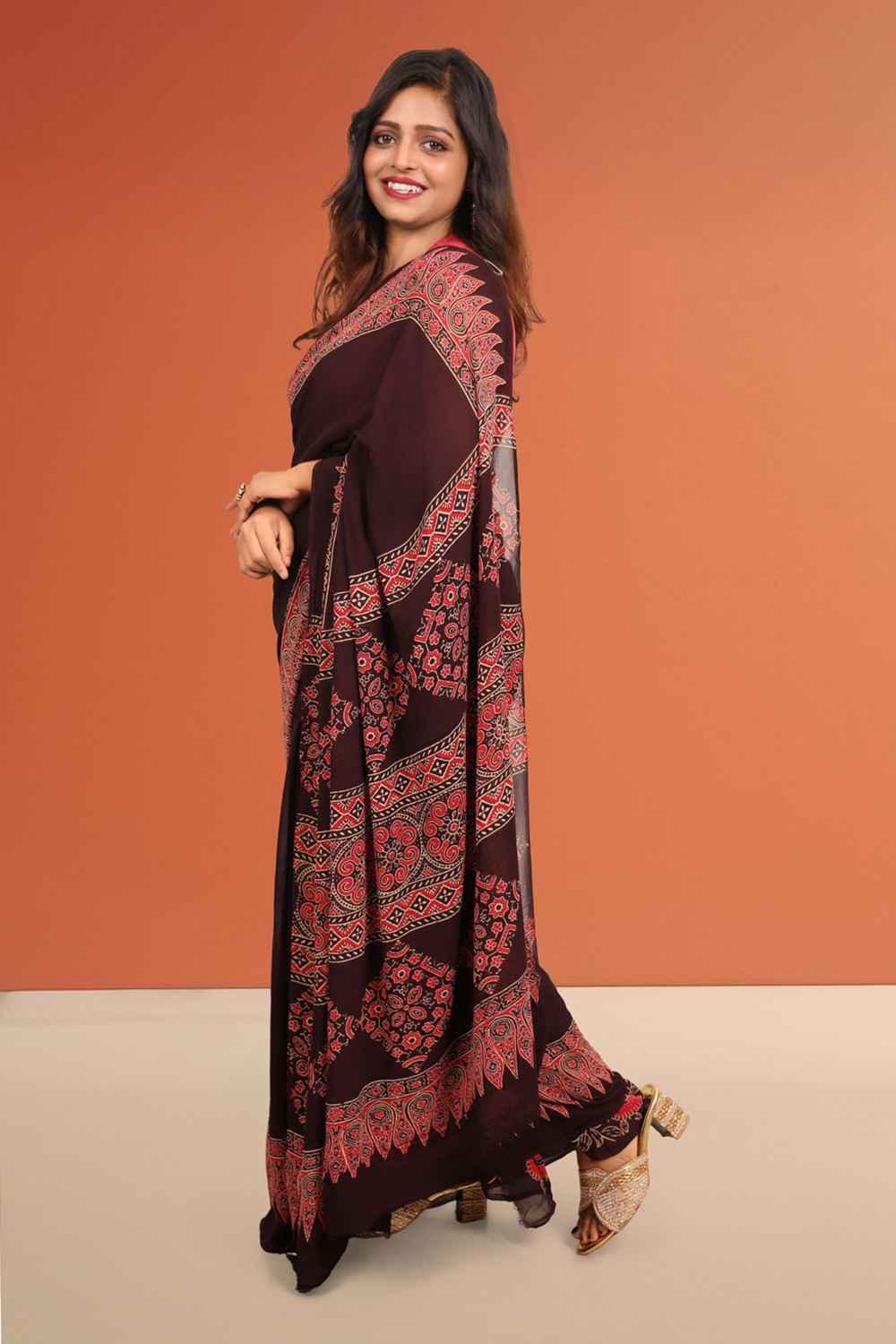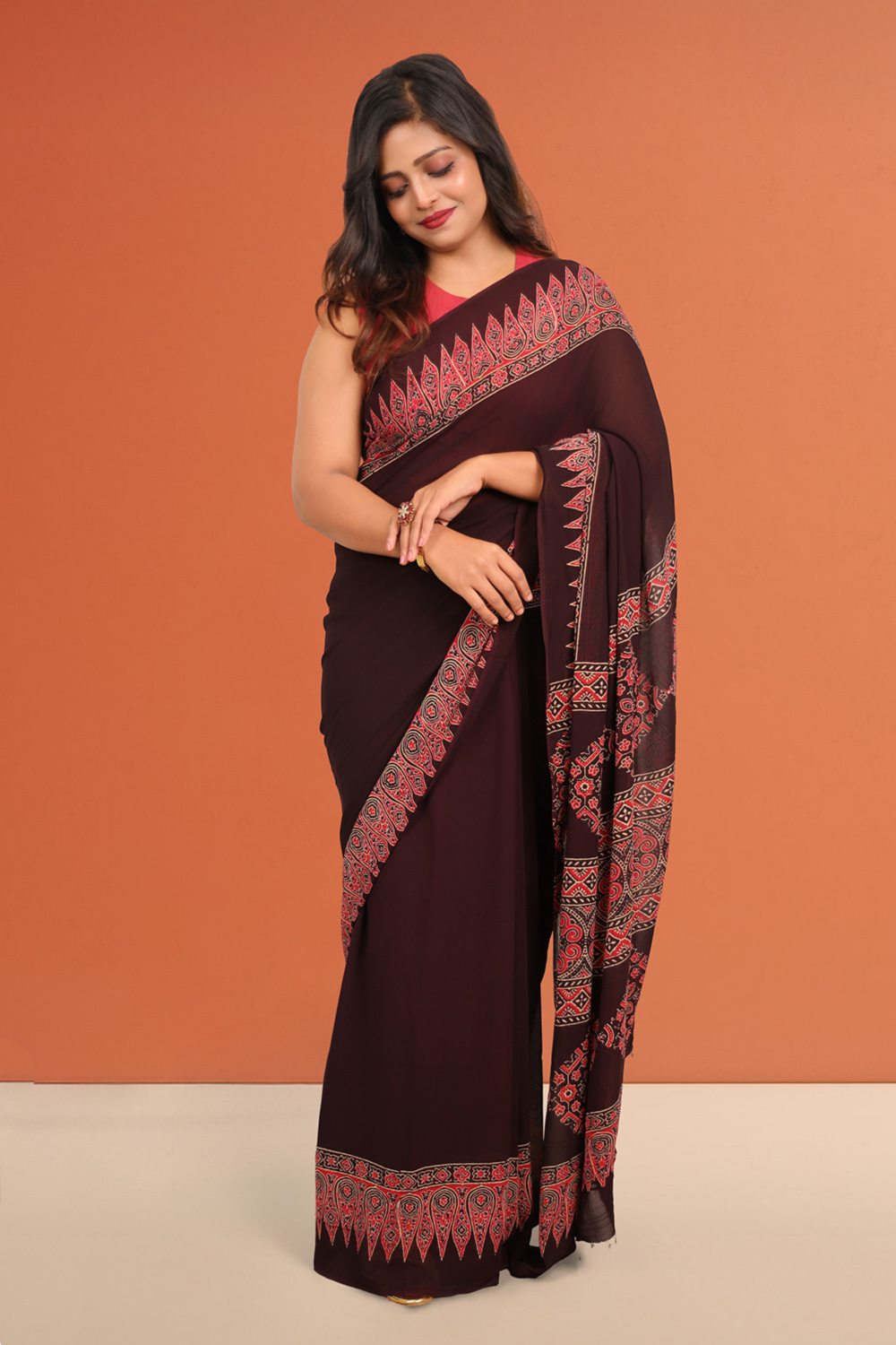 Coffee Brown Crepe Plain Body Saree with Printed border. Includes Unstitched Blouse