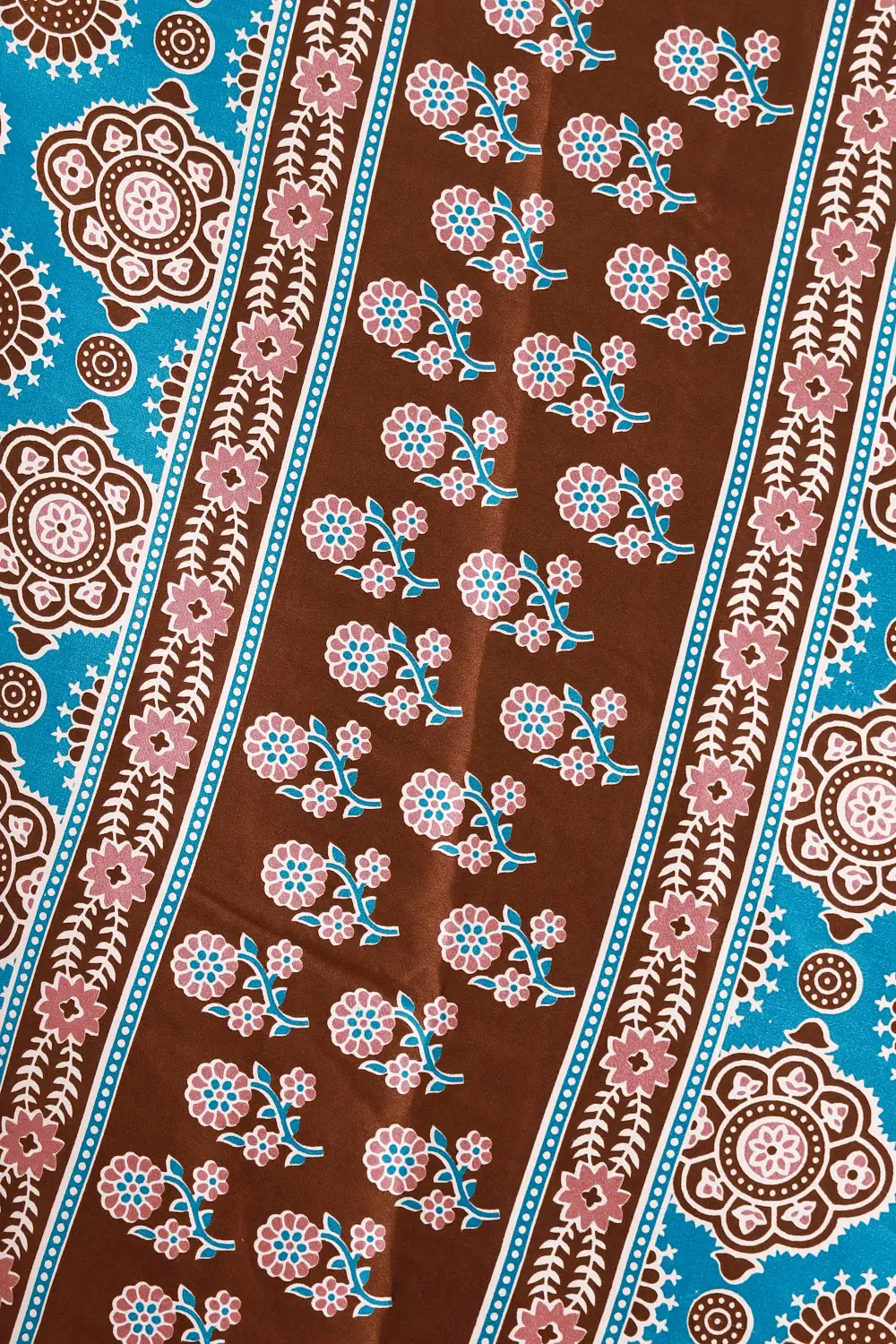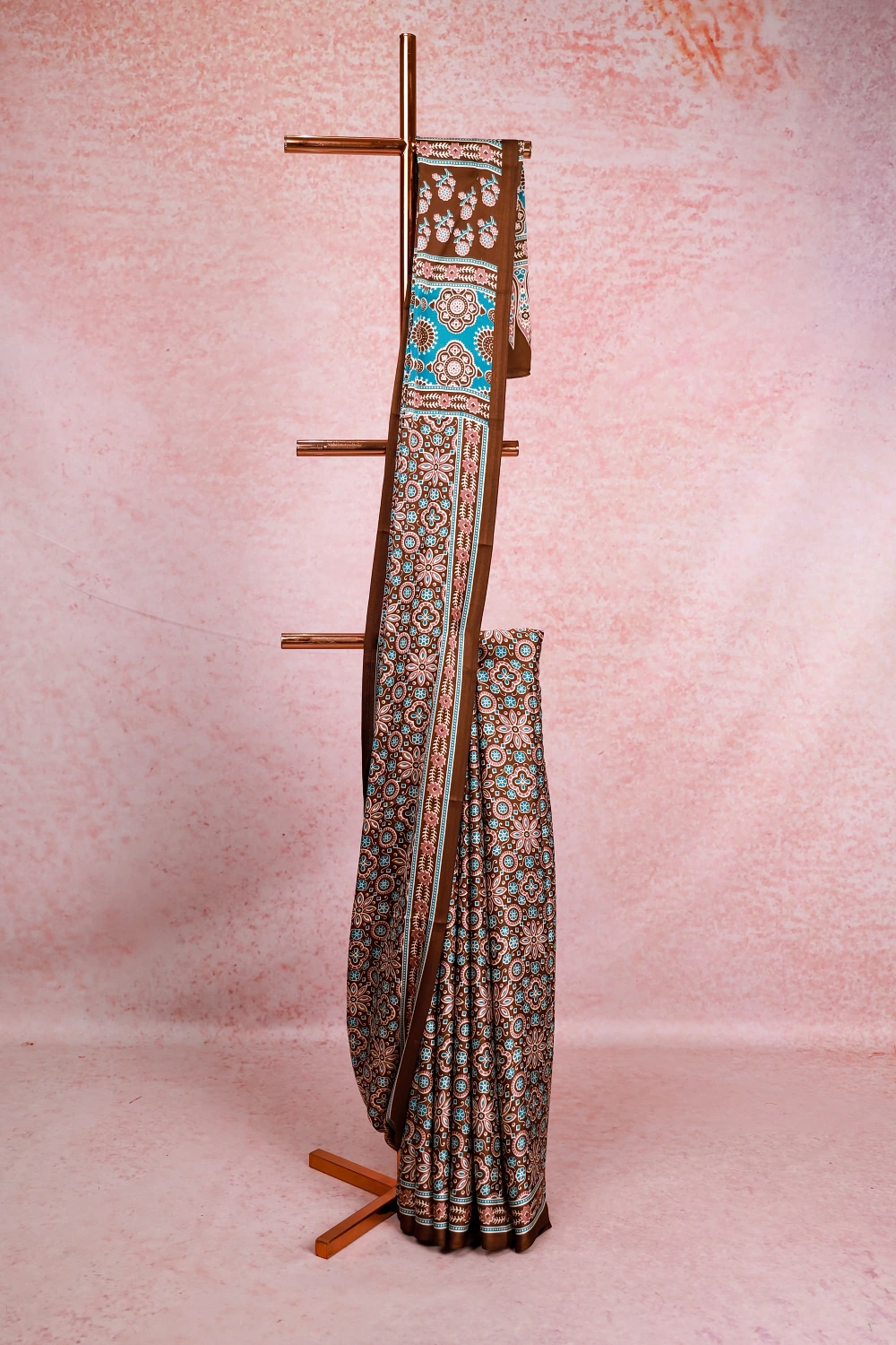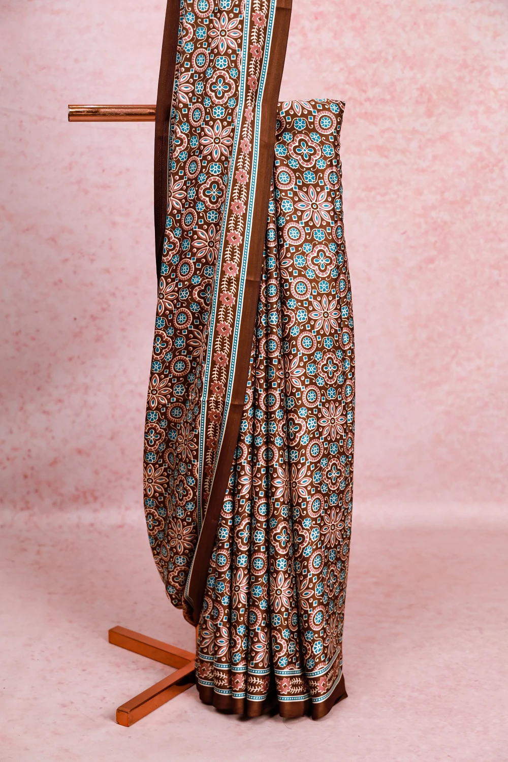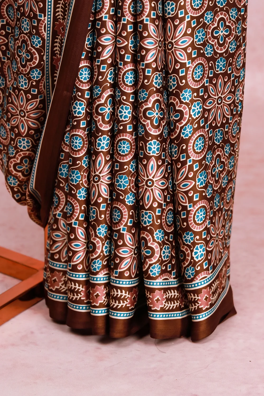 Coffee Brown Semi Modal Ajrakh Printed Saree With Printed Border. Includes Un Stitched Blouse