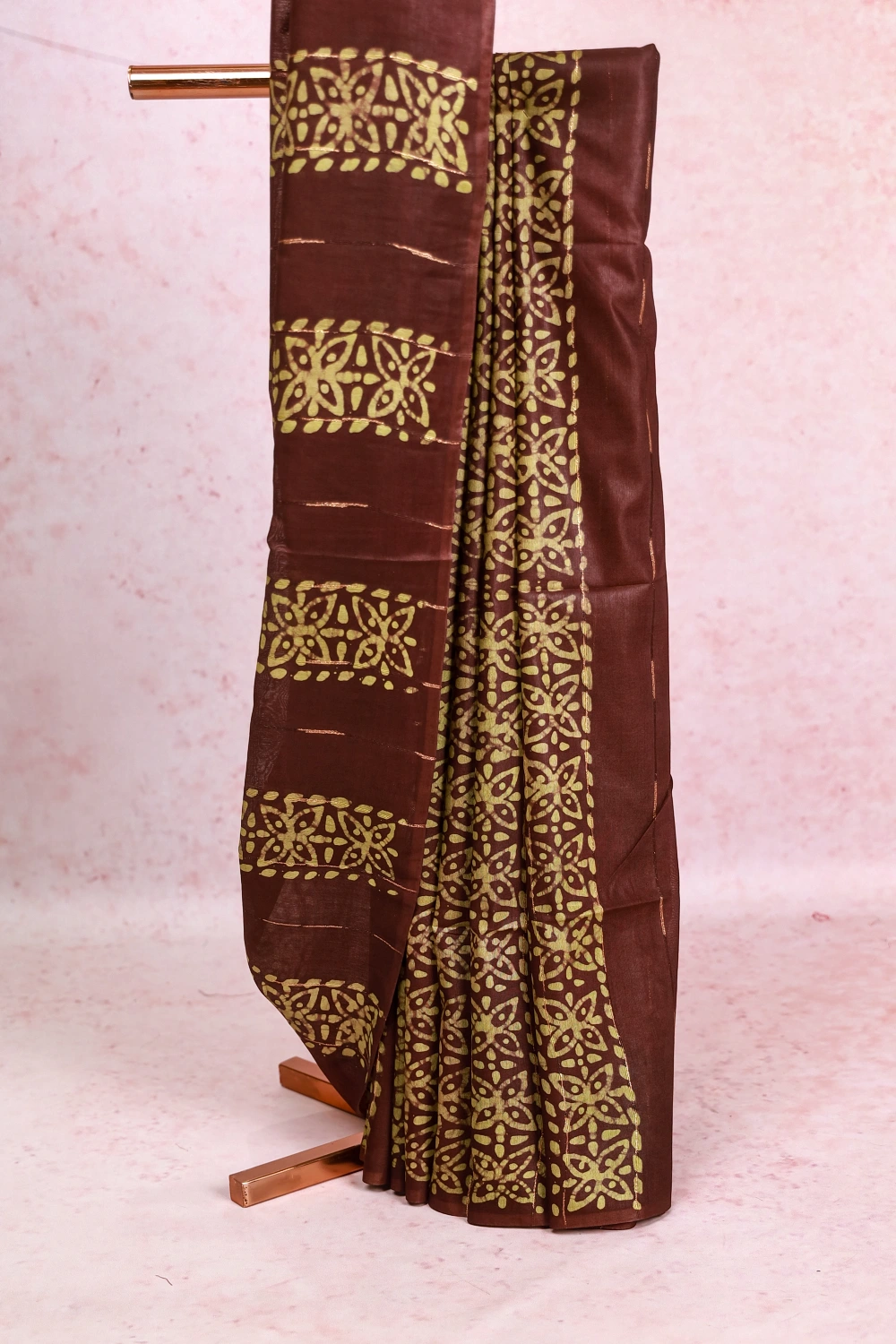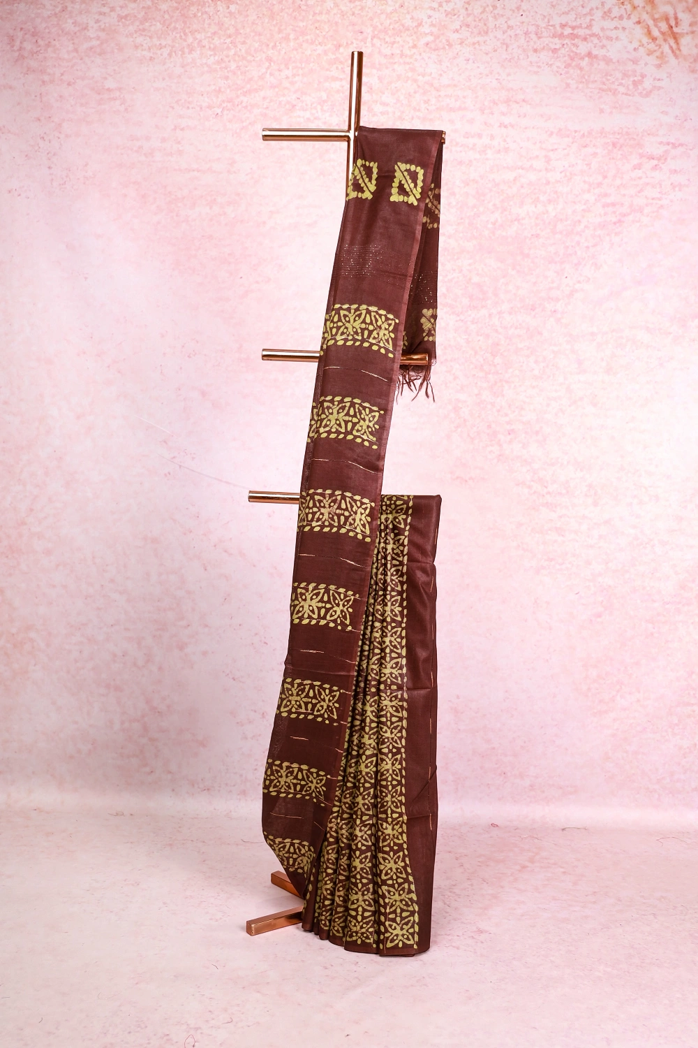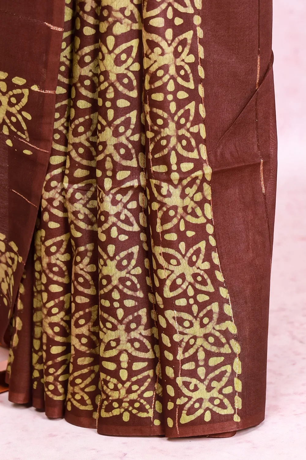 Coffee Brown Semi Tussar Bathik Print Saree With Bathik Border. Includes Un Stitched Blouse